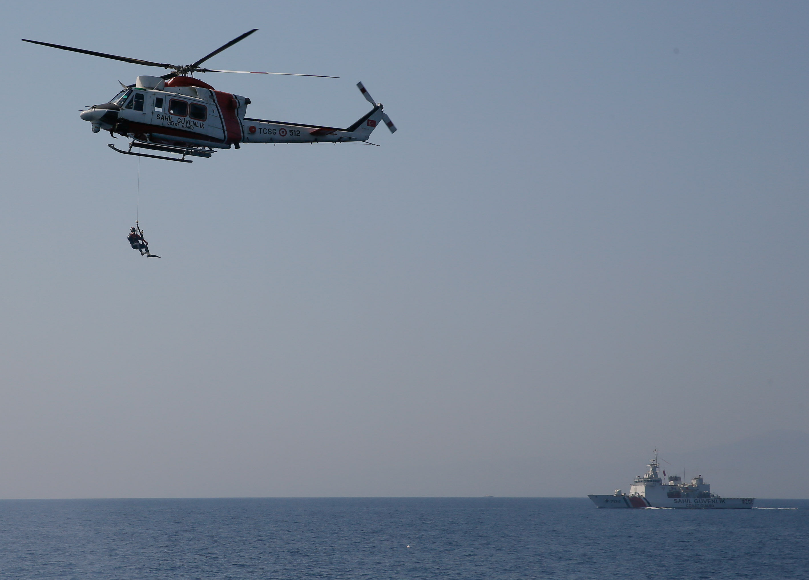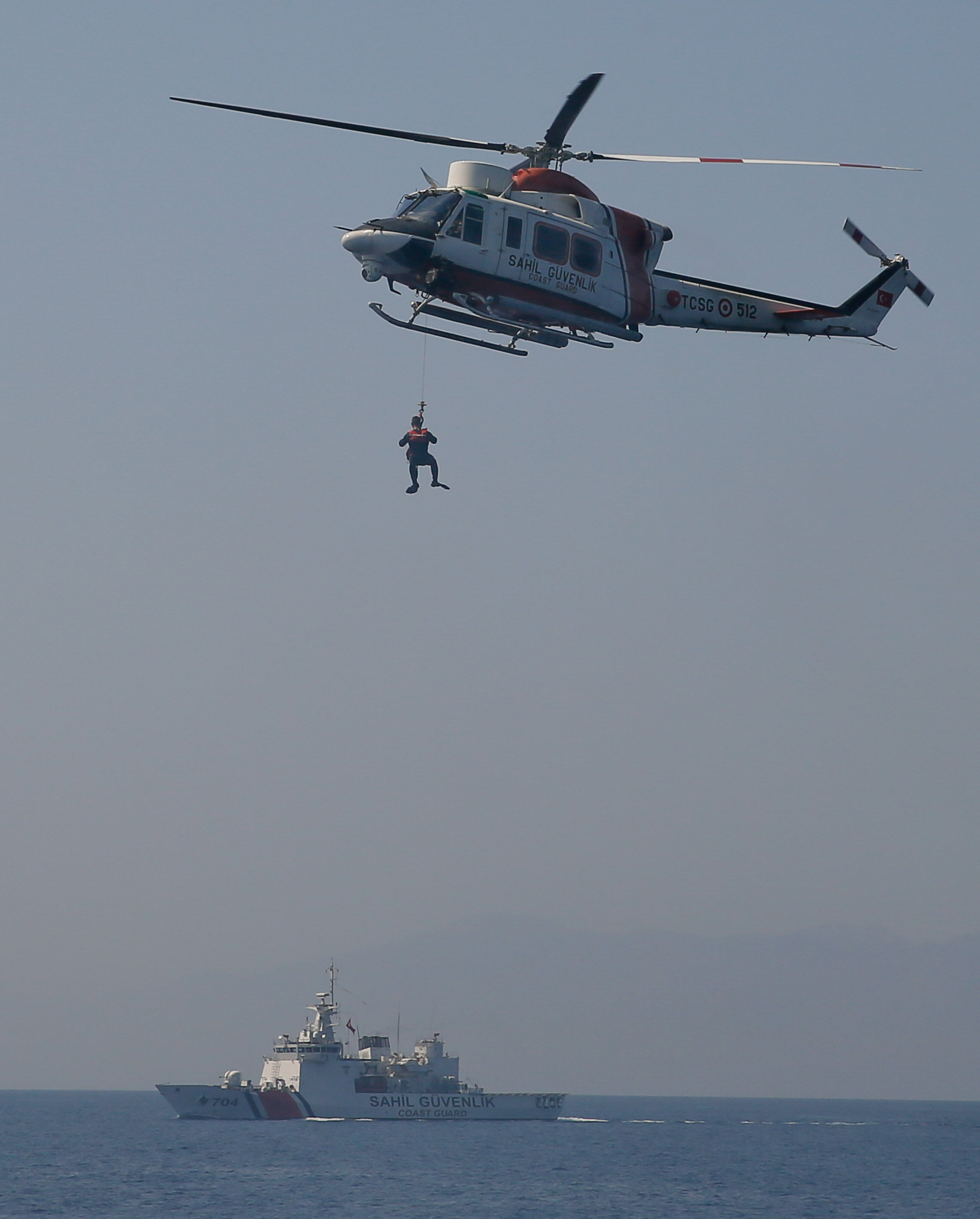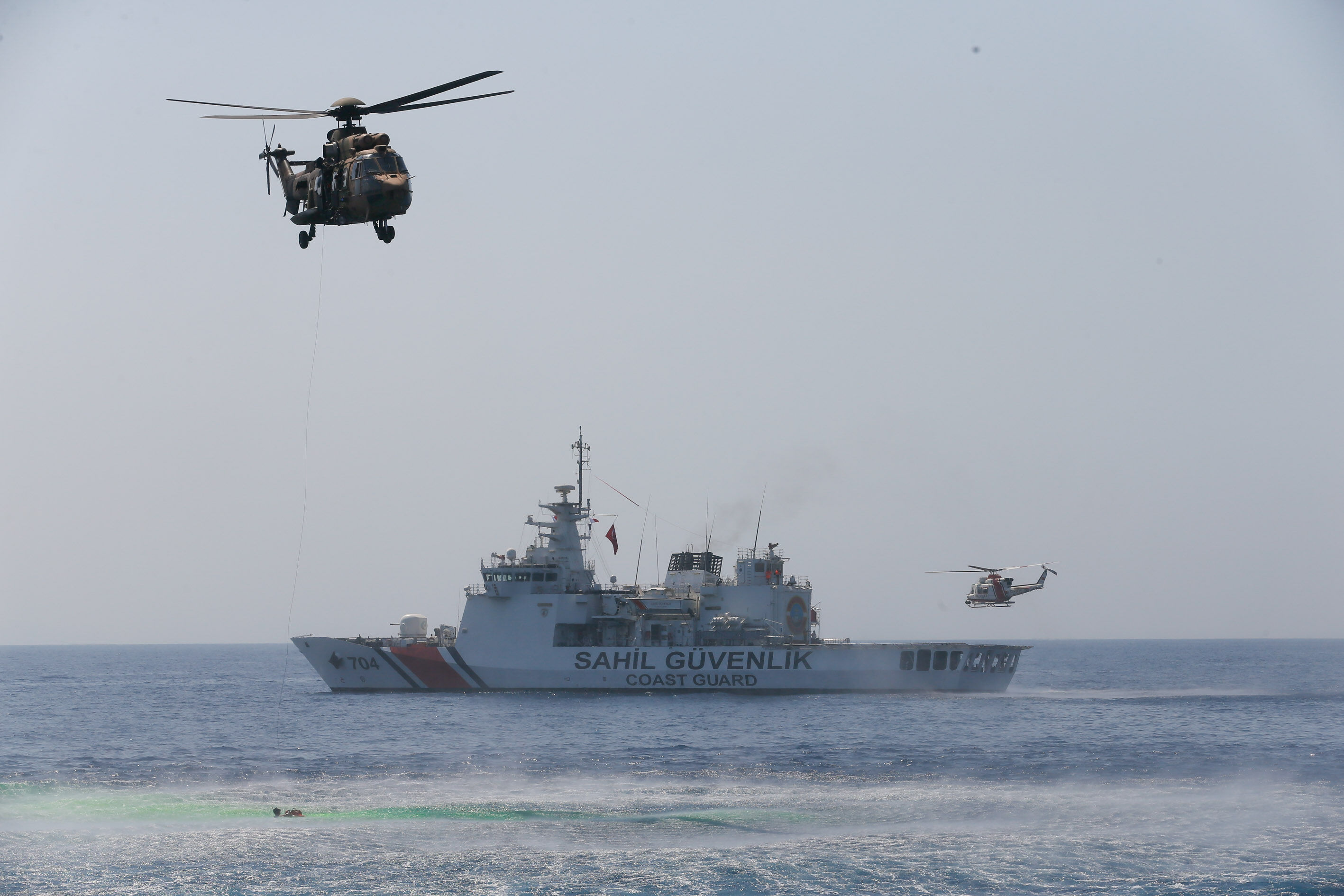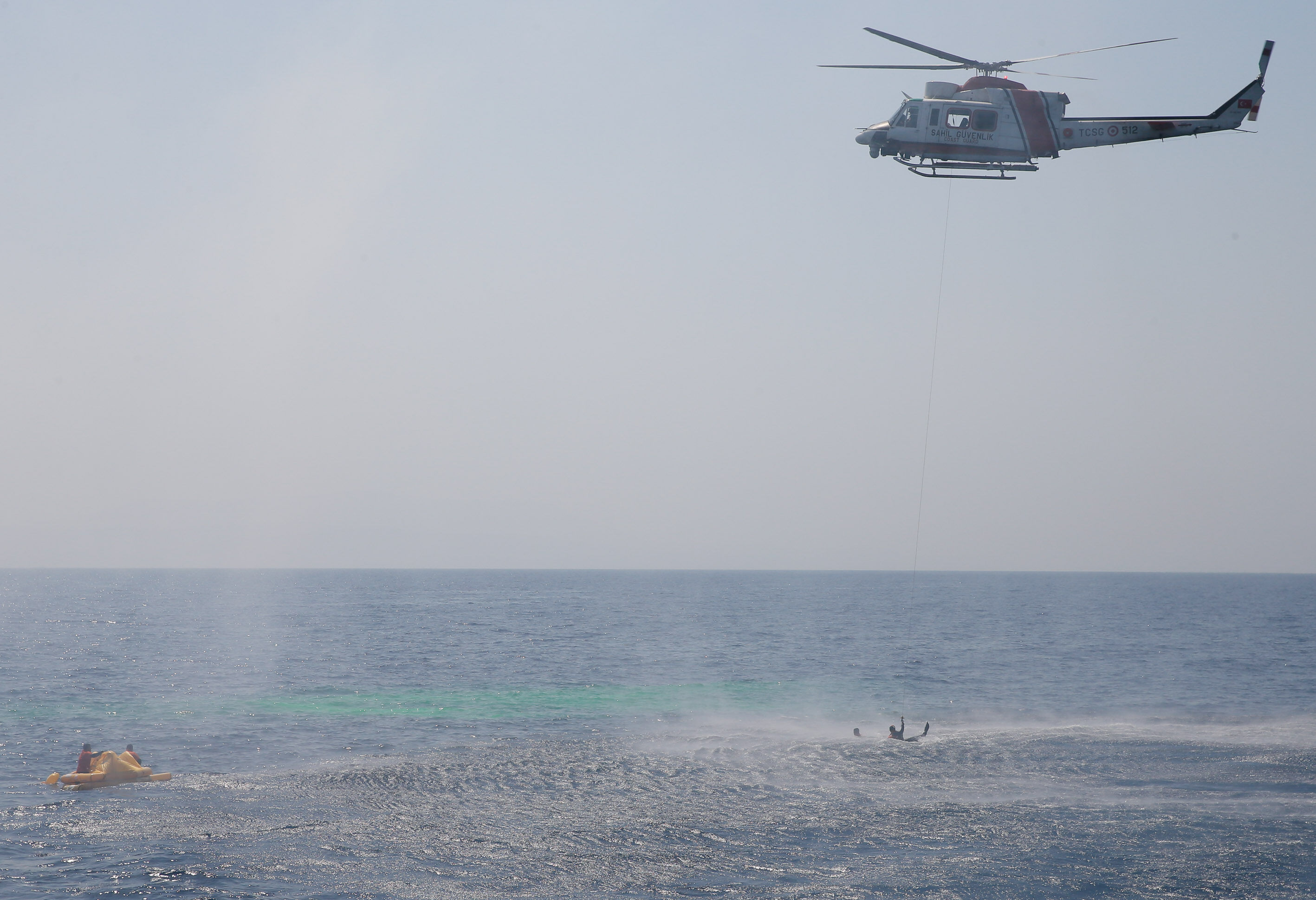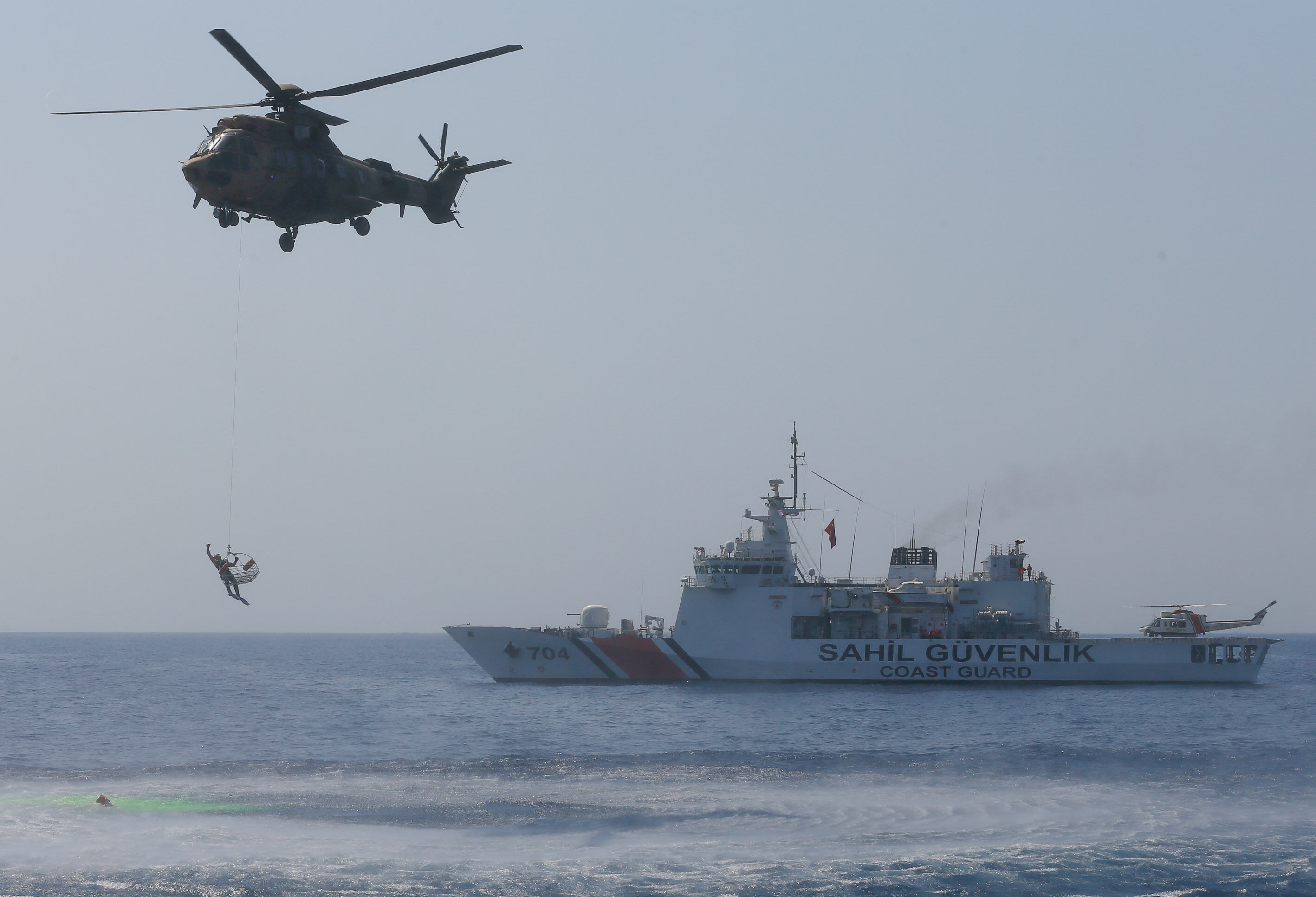 Sahil Güvenlik Komutanı Tuğamiral Bülent Olcay'ın da katılımıyla başlayan tatbikatın Sakız ve Midilli adaları arasında icra edilen safhasında, senaryo gereği batmakta ve yanmakta olan ticari gemideki kazazedeler kurtarıldı.