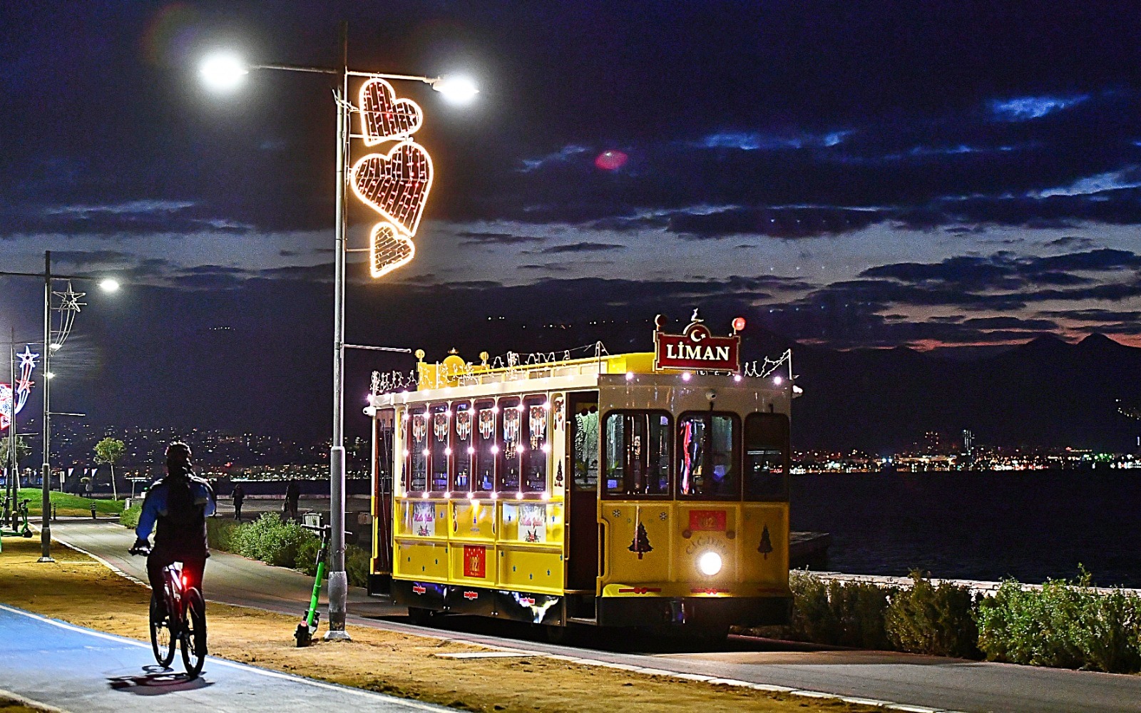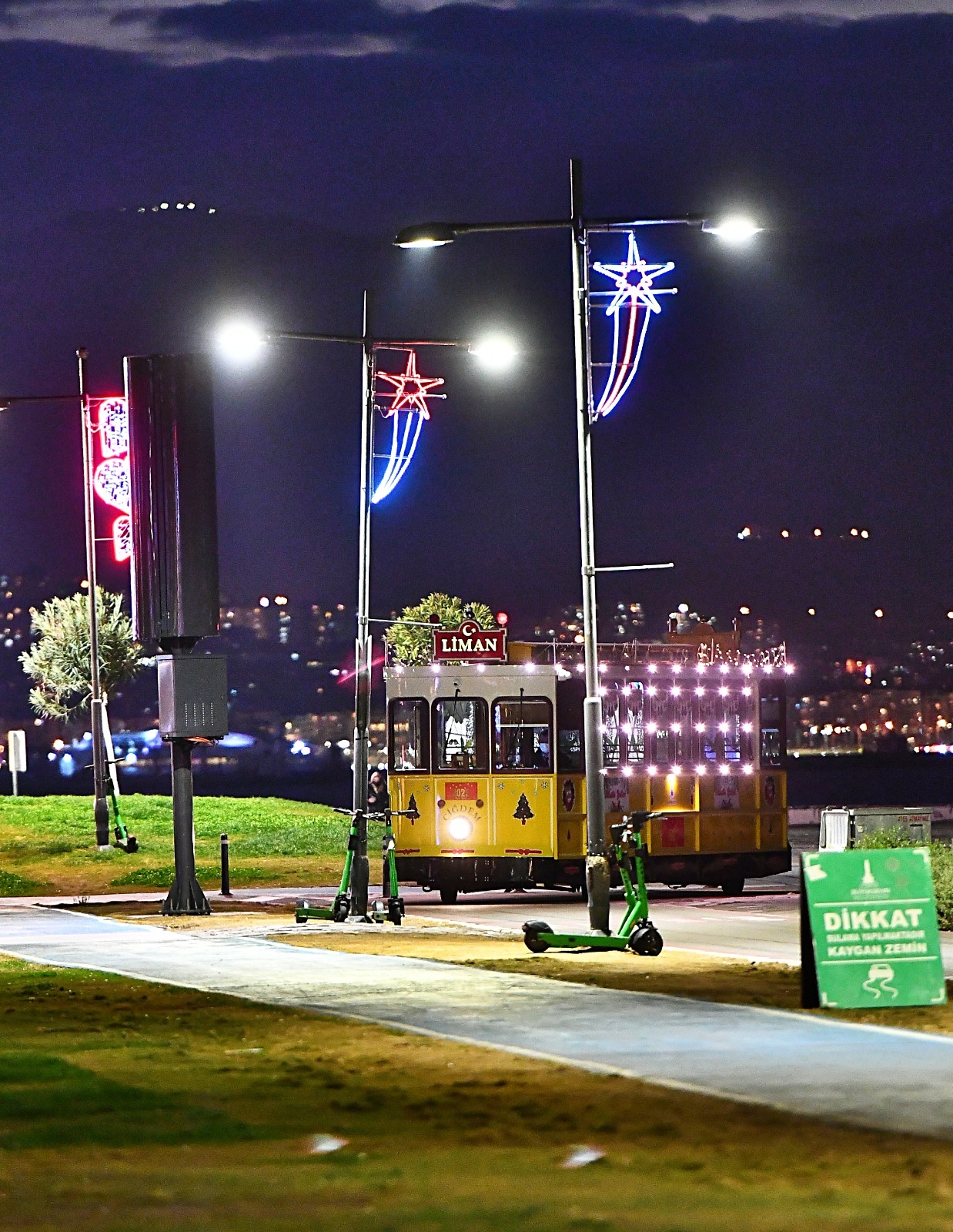 Konak ve Karşıyaka Tramvayları, Birinci Kordon’da çalışan Nostaljik Tramvaylar da ışıklarla süslendi.