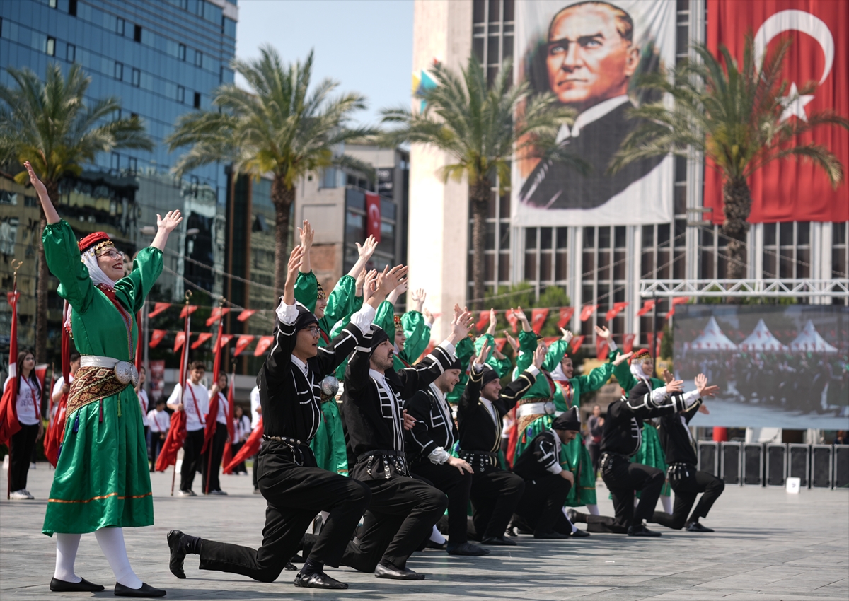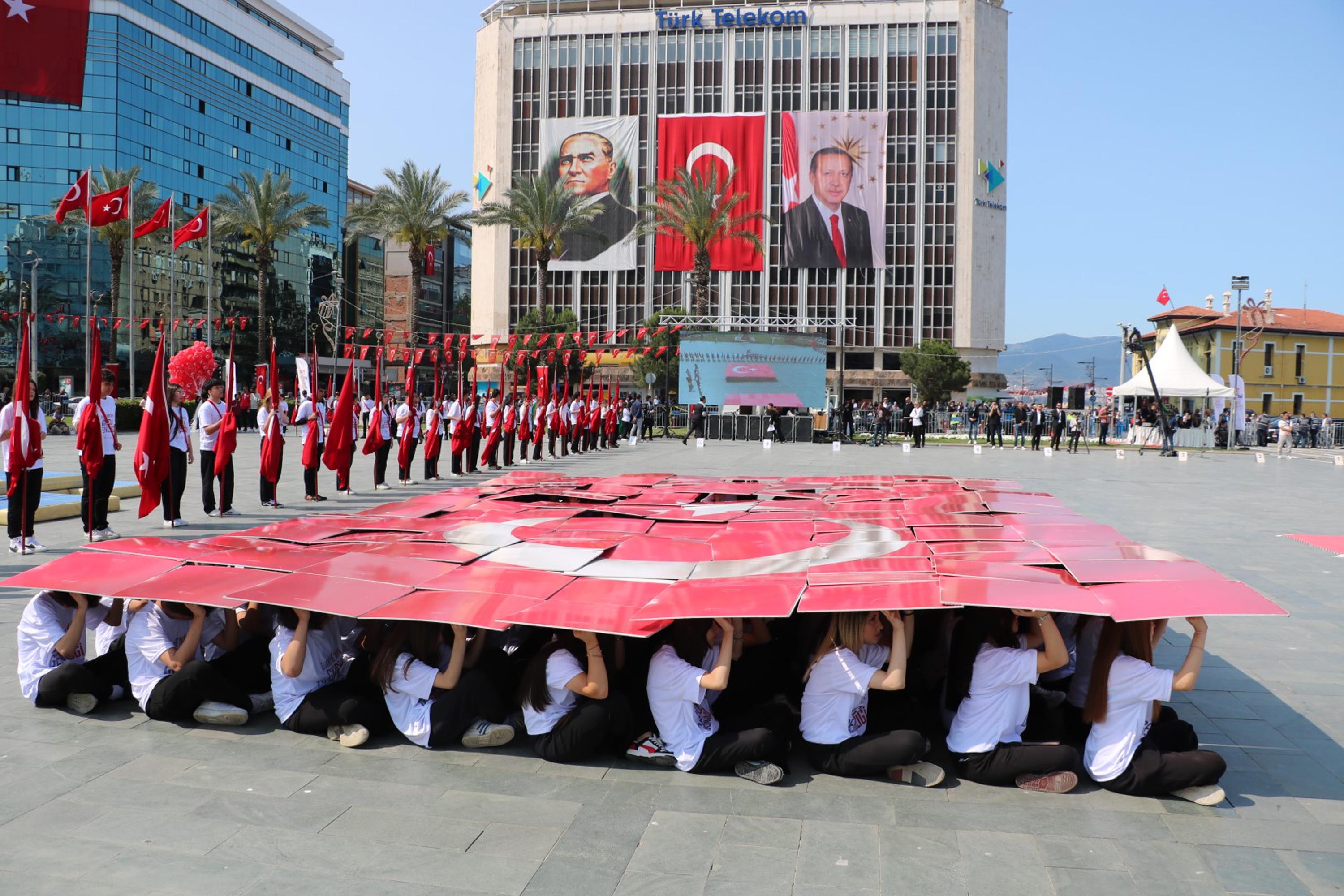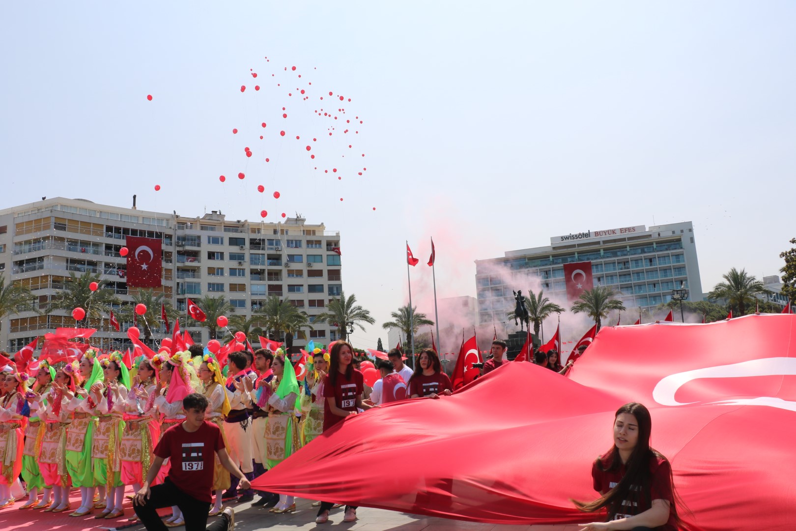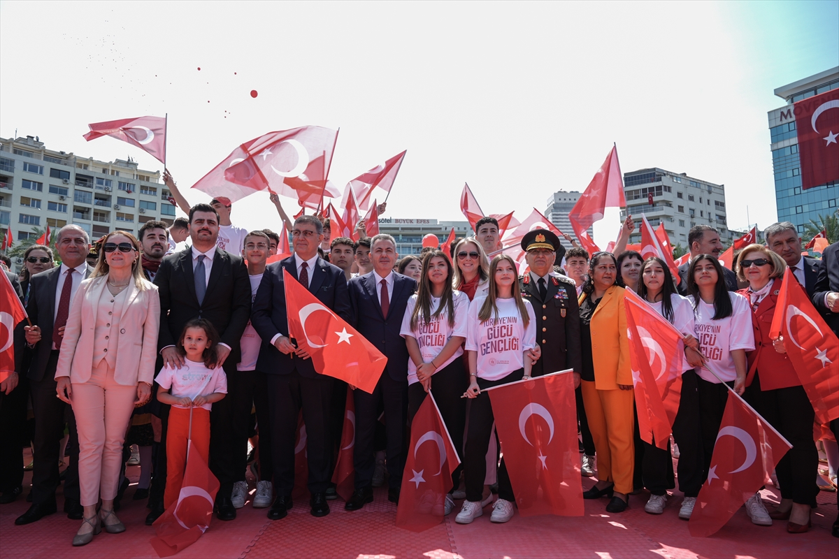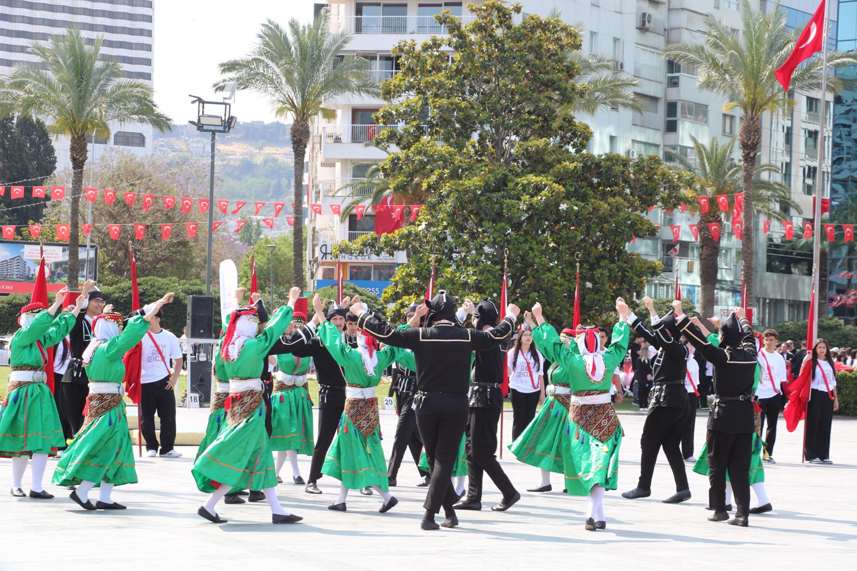 Konuşmaların ardından Gençlik ve Spor Bakanı Osman Aşkın Bak'ın mesajı ve şiirler okundu ve Atatürk'ün Gençliğe Hitabesi seslendirildi. 'Gençliğin Ata'ya Cevabı'nın Atatürk ve bayrak posteri gösterisi ile okunmasının ardından Gençlik ve Spor İl Müdürlüğü, Dokuz Eylül Üniversitesi, İzmir Yüksek Teknoloji Üniversitesi tarafından hazırlanan halk oyunları ve spor gösterileri sunuldu. Meydandaki gösterileri izleyenler, ellerinde Türk bayraklarıyla bayram coşkusuna ortak oldu. Dev Türk bayrağı ile Atatürk posteri açılmasının ardından tören sona erdi. (DHA)