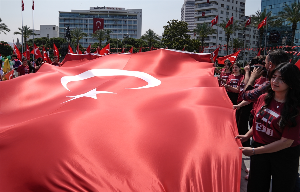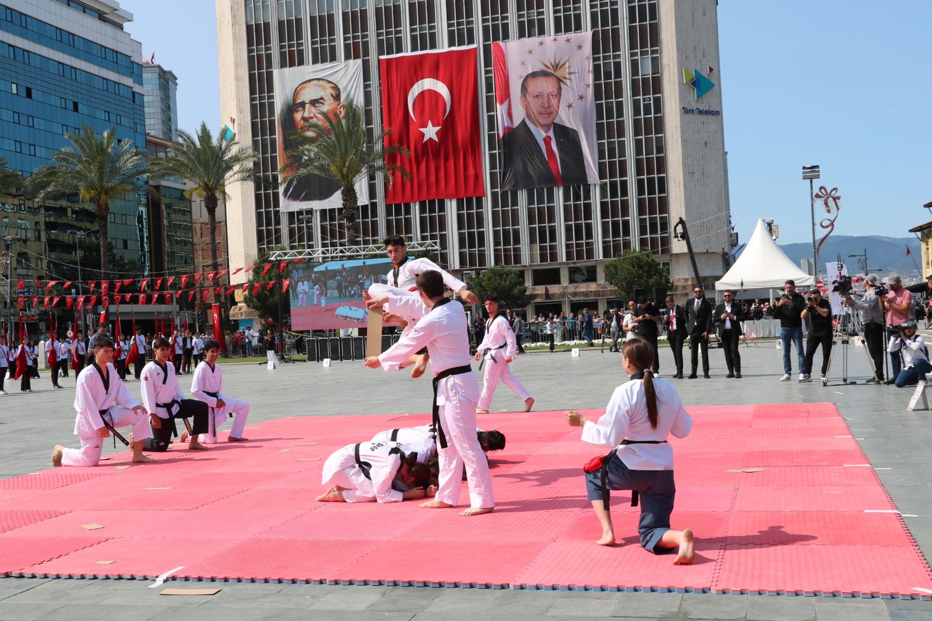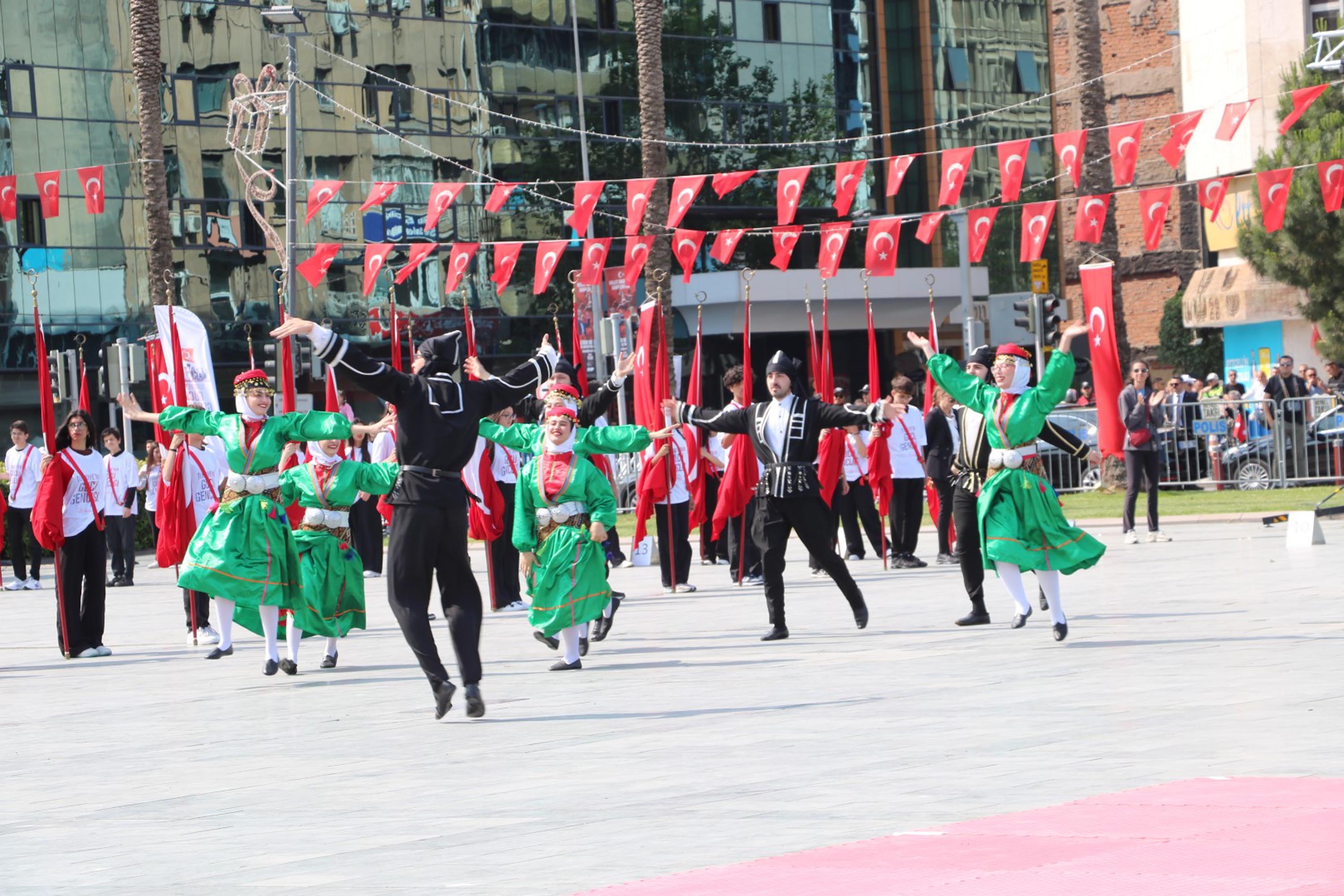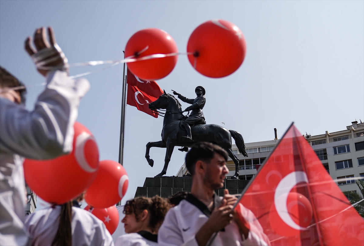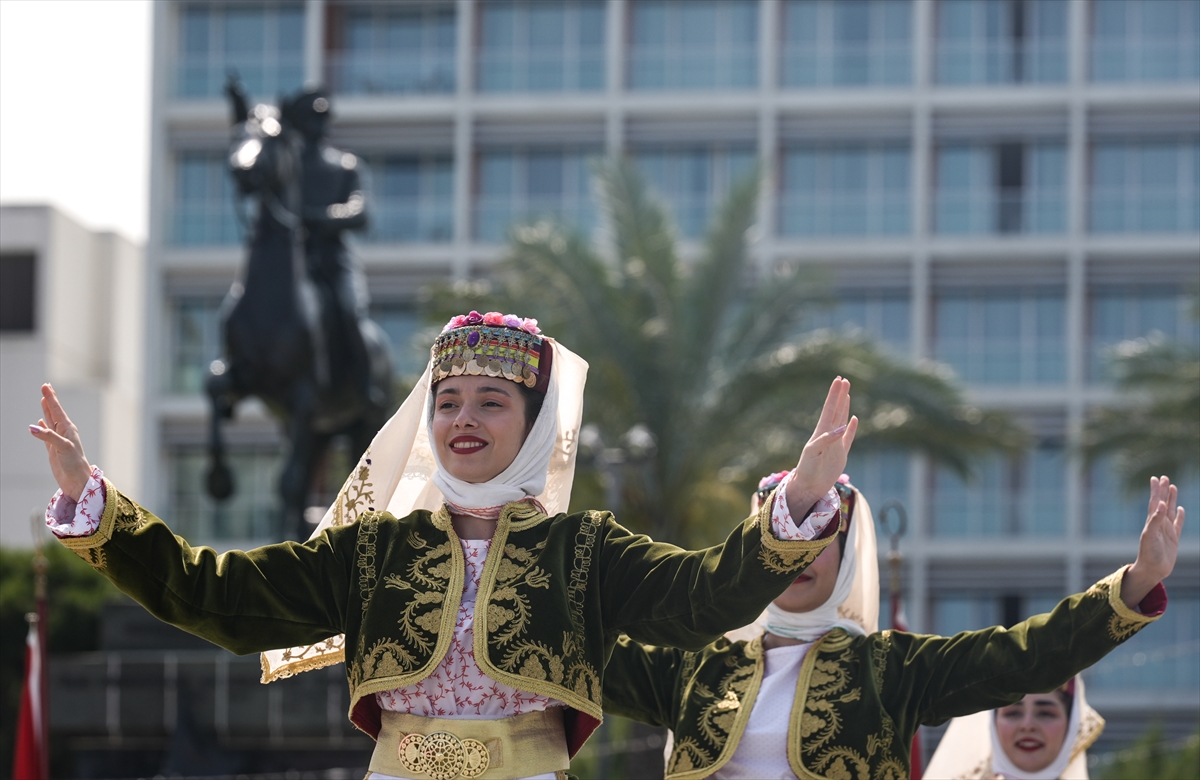 Konuşmaların ardından Gençlik ve Spor Bakanı Osman Aşkın Bak'ın mesajı ve şiirler okundu ve Atatürk'ün Gençliğe Hitabesi seslendirildi. 'Gençliğin Ata'ya Cevabı'nın Atatürk ve bayrak posteri gösterisi ile okunmasının ardından Gençlik ve Spor İl Müdürlüğü, Dokuz Eylül Üniversitesi, İzmir Yüksek Teknoloji Üniversitesi tarafından hazırlanan halk oyunları ve spor gösterileri sunuldu. Meydandaki gösterileri izleyenler, ellerinde Türk bayraklarıyla bayram coşkusuna ortak oldu. Dev Türk bayrağı ile Atatürk posteri açılmasının ardından tören sona erdi. (DHA)