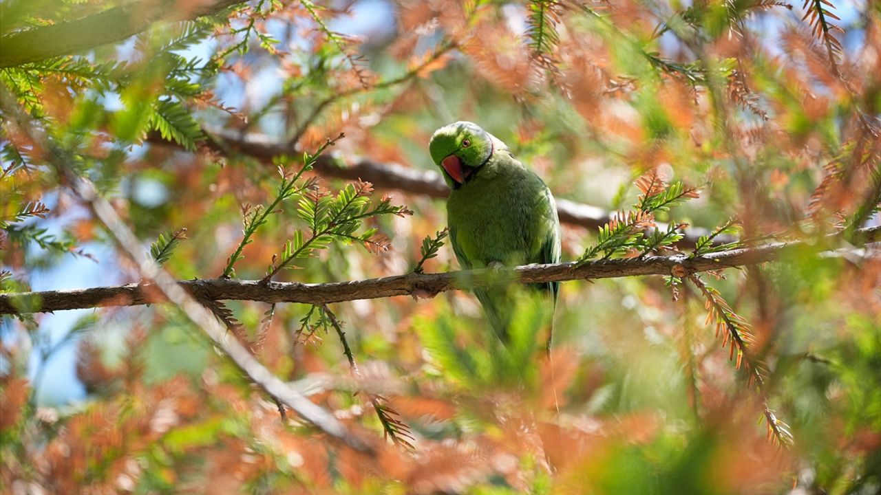 İzmir Kültürpark'taki ağaçlık alanlarda beslenen yeşil papağanlar görüntülendi.