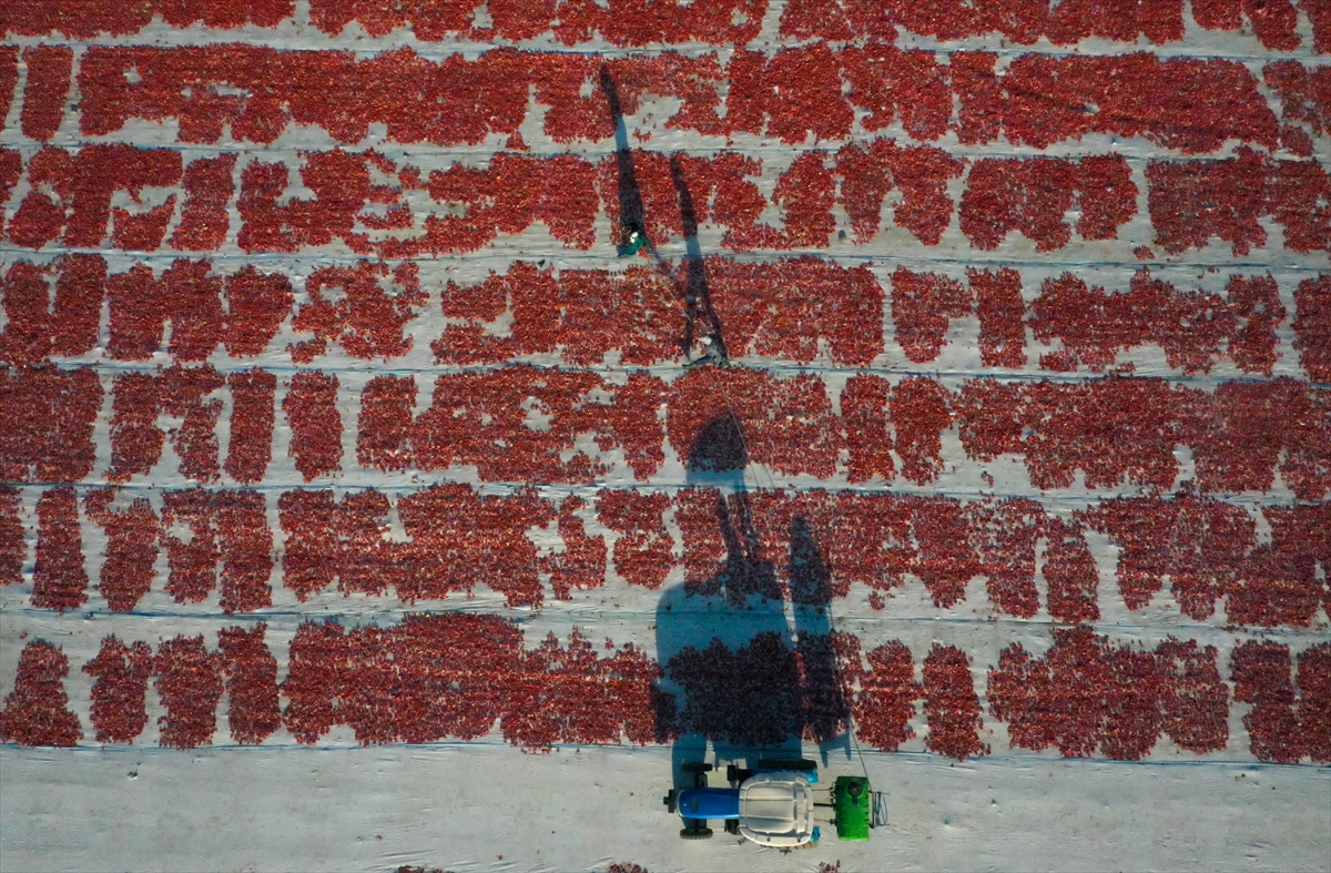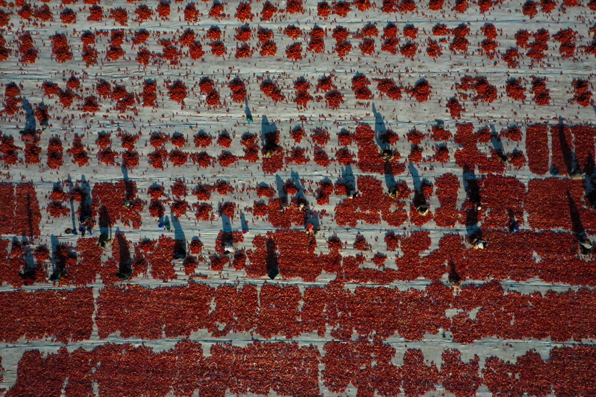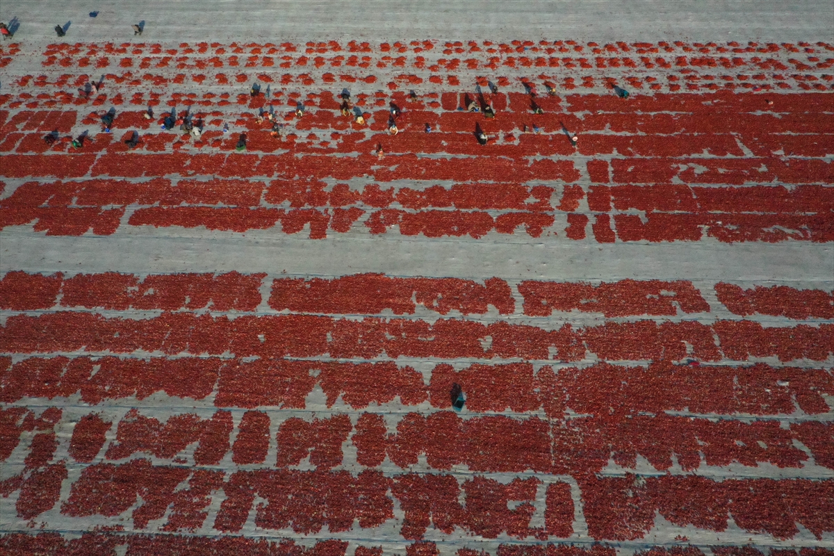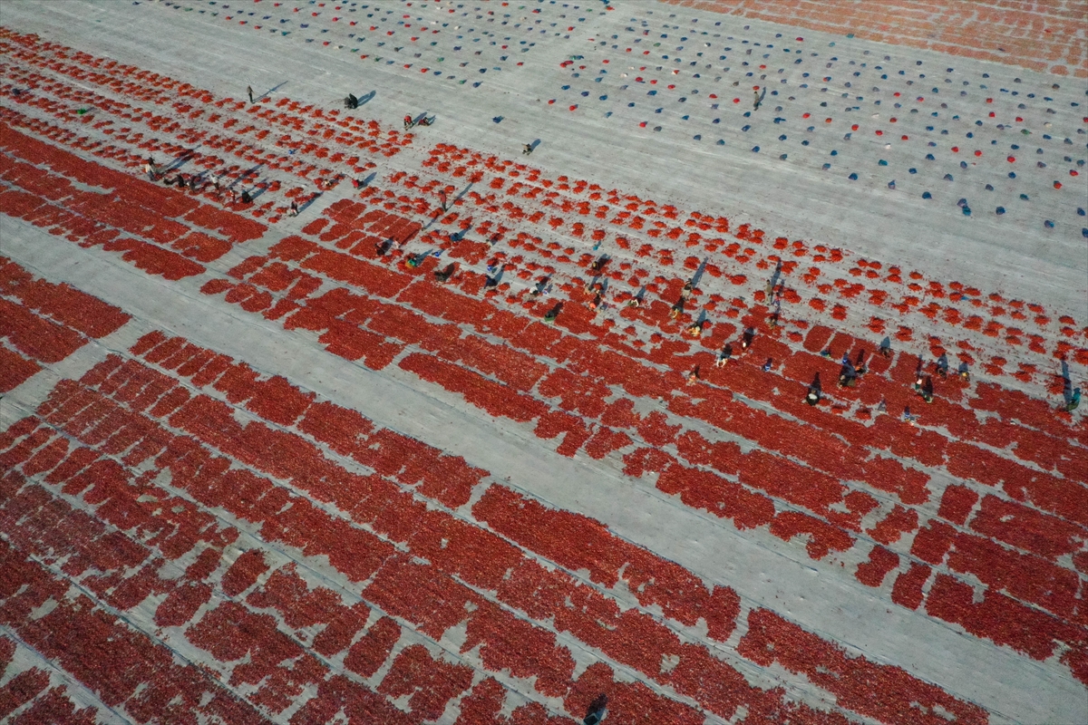 Sergi alanlarını kırmızıya bürüyen domatesler, kükürt veya tuz atılarak bir hafta güneş altında bekletilerek kurutuluyor.