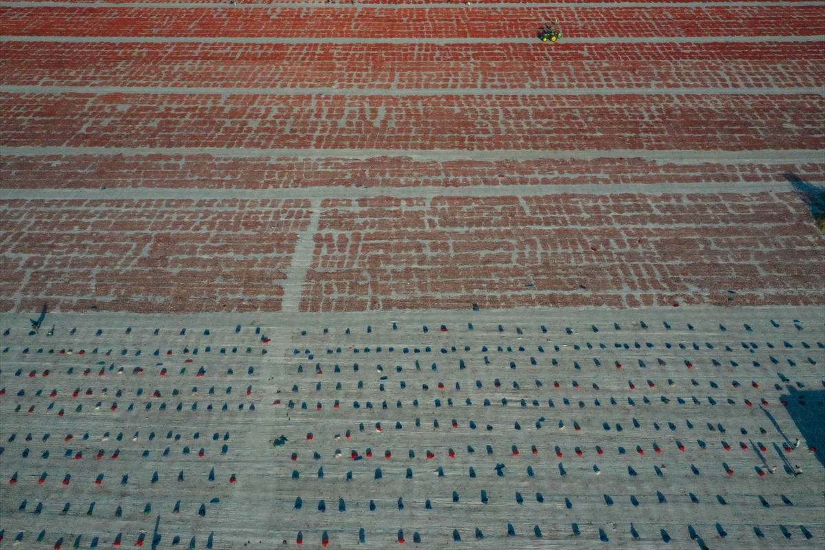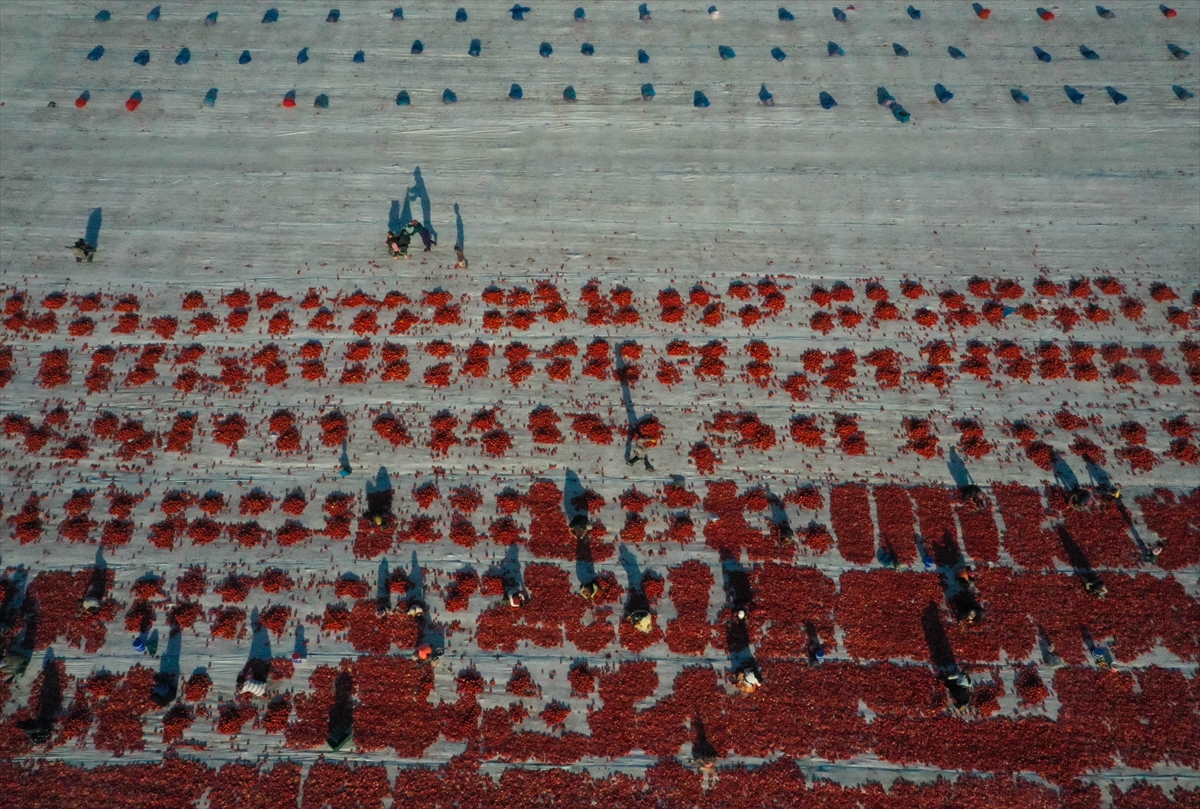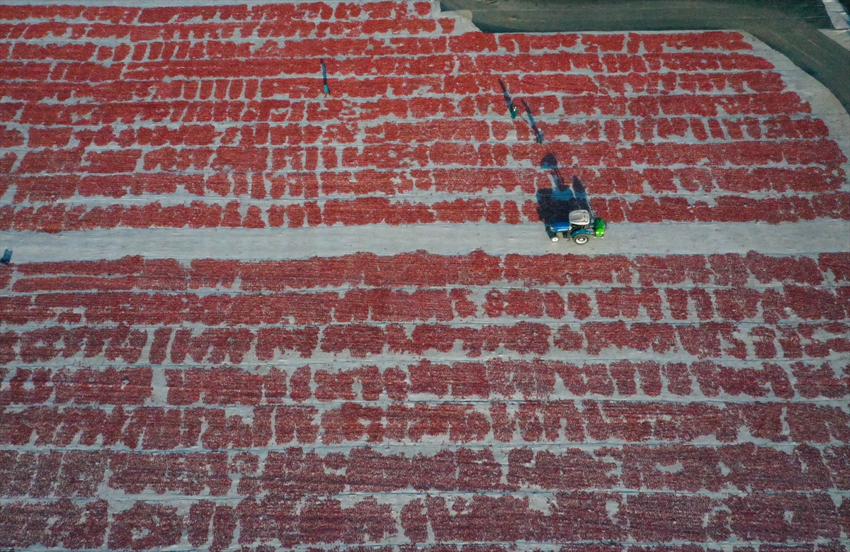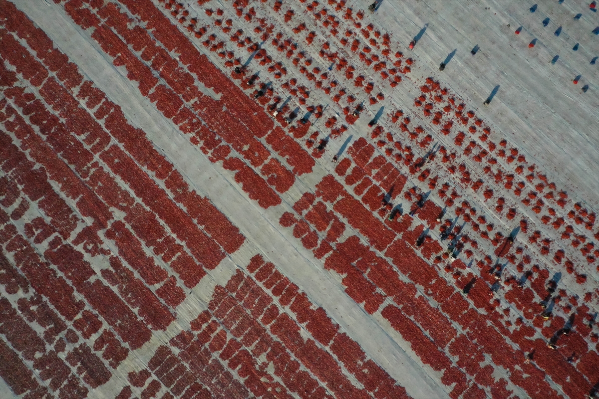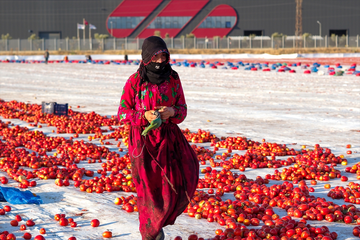 Sergi alanlarını kırmızıya bürüyen domatesler, kükürt veya tuz atılarak bir hafta güneş altında bekletilerek kurutuluyor.