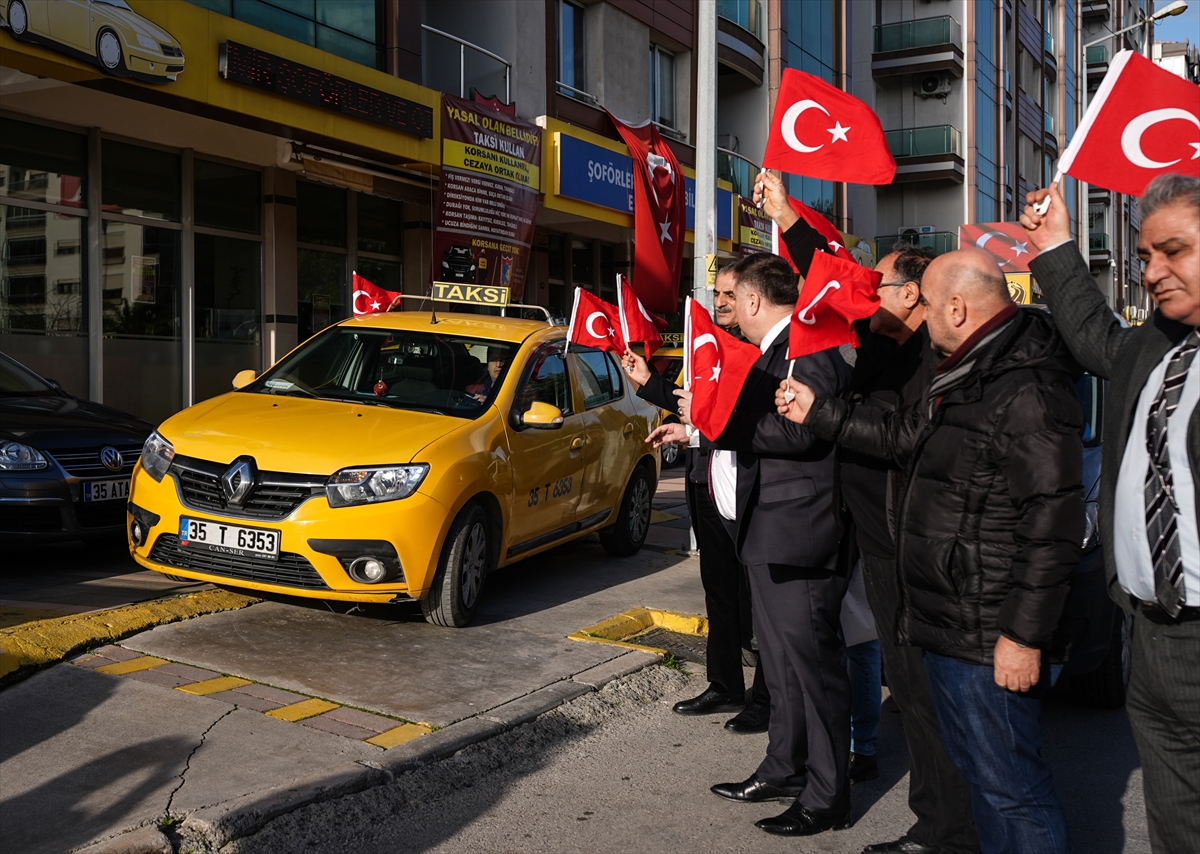 İzmir Şoförler ve Otomobilciler Esnaf Odası binası önünde bir araya gelen taksiciler, oda binası ve taksilerine Türk bayrakları astı.