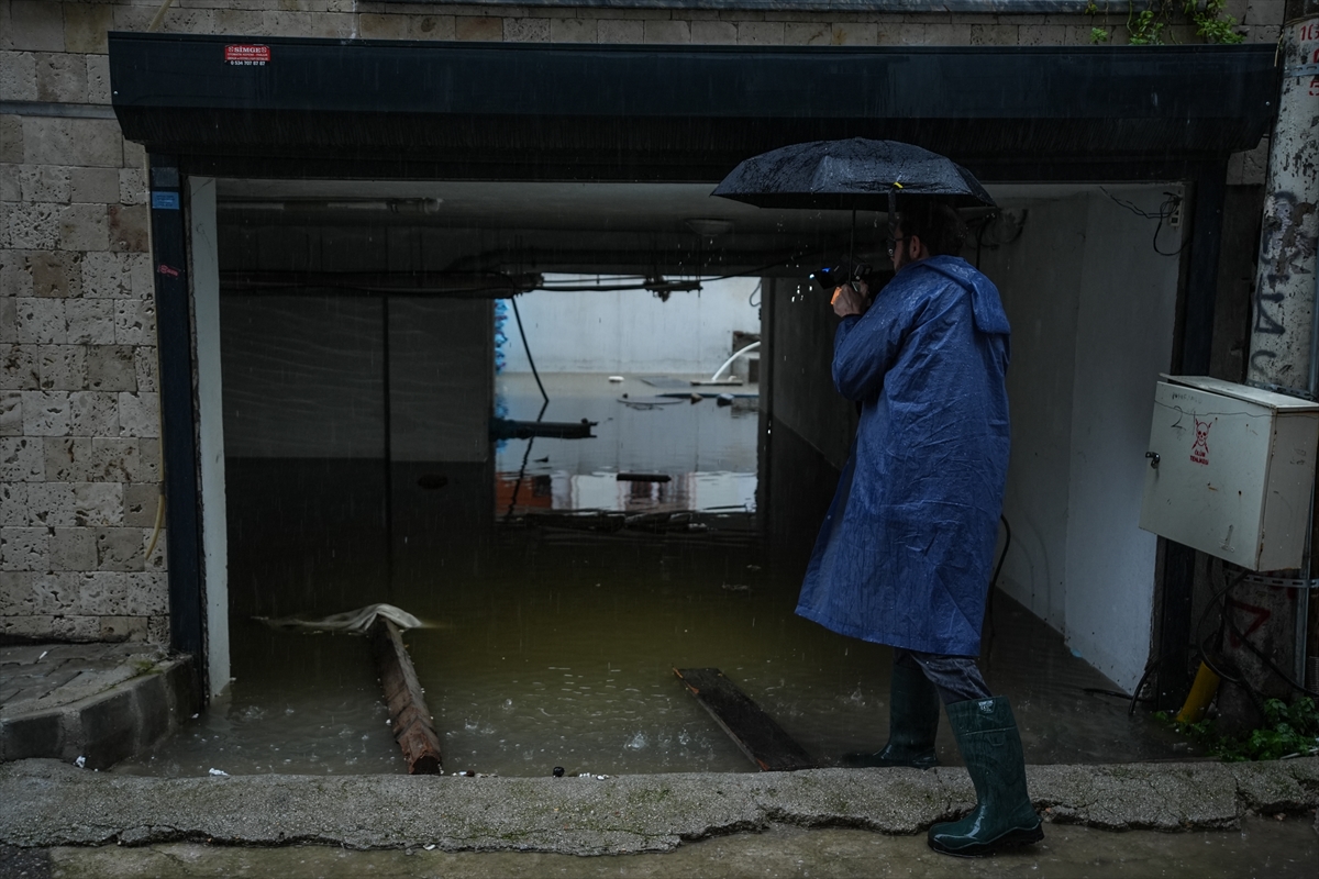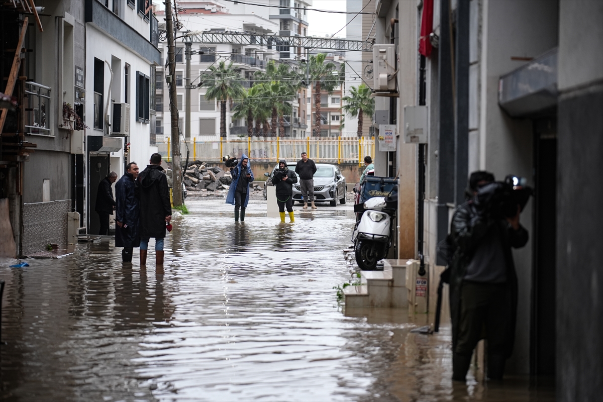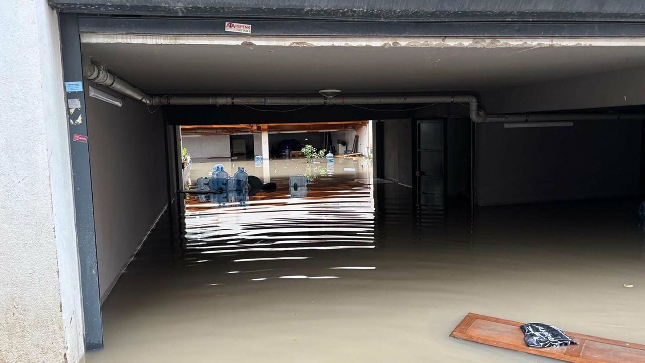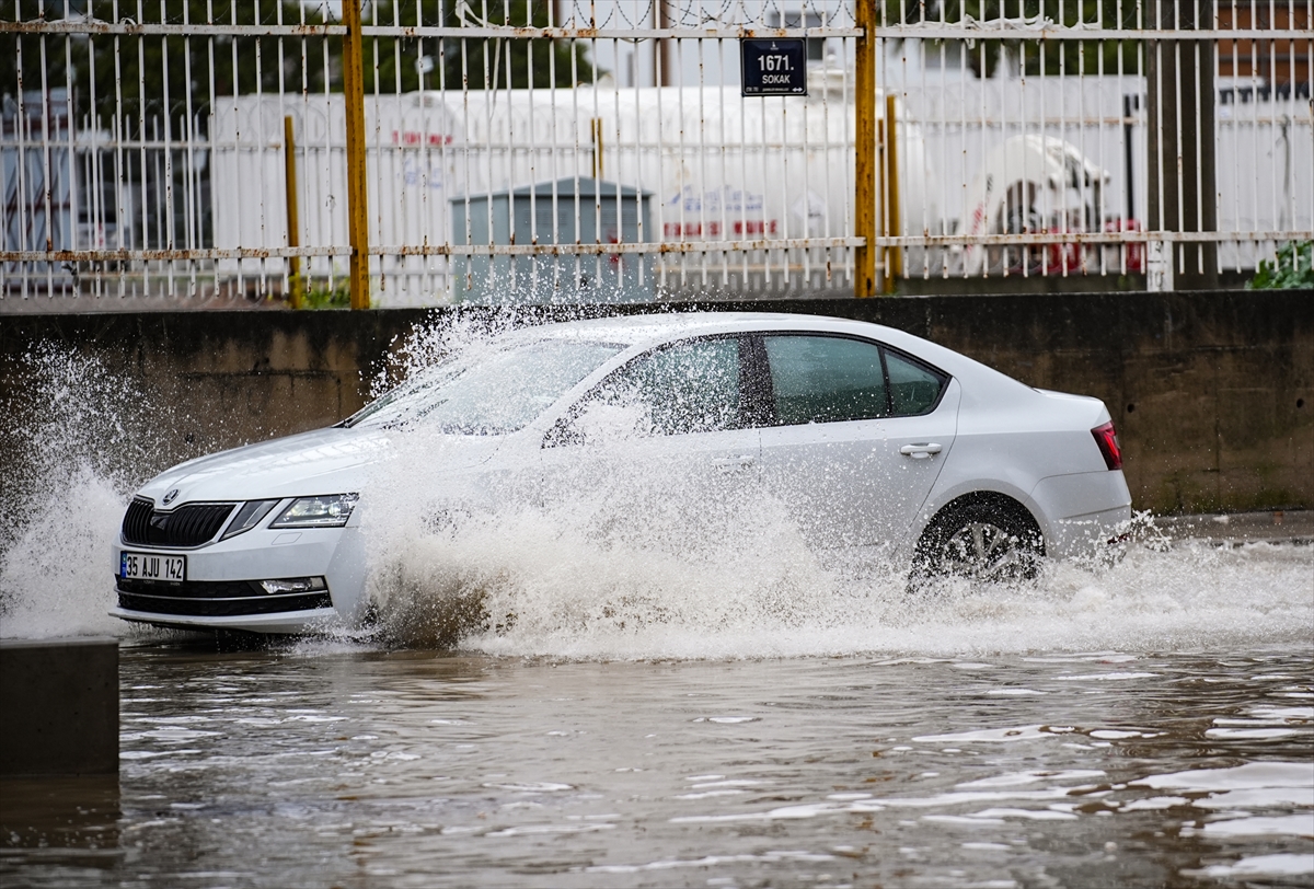 İzmir'de etkili olan sağanak nedeniyle Karşıyaka Şemikler Mahallesi'ndeki 6304 ve 6305 sokaklar göle döndü. Çok sayıda ev ve otopark suyla dolarken, vatandaşlar kendi imkanlarıyla suları tahliye etmeye çalıştı. (DHA)