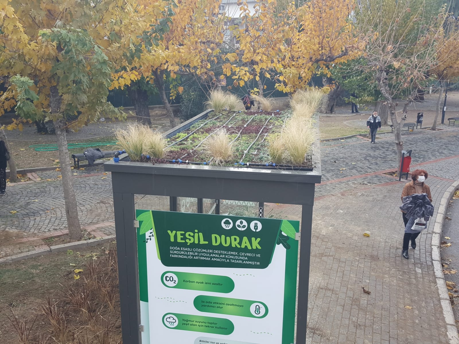 Isı adası tesirini düşürmesiyle mevsimsel hava koşullarının etkisini yumuşatan durak, yüksek karbon emici özelliği ile karbon ayak izinin azaltılmasına da katkı sağlıyor. Çatı bahçesi, canlılar için habitat oluştururken, toplanan yağmur suyu da yeşil alana verilerek su tasarrufu yapılıyor. Durak içindeki USB şarj alanı ise bekleyen yolcuların, telefon, tablet gibi cihazlarını şarj edebilmesine imkân tanıyor.