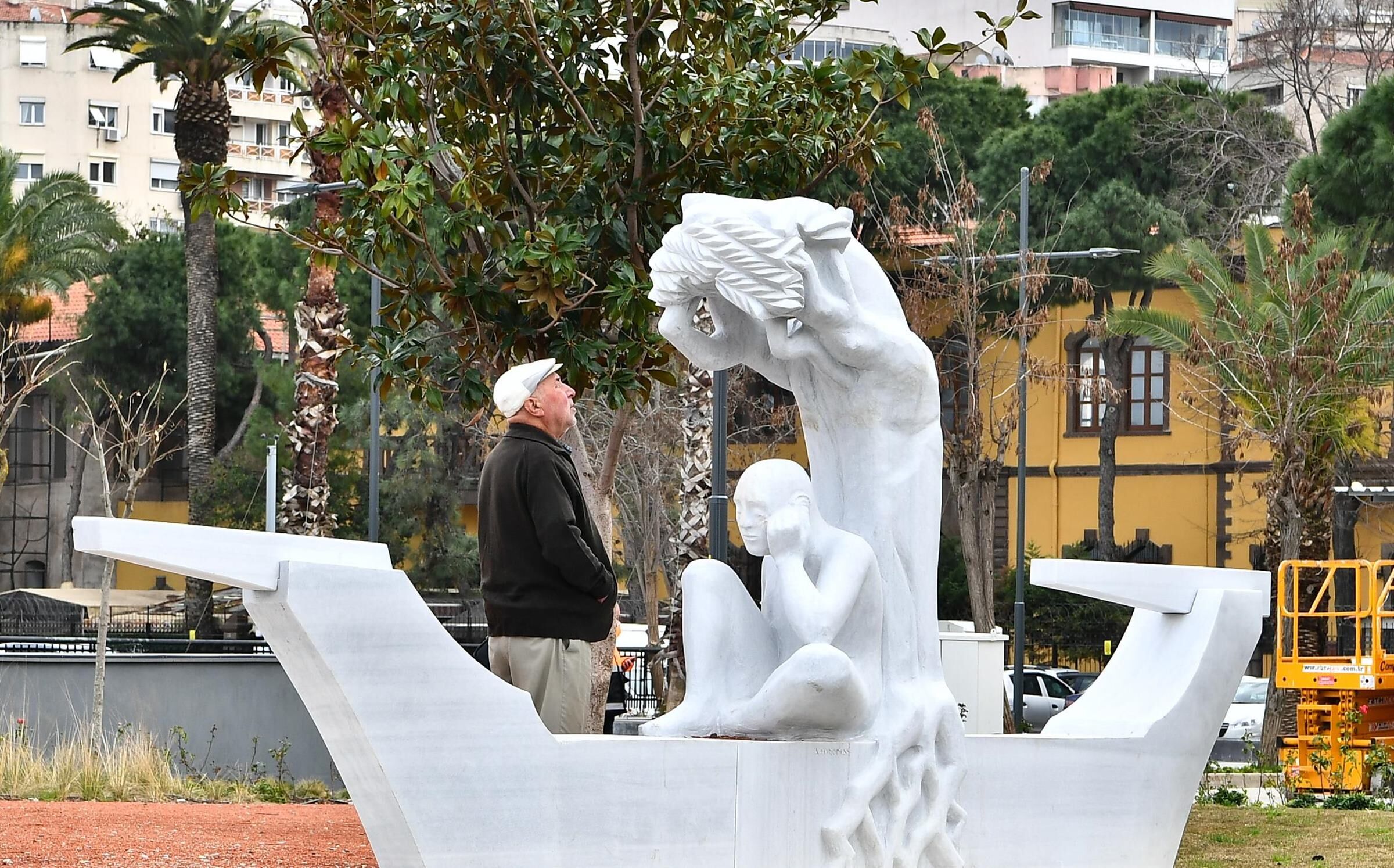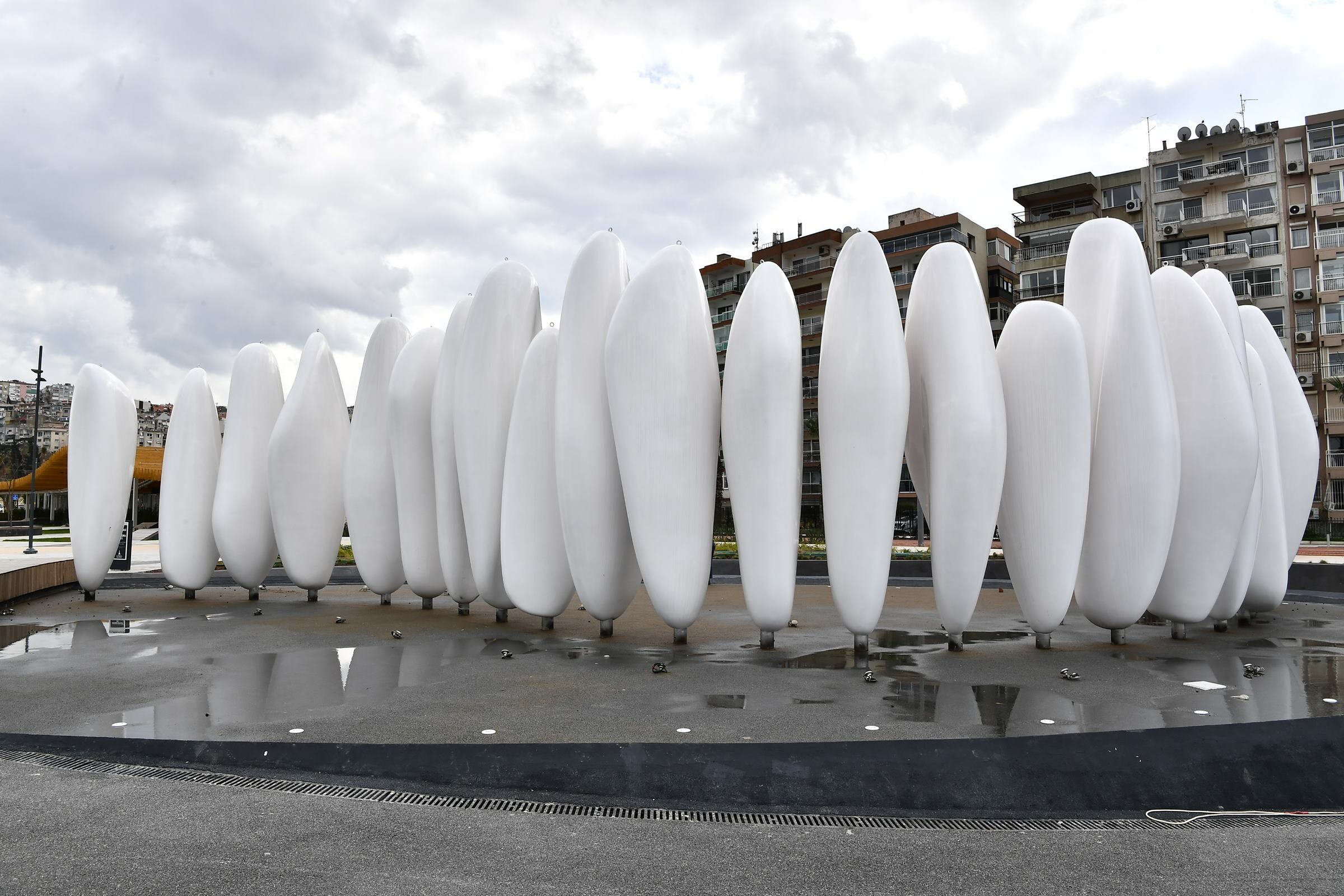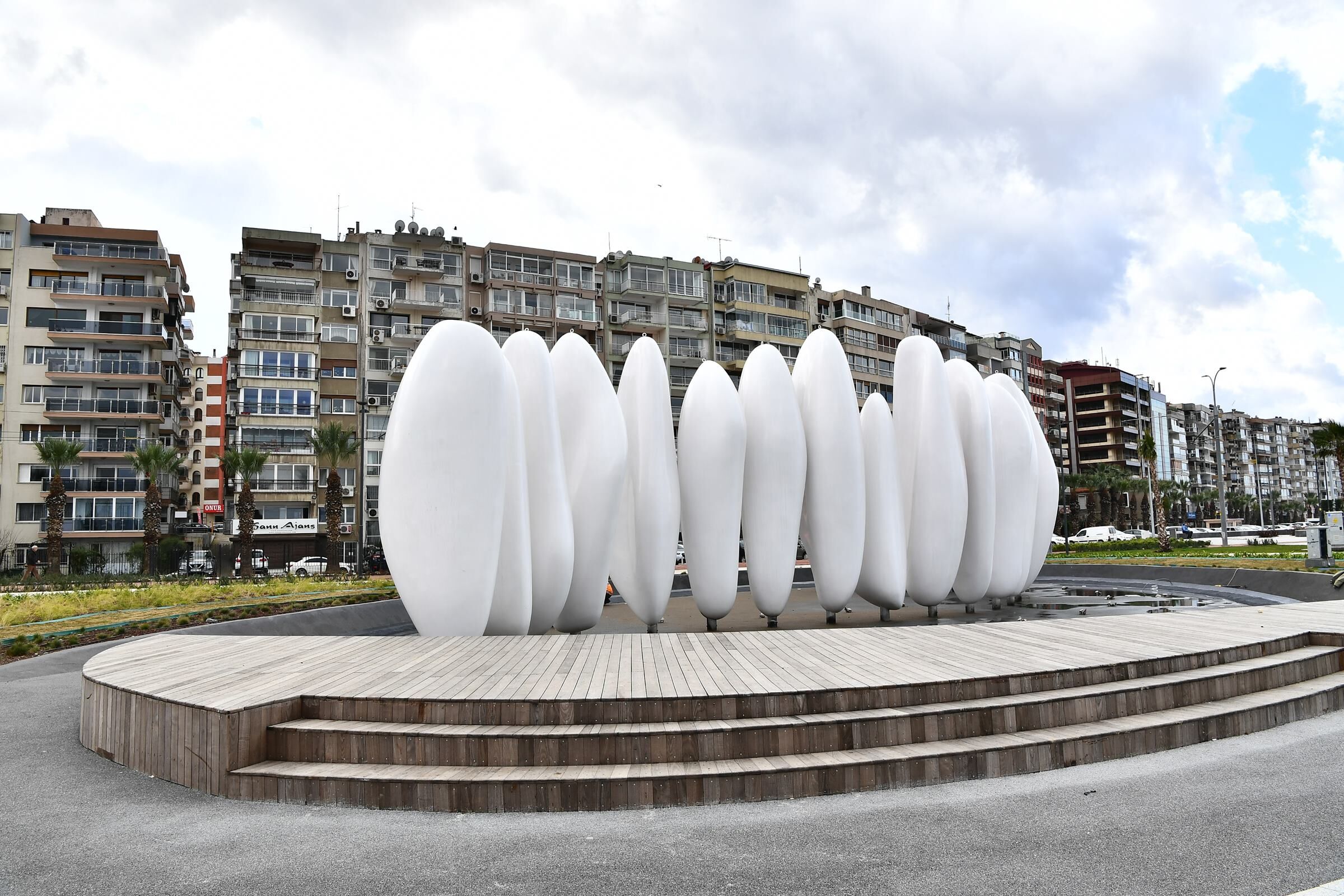Meydanda yer alan anıt heykel, 8 proje arasından seçildi. Sanatçı Günnur Özsoy’un “tek bir parçadan başlayıp gittikçe sıklaşarak devam eden ve kumsaldaki çakıl taşlarını hatırlatan” eserinin seçilmesinde, hayatın içinde törpülenmiş çakıl taşlarının ayağa kalkarak birlikte bir bütün olması ve omuz omuza duran halkı çağrıştırması unsurları öne çıktı. Tamiratı kolay, hafif ve dış koşullara dayanı klı bir malzeme olan polyester malzemenin kullanıldığı heykelde, bütün olmuş bir milleti temsil etmesi yönünden beyaz renk seçildi. Su havuzuna yerleştirilen 23 heykel, aynı zamanda teknelerin yelkenlerini ve kuş kanatlarını hatırlatarak özgürlük enerjisi de yayıyor.