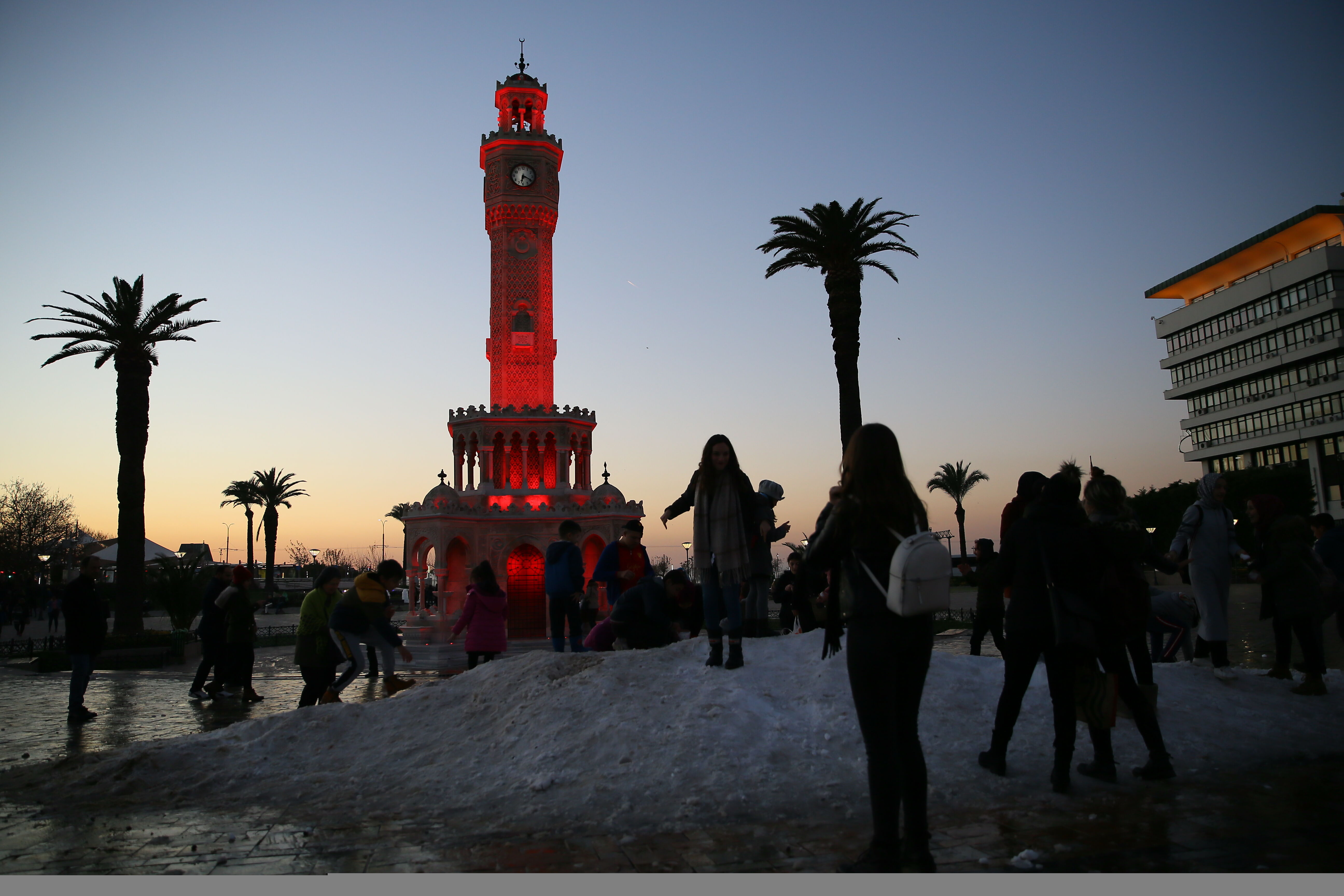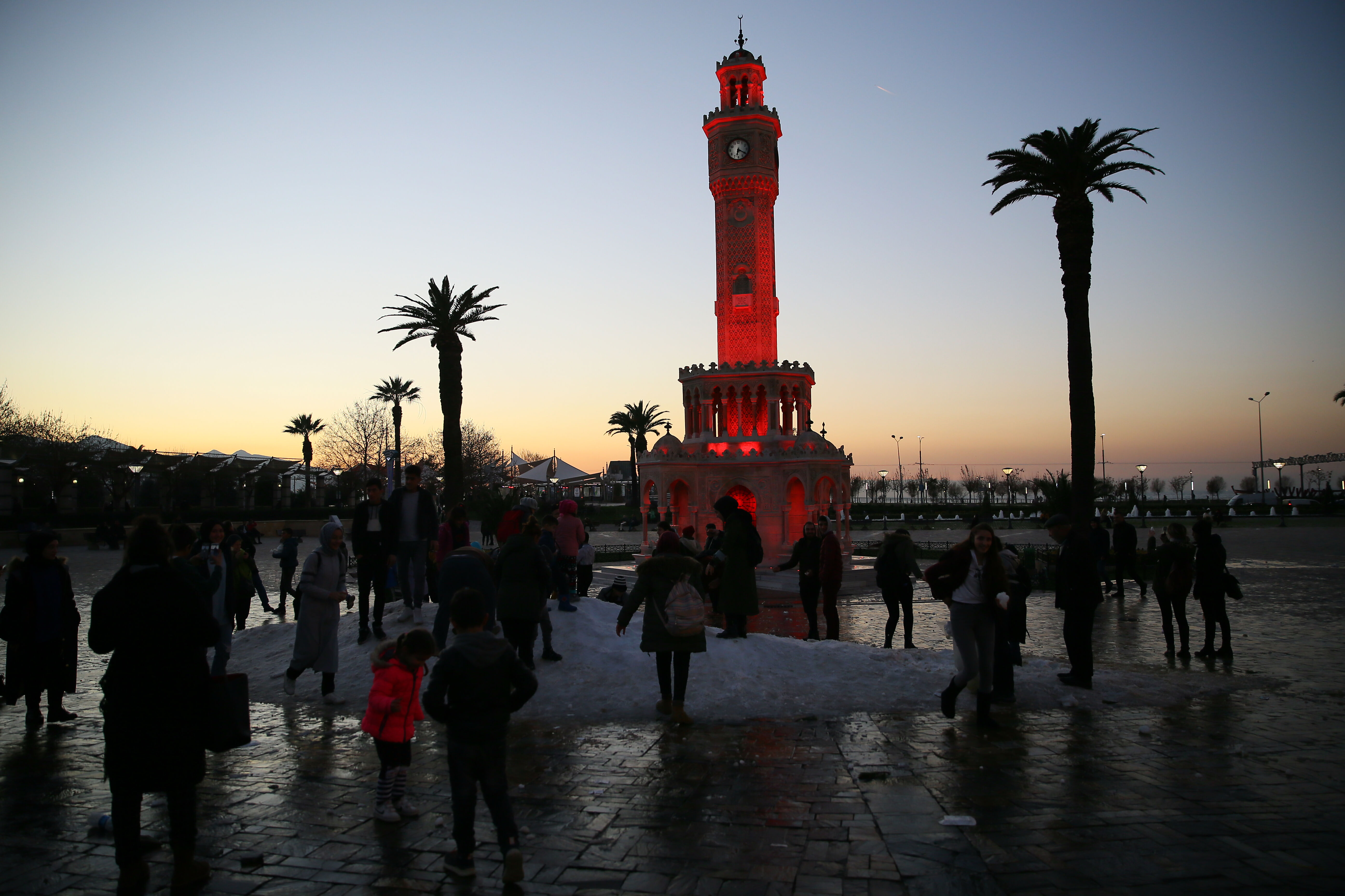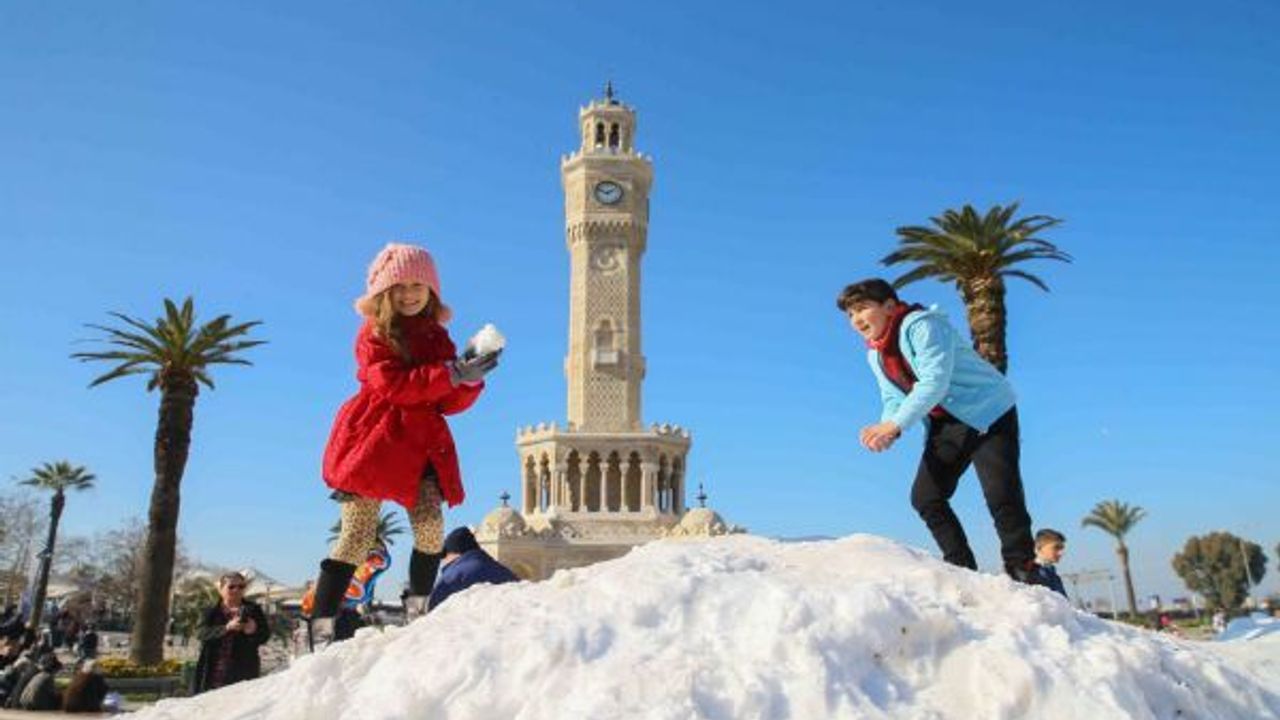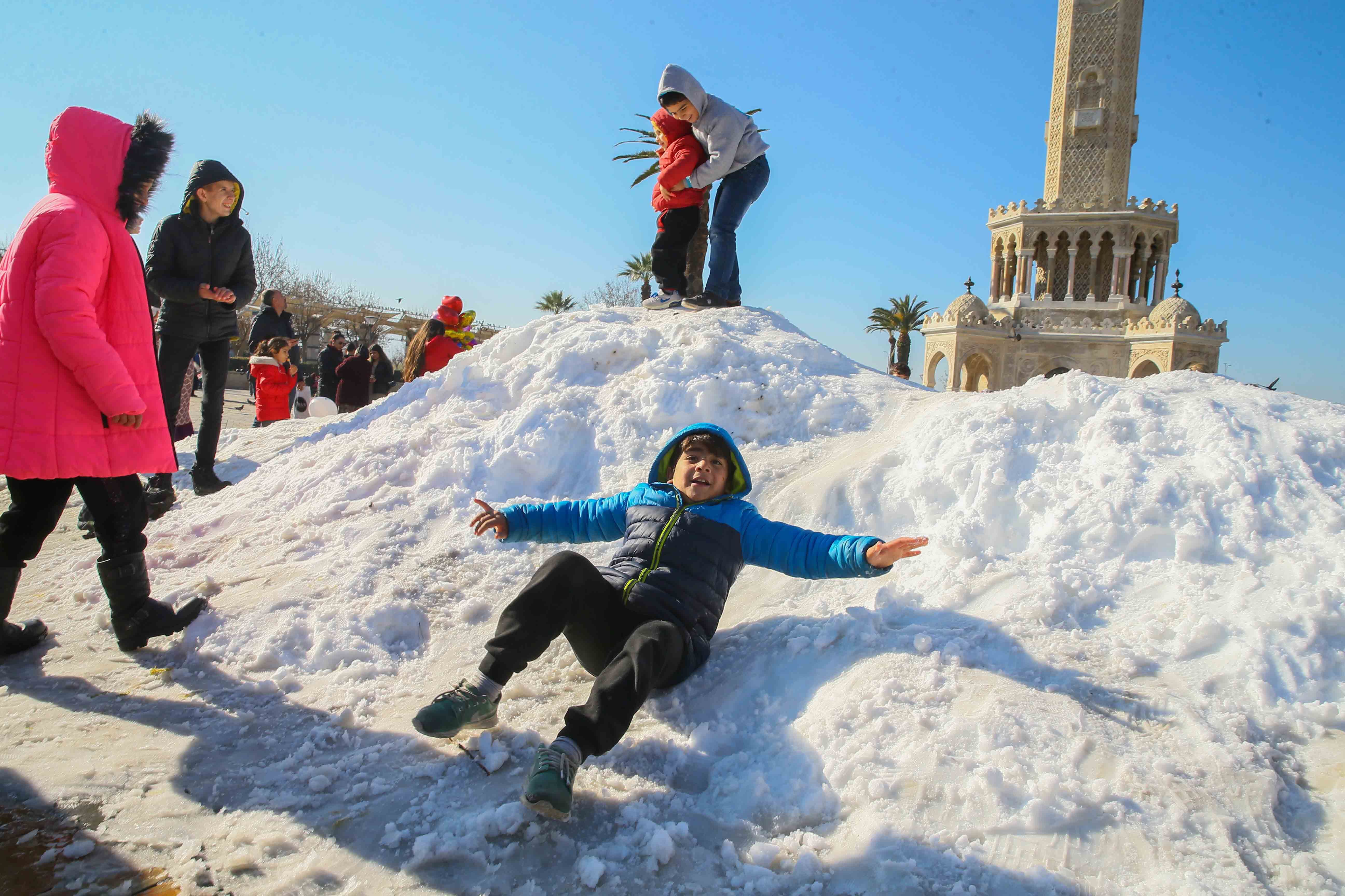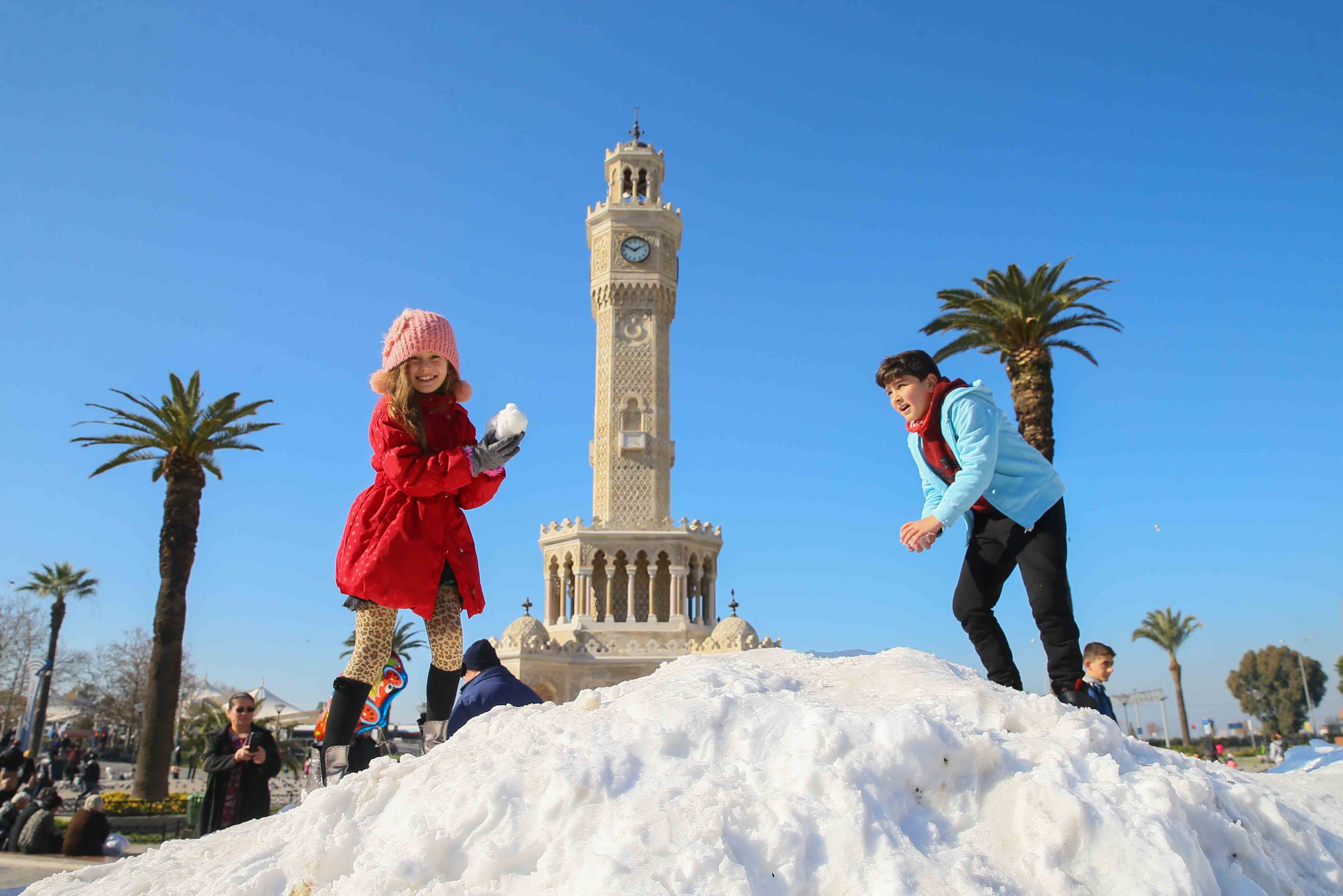 Yurt genelinden gelen kış manzarası görüntüleriyle kar hasreti çeken İzmirliler, Konak Meydanı'na kamyonlardan dökülen karla şaşkınlık yaşadı. Çocuklar başta olmak üzere İzmirliler, öğlen tarihi Saat Kulesi önüne dökülen karlarla akşam saatlerine kadar eğlenmeye devam etti.