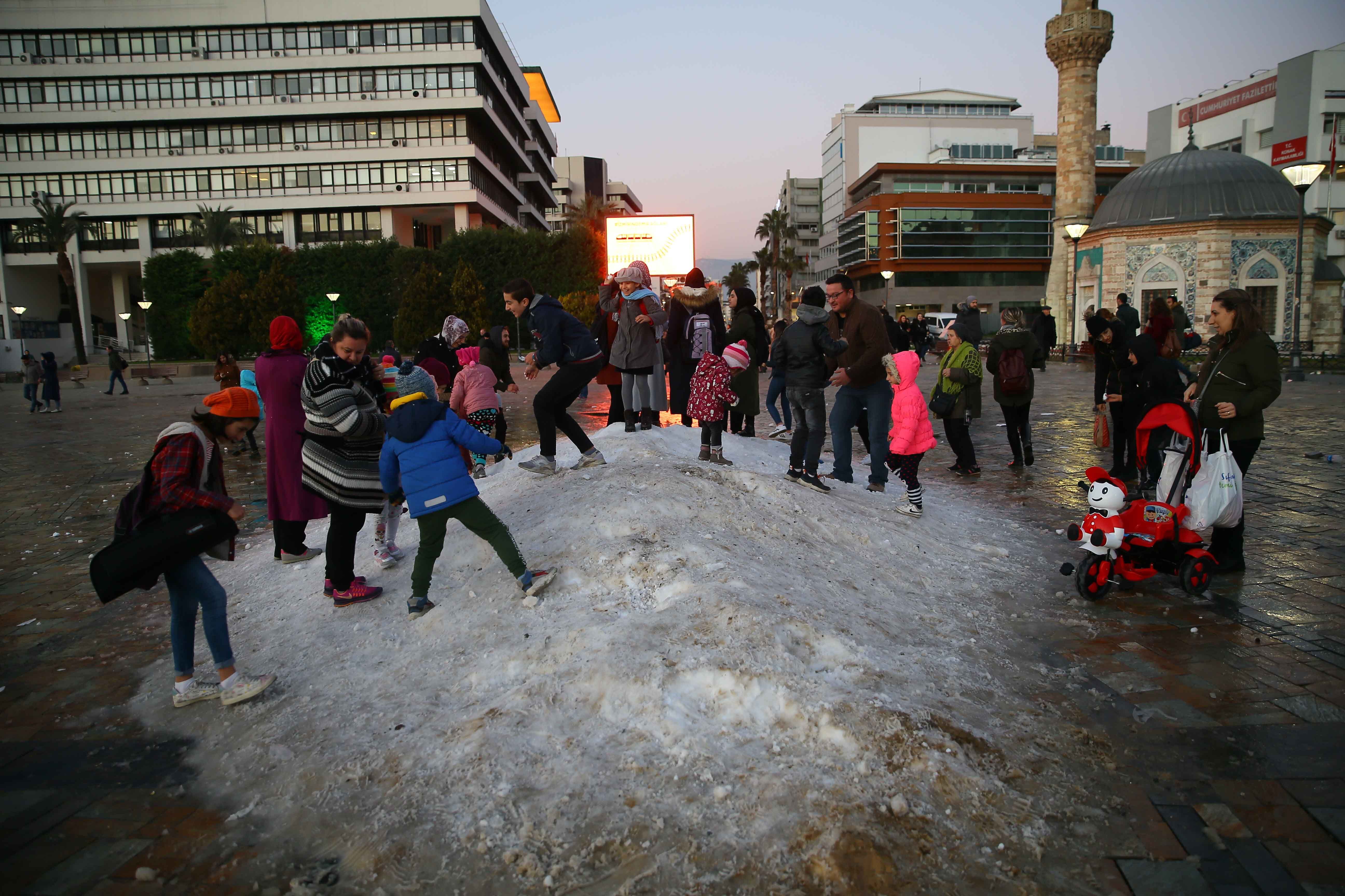Kent merkezine genellikle karın düşmediği İzmir'de çocuklar, Kemalpaşa Belediyesi tarafından Nif Dağı bölgesinden toplanıp kamyonlarla kent merkezine taşınan karlar sayesinde kış keyfi yaşadı.