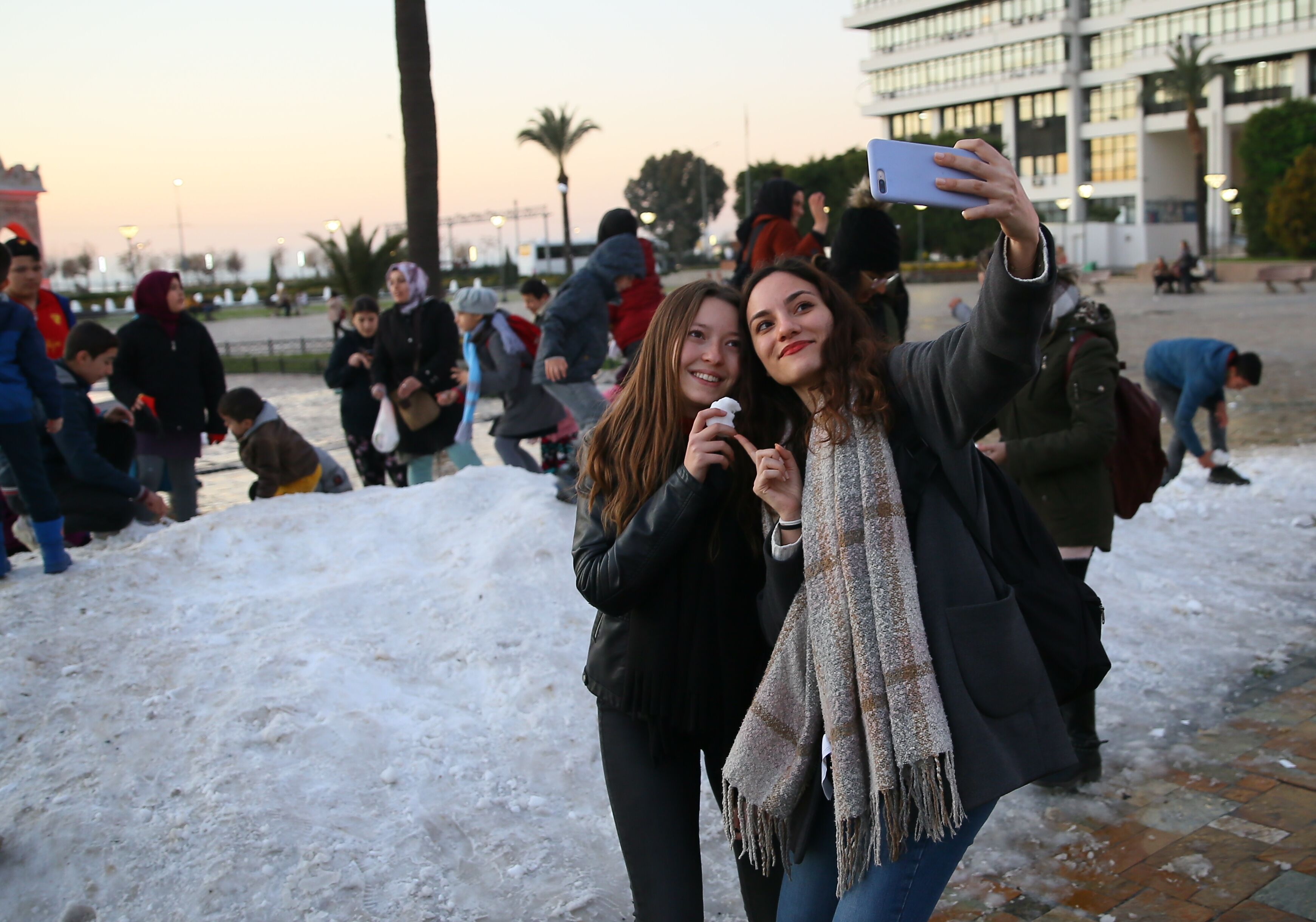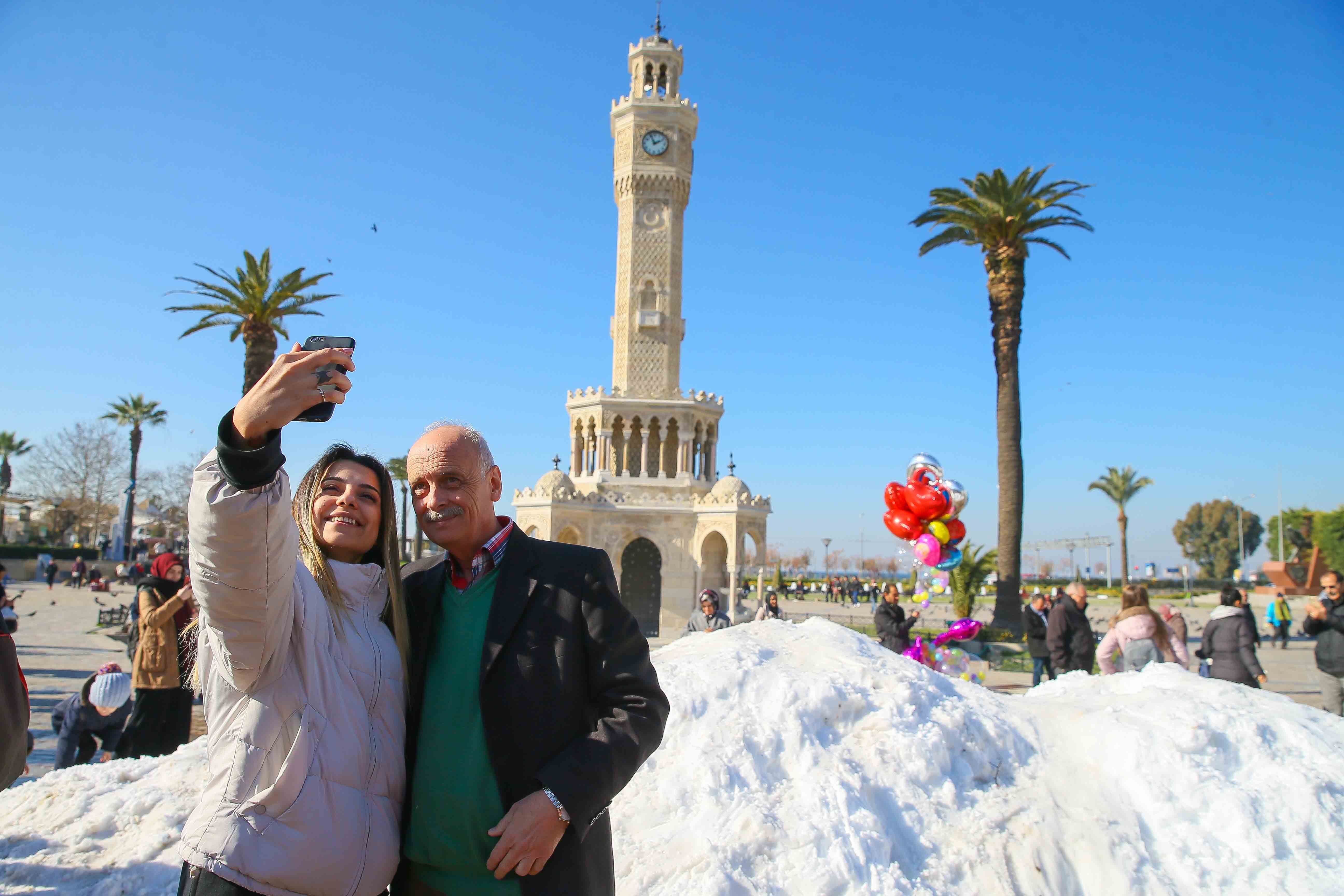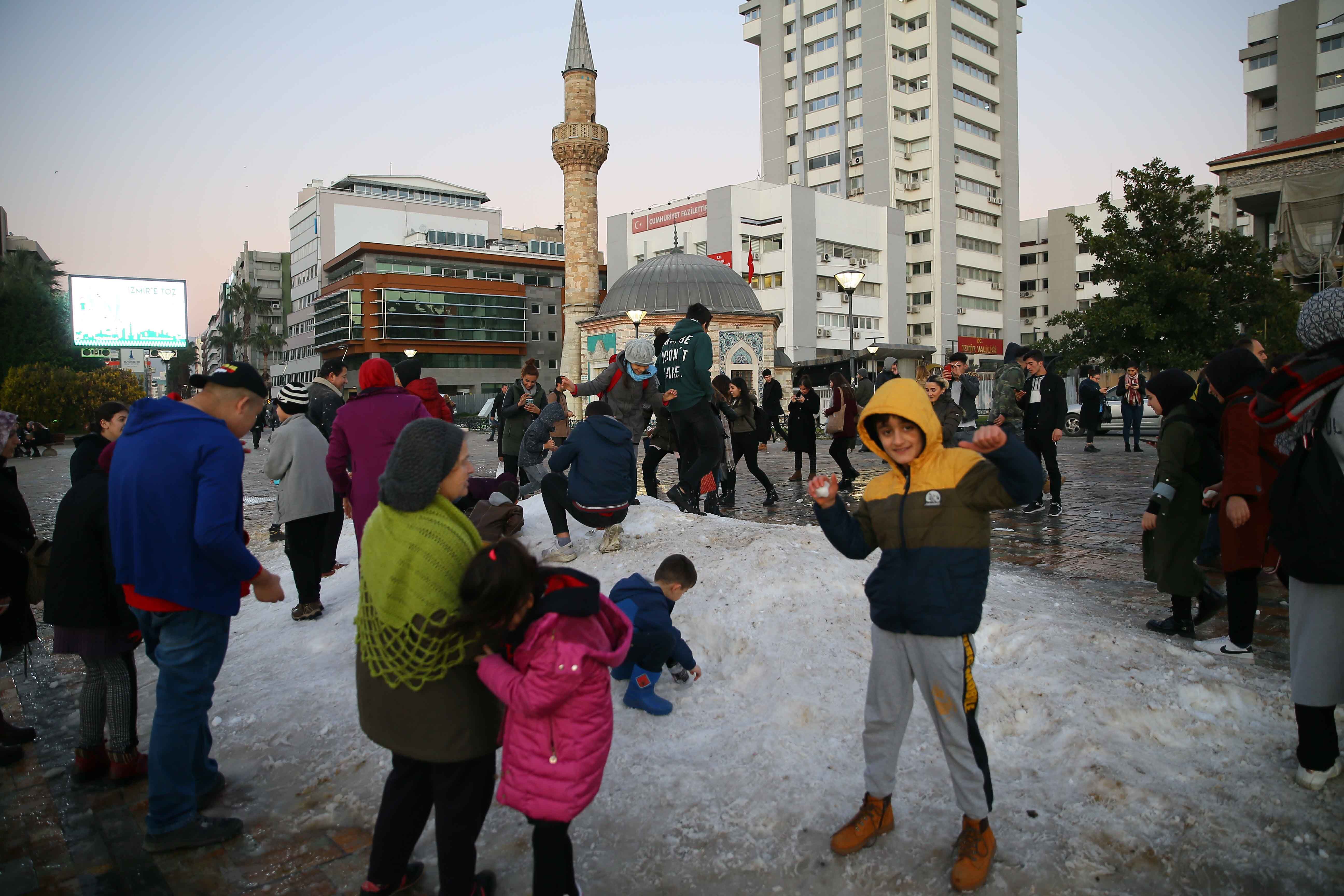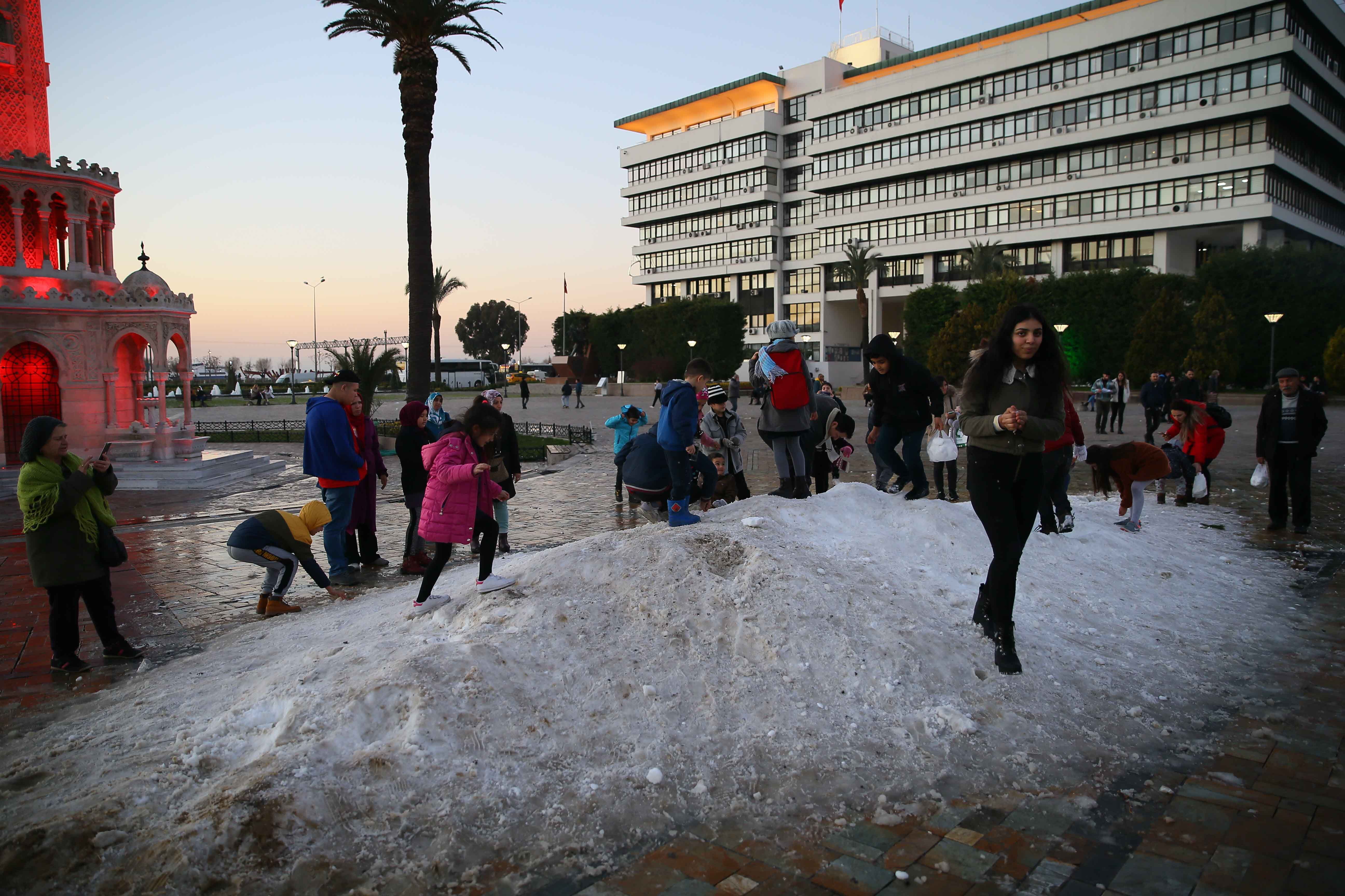 Belediye ekiplerince kamyonlarla taşınan kar, tarihi Saat Kulesi'nin bulunduğu Konak Meydanı'na döküldü. Bu sayede meydanda kar topu oynayıp kardan adam yapan çocuklar, eğlenceli vakit geçirdi. Çocuklara zaman zaman aileleri de katıldı. Minikler ve aileleri, bol bol hatıra fotoğrafı çektirdi.