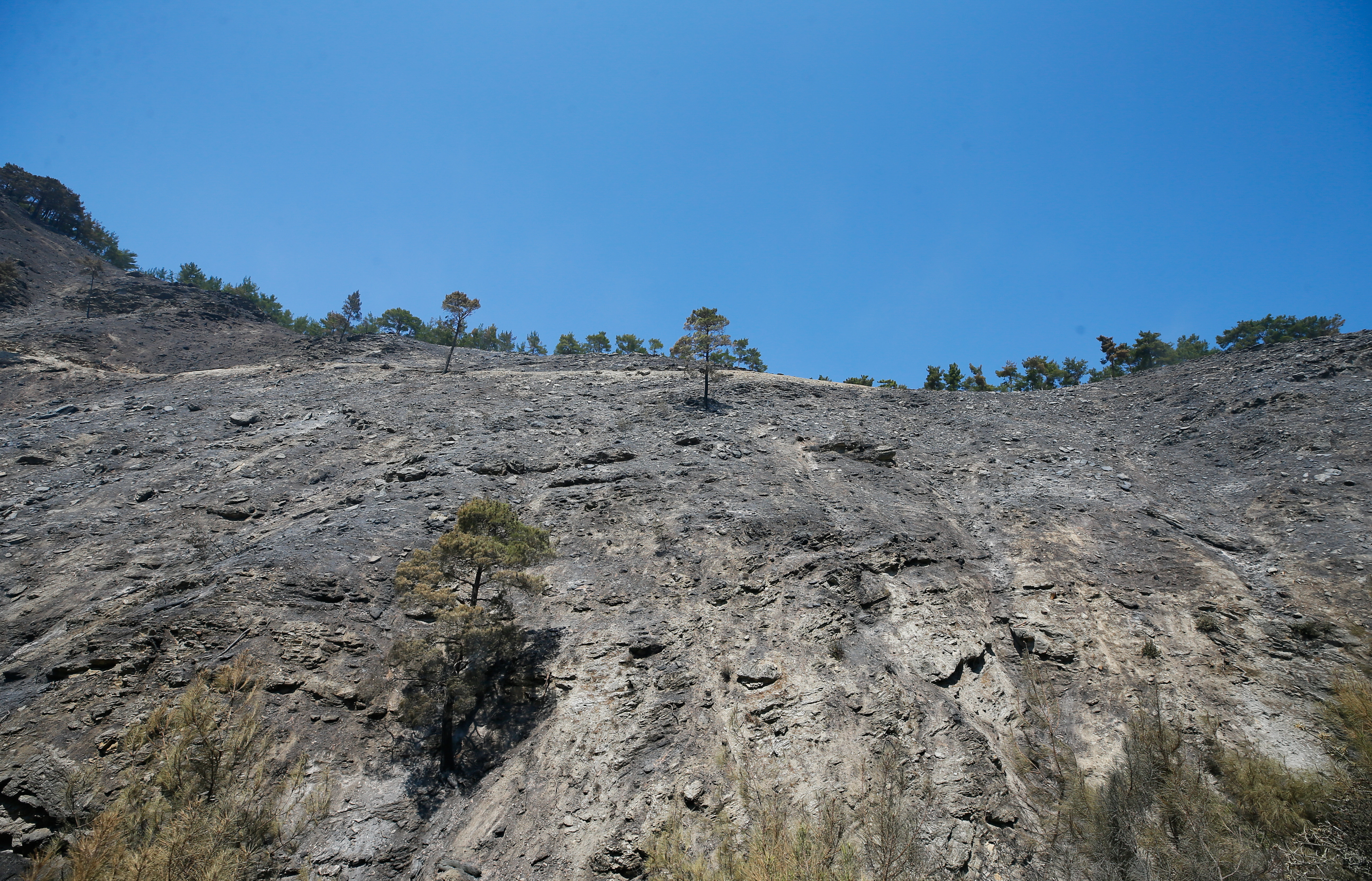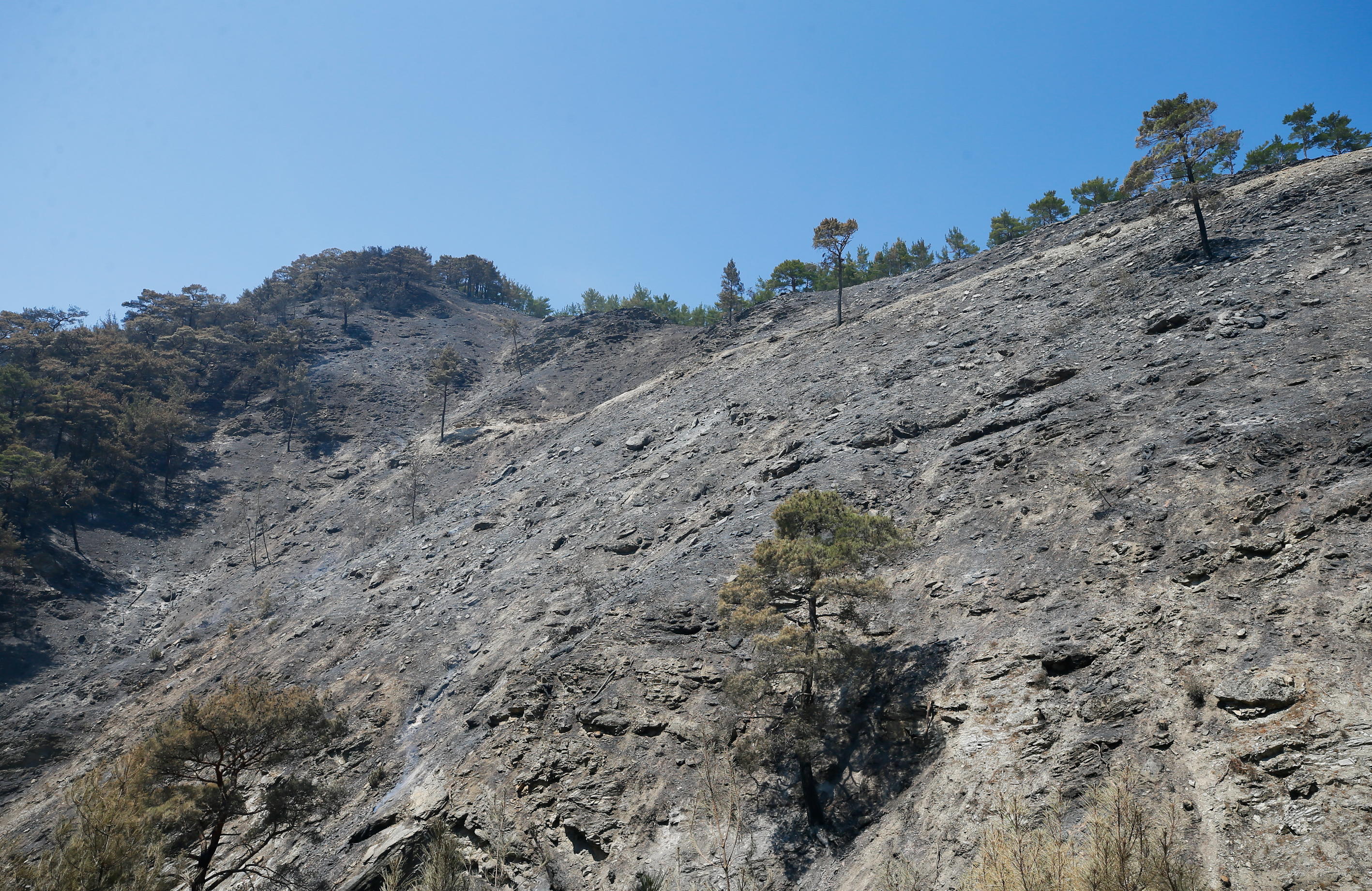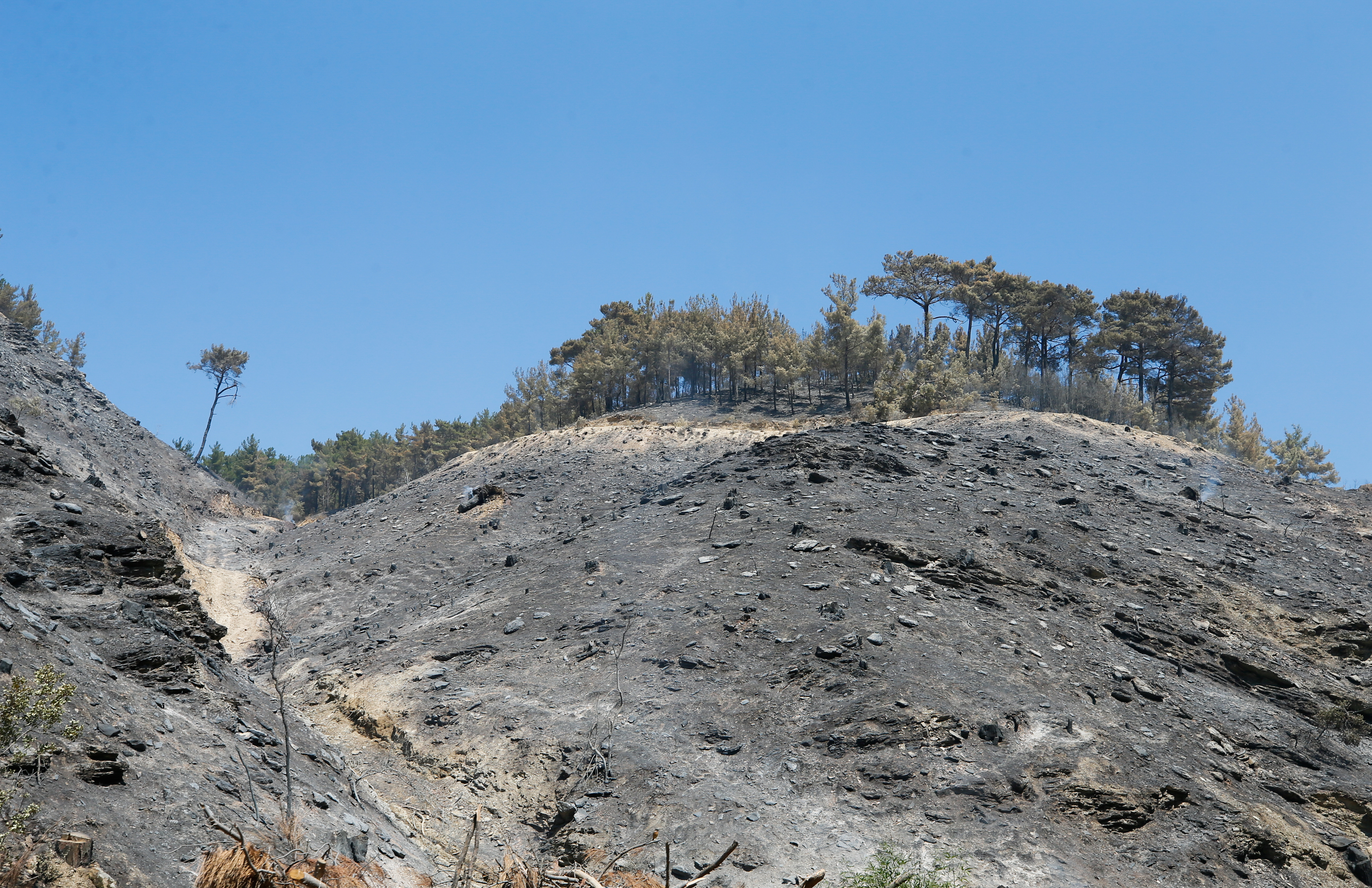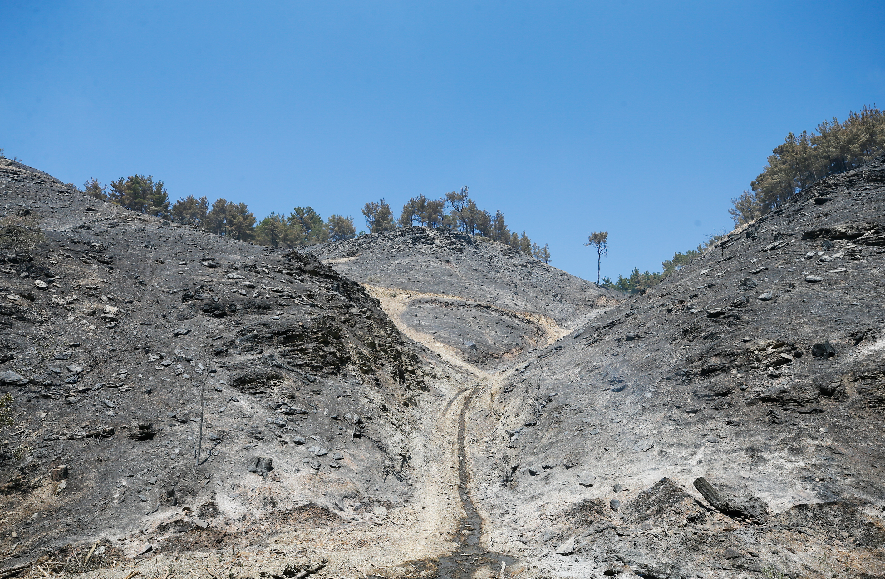 İzmir'in Karabağlar ilçesinde, geçen pazar günü çıkıp, şiddetli rüzgarın etkisiyle hızla büyüyen, 53 saat süren çabalar sonrasında kontrol altına alınan yangında soğutma çalışmalarına devam ediliyor. Bölgede nöbet bekleyen ekipler, zaman zaman tüten ve alev alan bölgelere anında müdahale edip söndürüyor. Bu arada 500 hektarlık alanda etkili olan yangında 50 yıllık çam ağaçları tamamen yandı, geriye ise kapkara, acı bir tablo kaldı.
