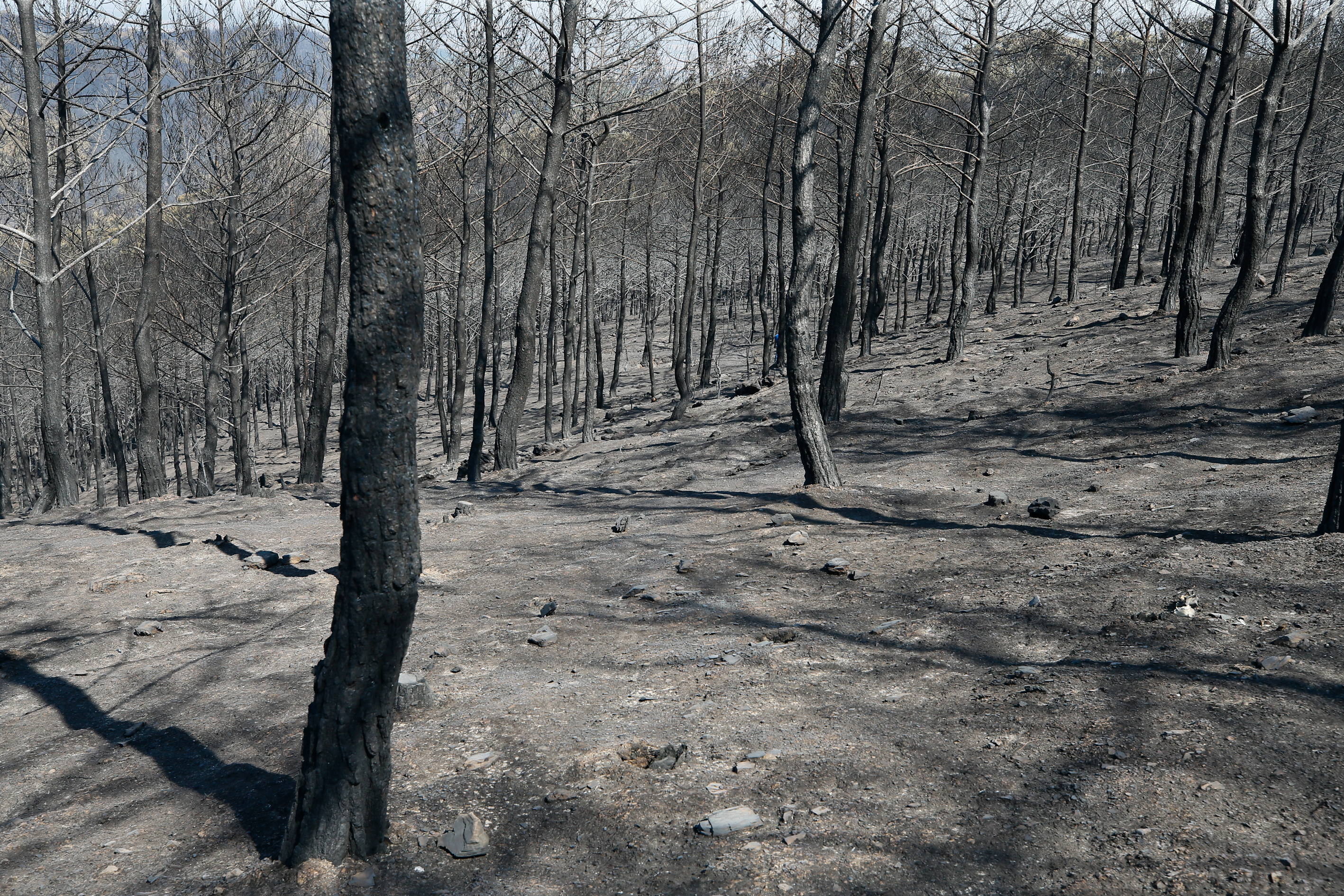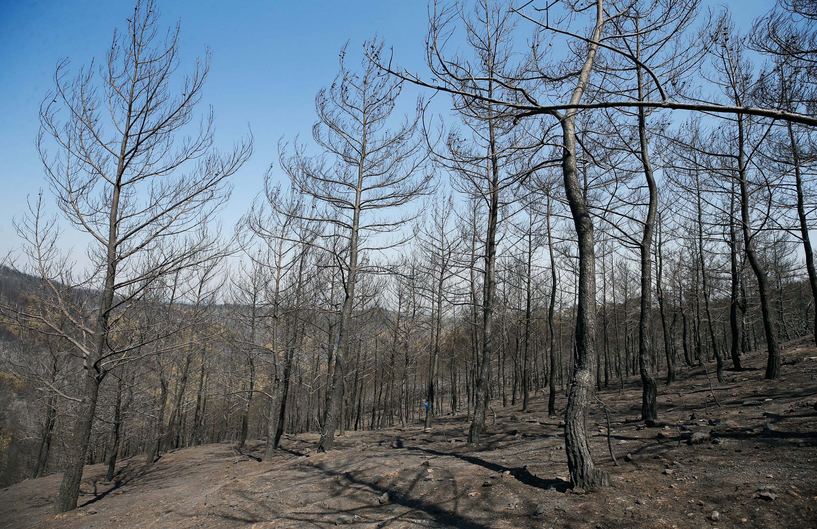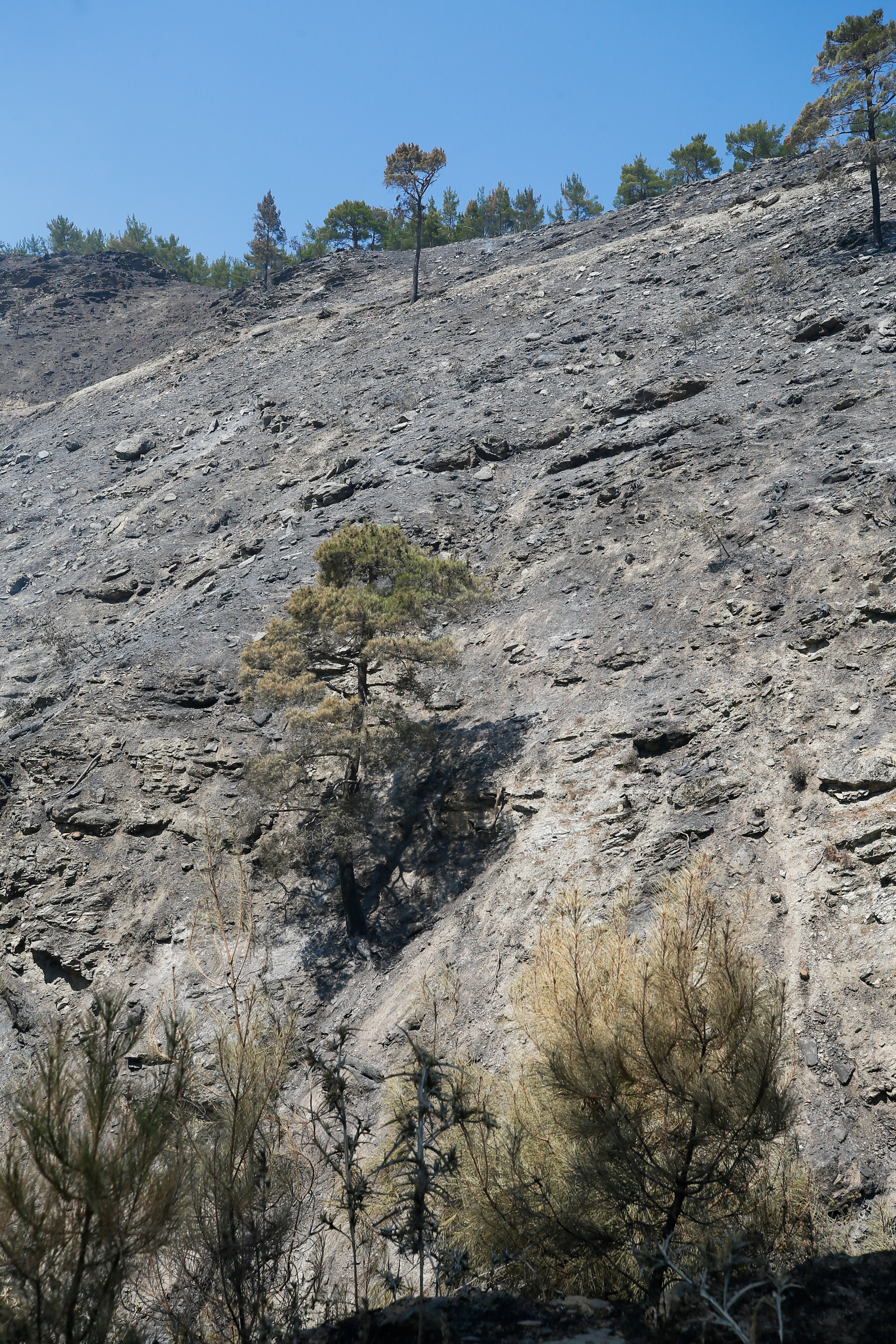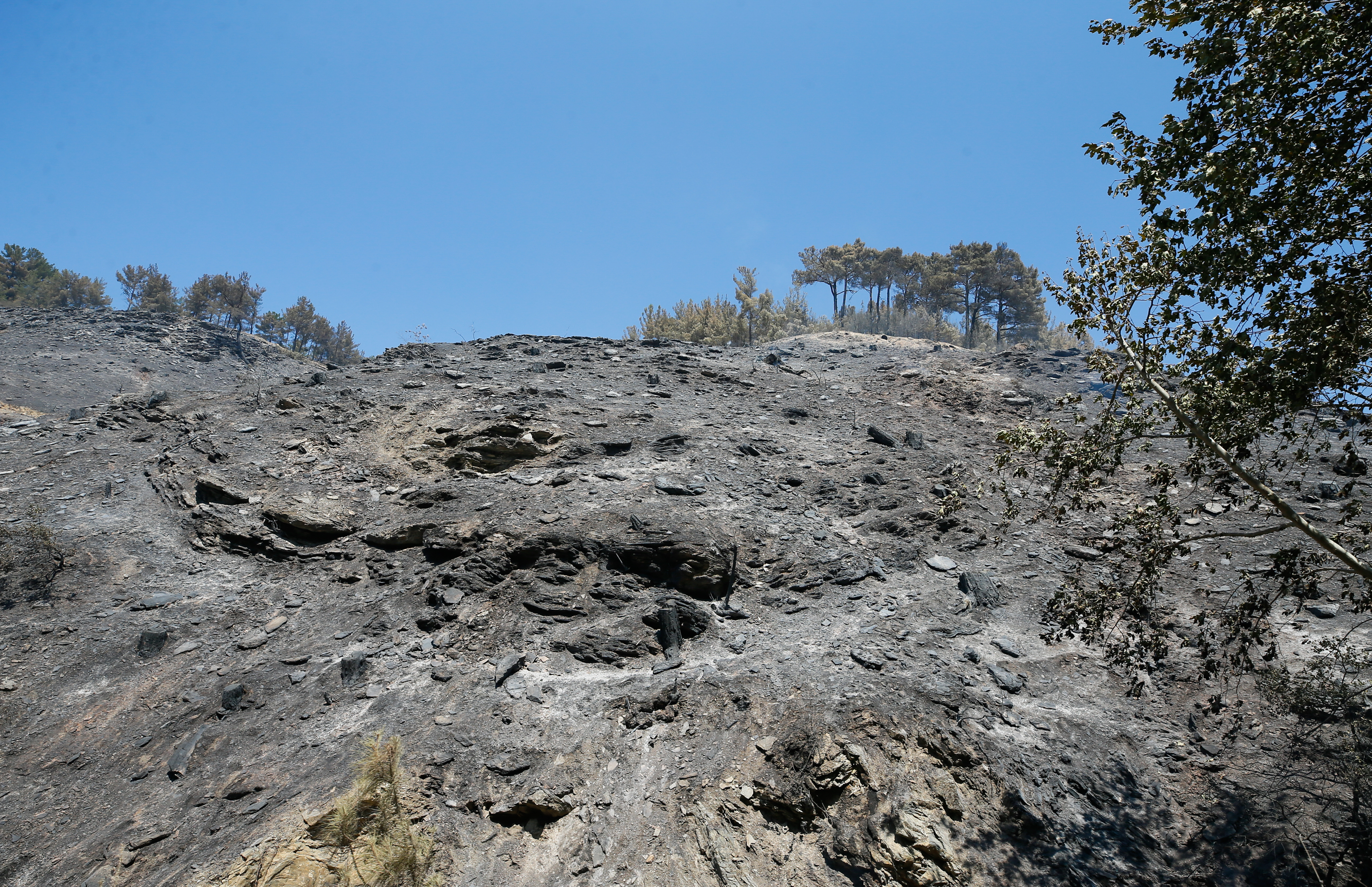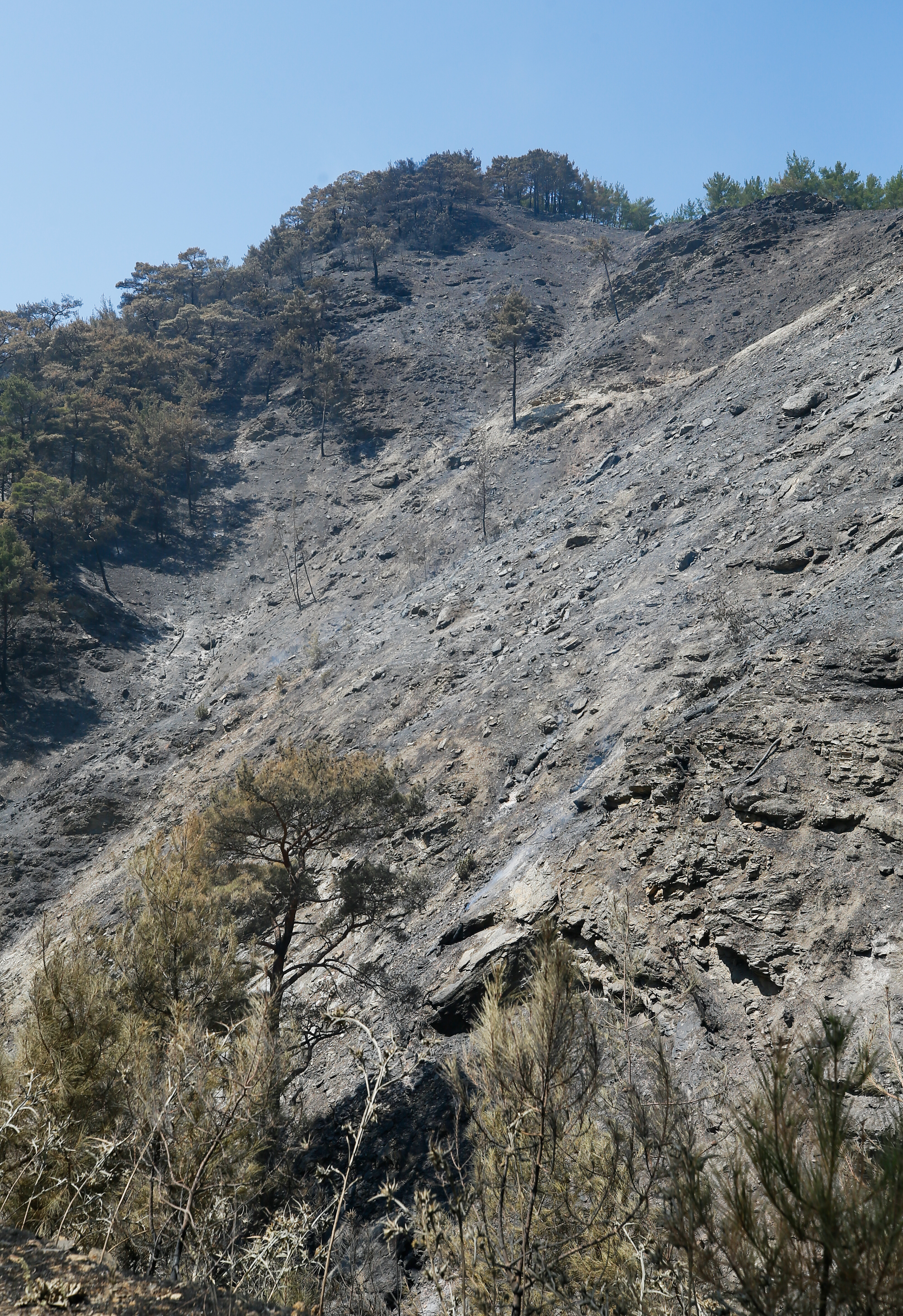 İzmir'in Karabağlar ilçesinde, geçen pazar günü çıkıp, şiddetli rüzgarın etkisiyle hızla büyüyen, 53 saat süren çabalar sonrasında kontrol altına alınan yangında soğutma çalışmalarına devam ediliyor. Bölgede nöbet bekleyen ekipler, zaman zaman tüten ve alev alan bölgelere anında müdahale edip söndürüyor. Bu arada 500 hektarlık alanda etkili olan yangında 50 yıllık çam ağaçları tamamen yandı, geriye ise kapkara, acı bir tablo kaldı.
