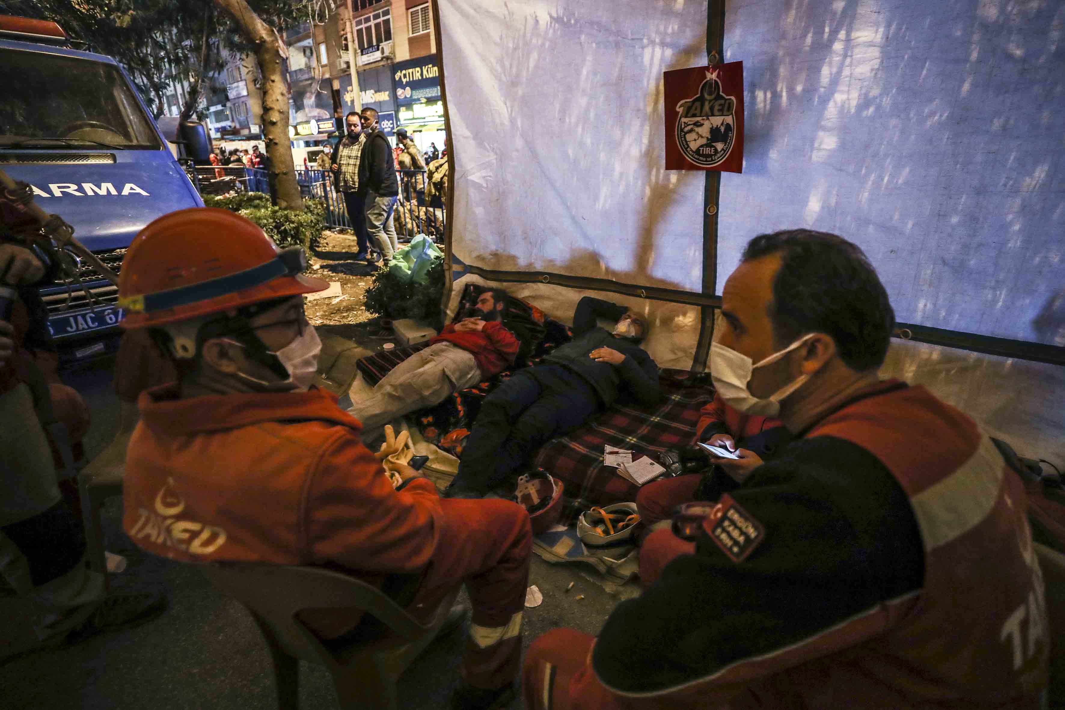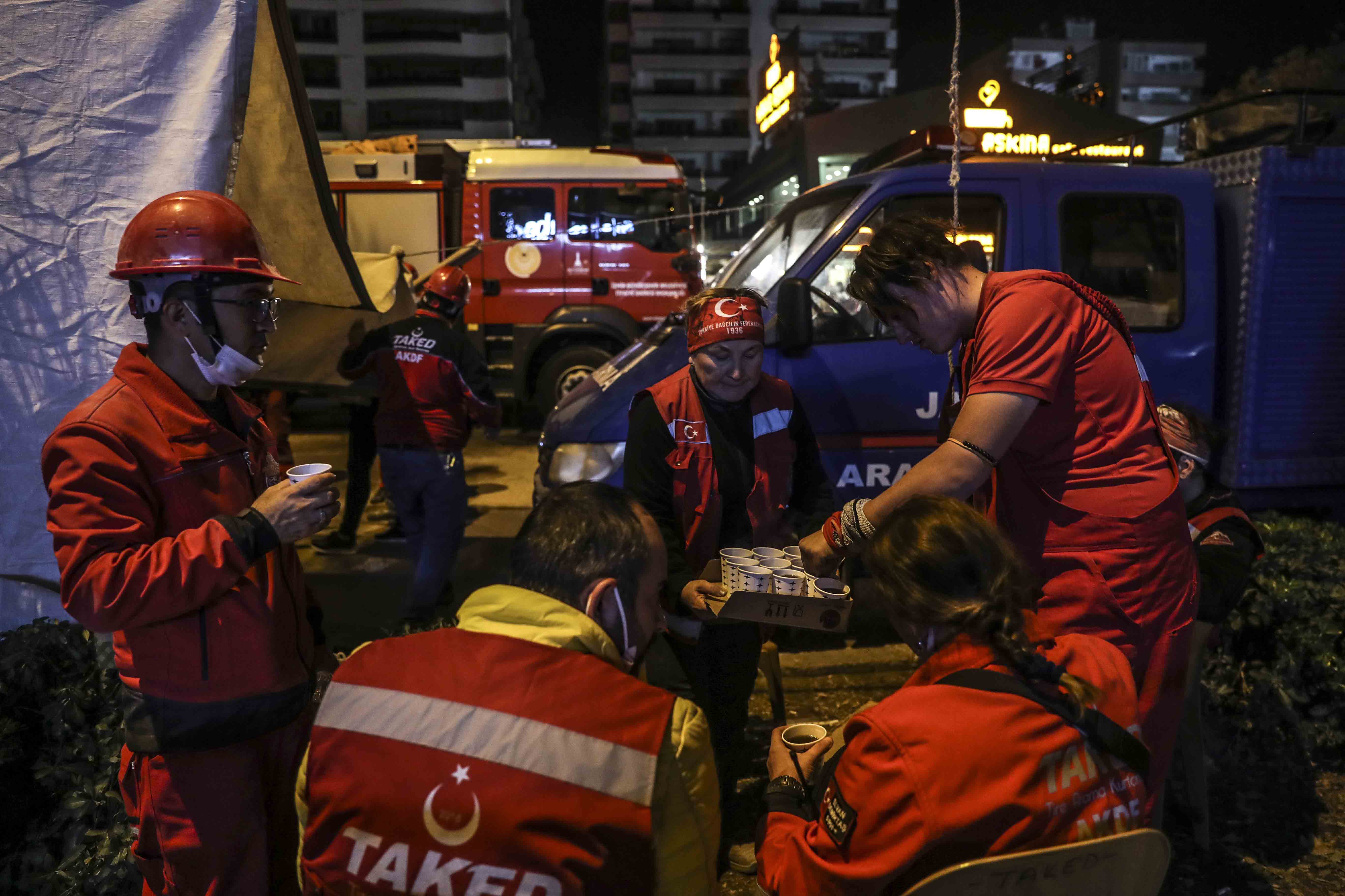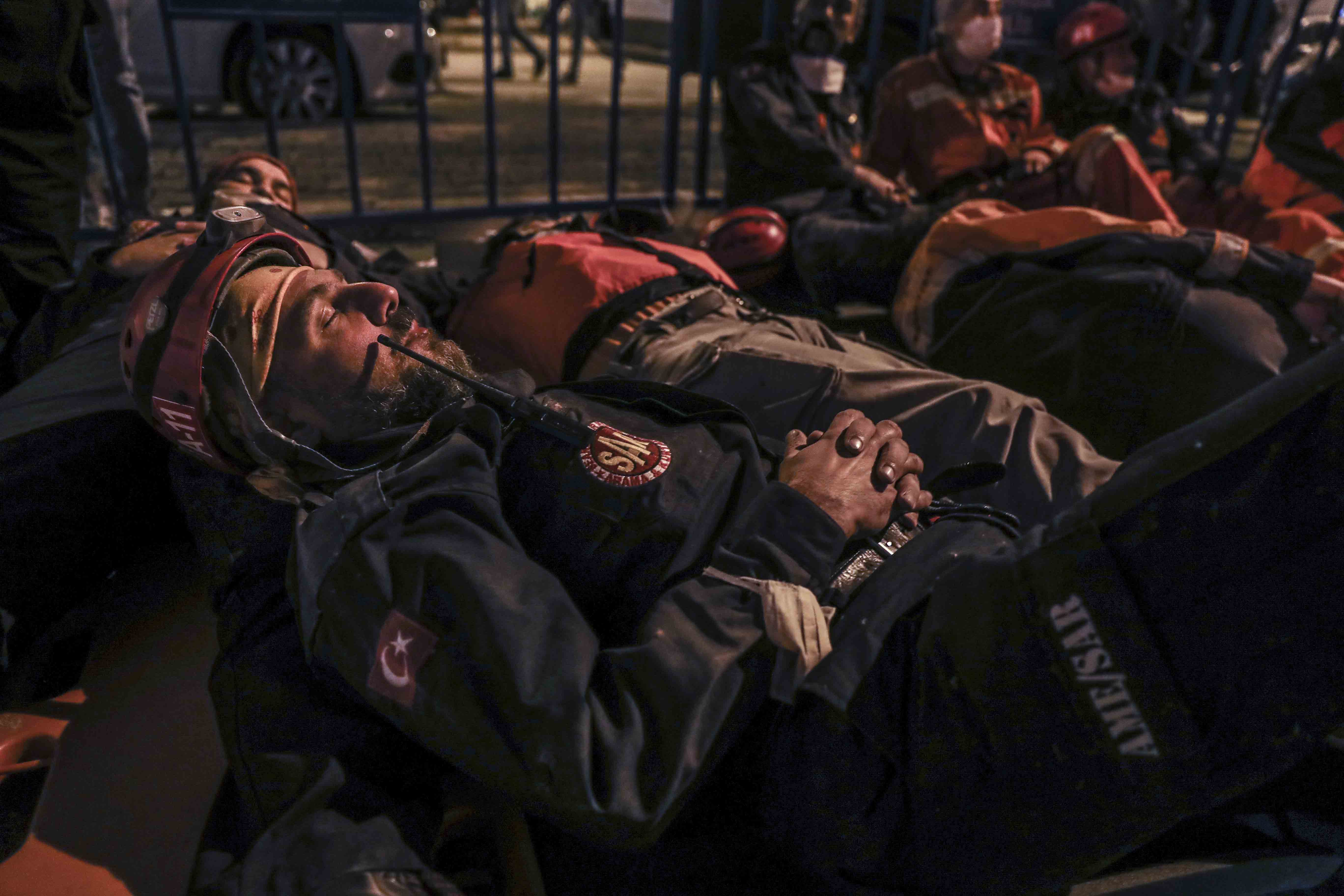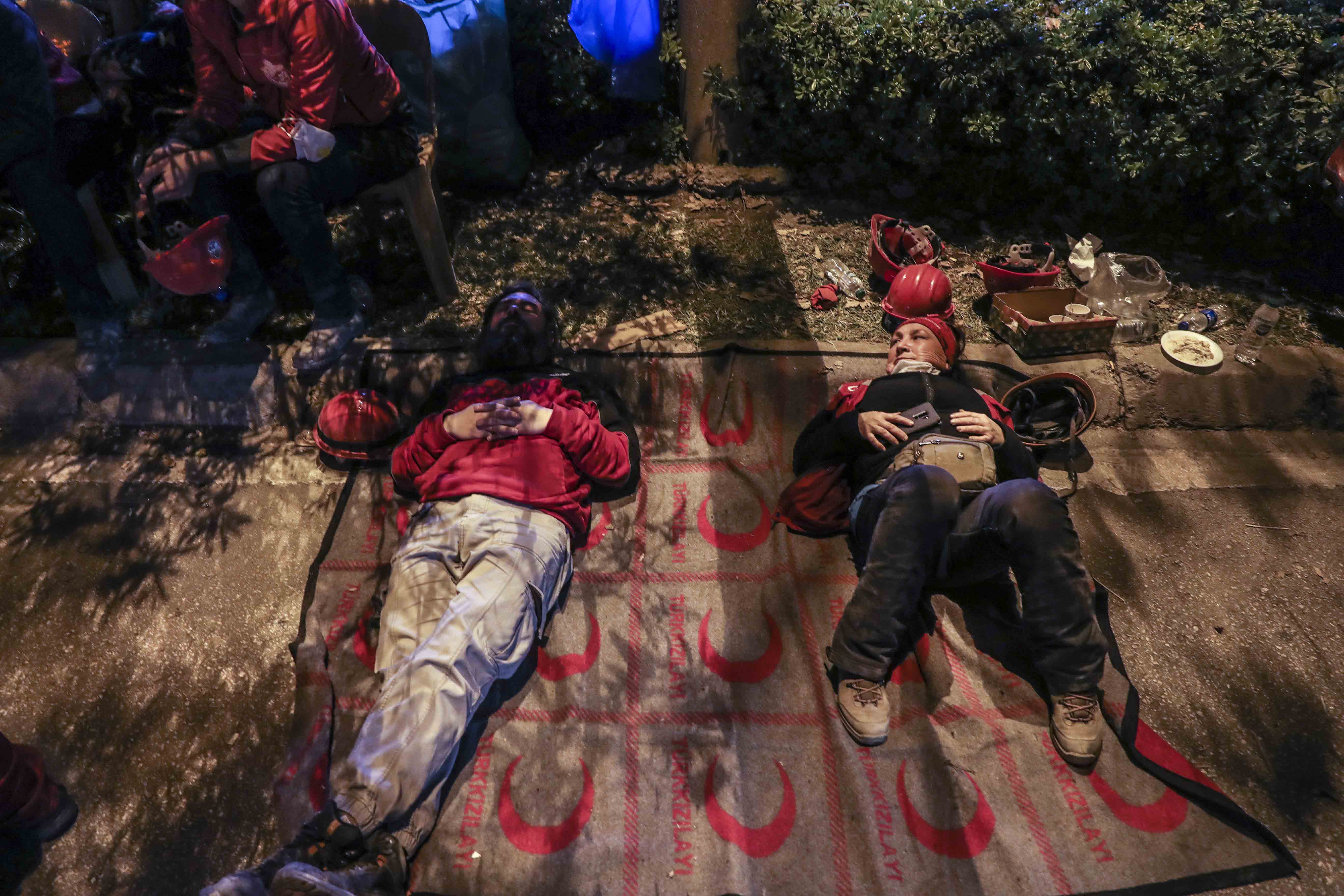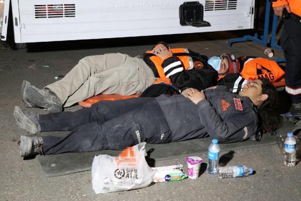 Dönüşümlü olarak çalışan ekipler, arama kurtarma faaliyetlerinin sürdüğü alanda dinlenmeye çalışıyor.