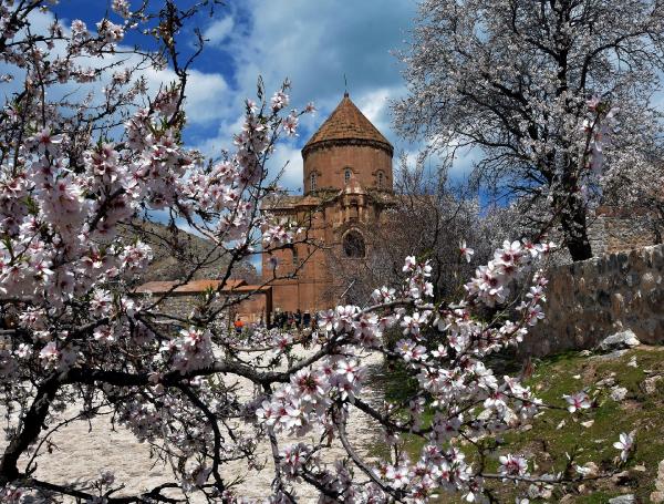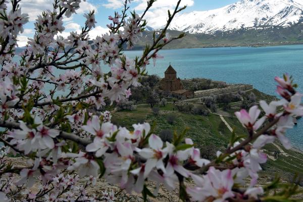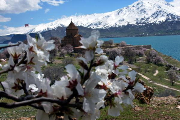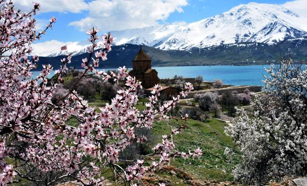 Van'ın Gevaş ilçesindeki, kentin önemli turistik değerlerinden biri olan Akdamar Adası, badem ağaçlarının çiçek açmasıyla birlikte pembe ve beyaza büründü. Turkuaz mavisi Van Gölü'nün ortasında, çevredeki karlı dağlar ve çiçek açan badem ağaçları, adaya gelen ziyaretçilere doyumsuz bir manzara sunuyor.