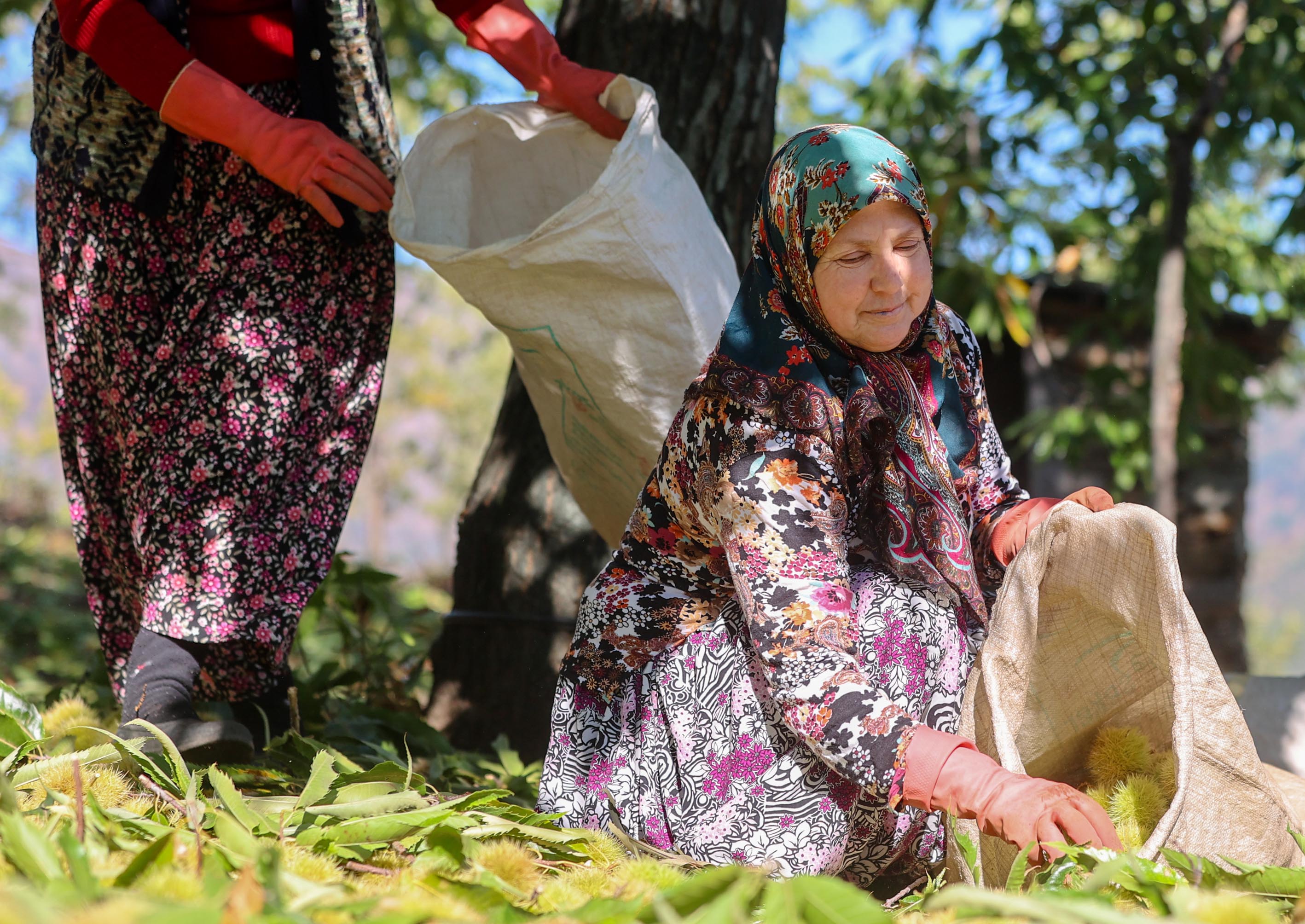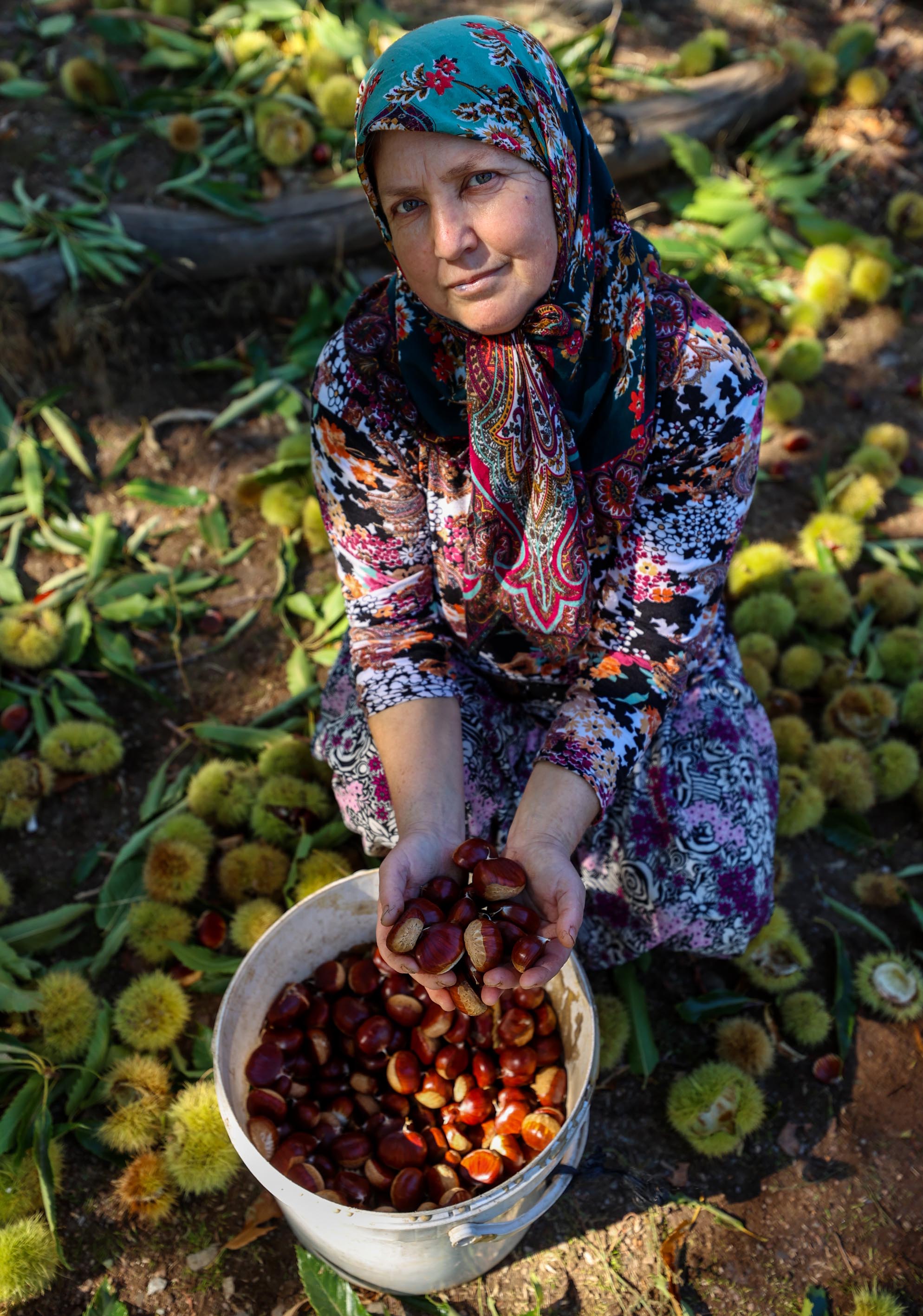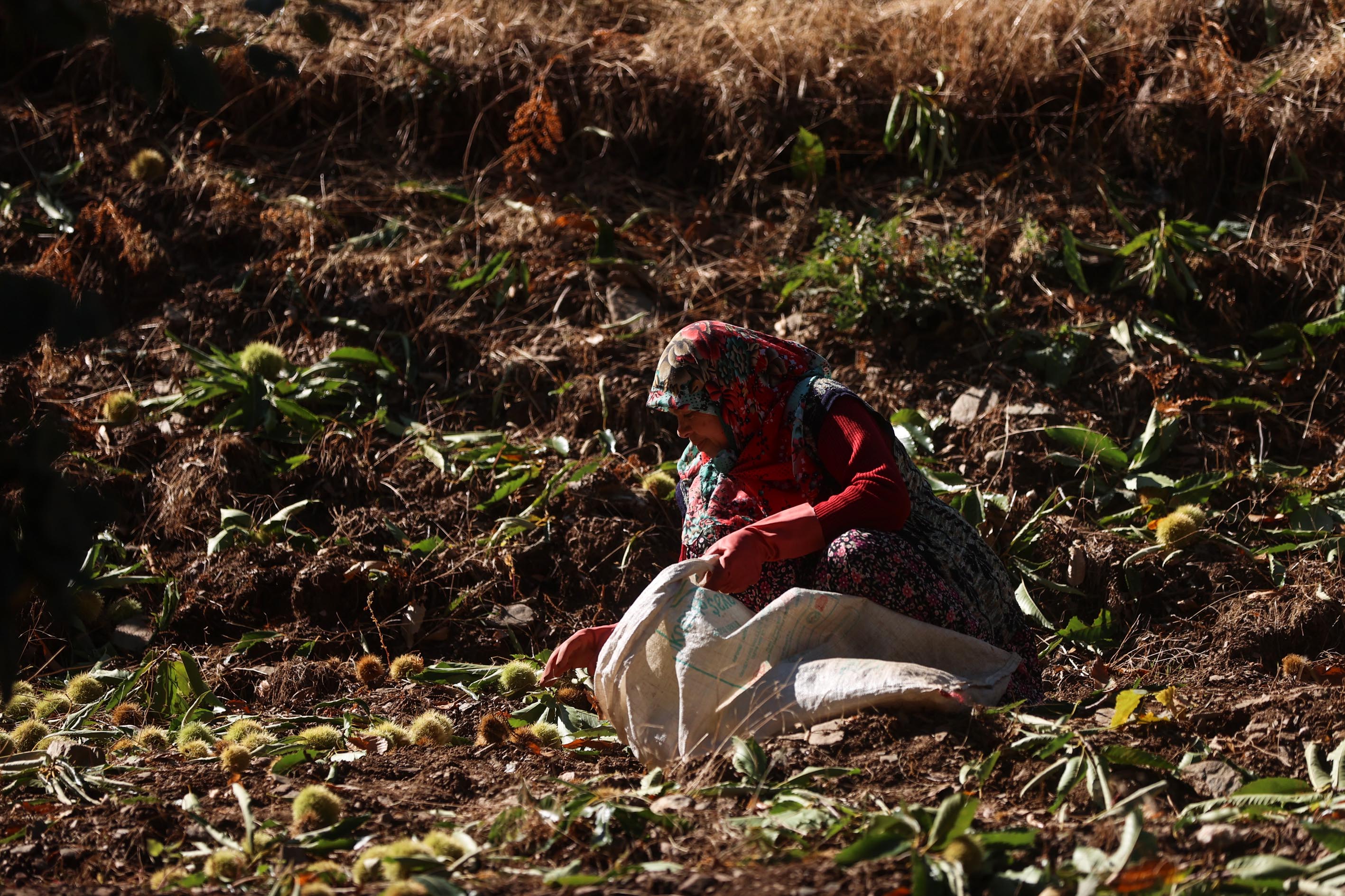 Ağaçlardaki kestanelerin tamamının yere düşürülmesinin ardından devreye kadınlar giriyor. Dışı dikenli olduğu için eldiven giyen kadınlar, bazı yerleri dik olan dağ yamaçlarında kestaneleri tek tek topluyor.