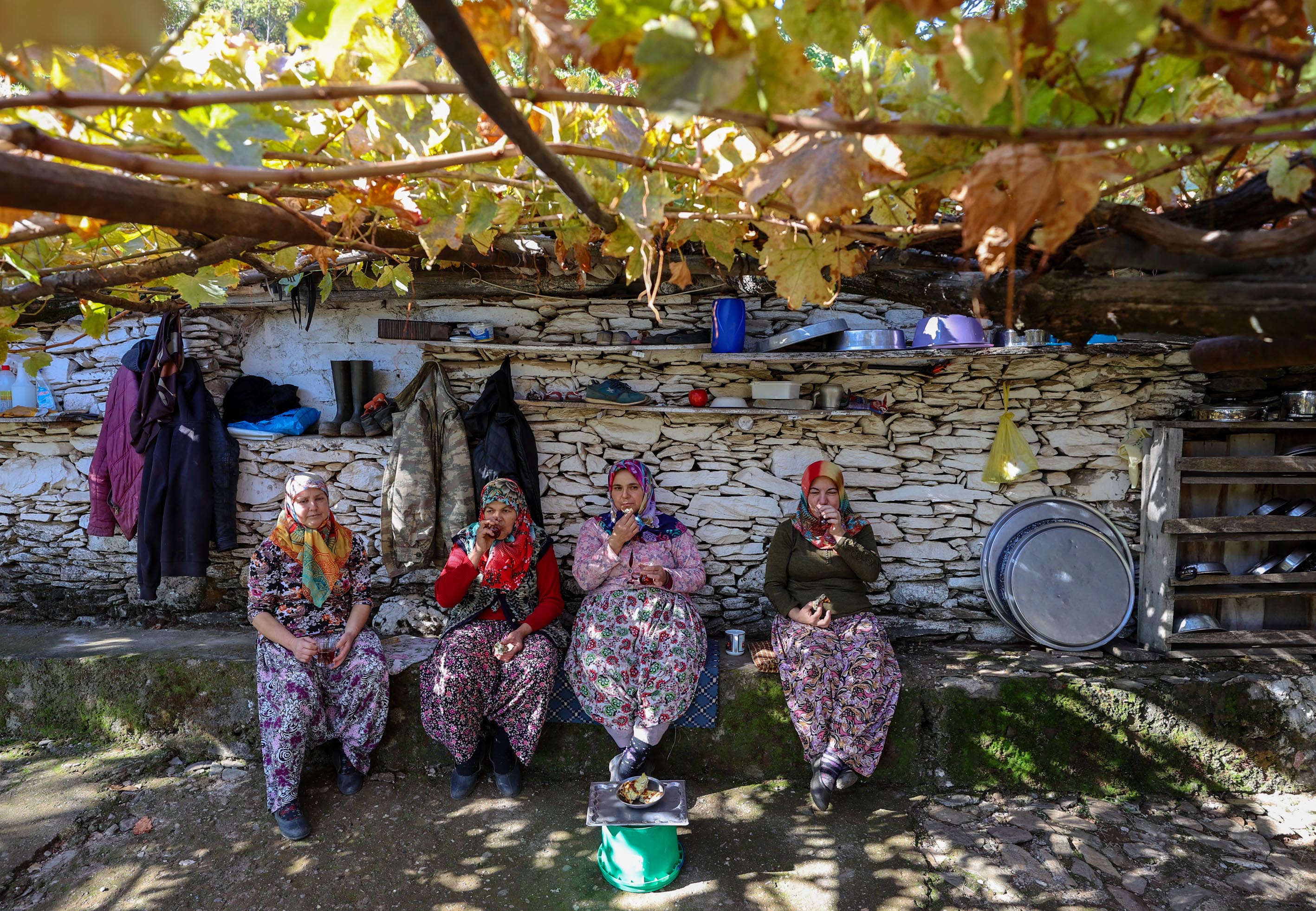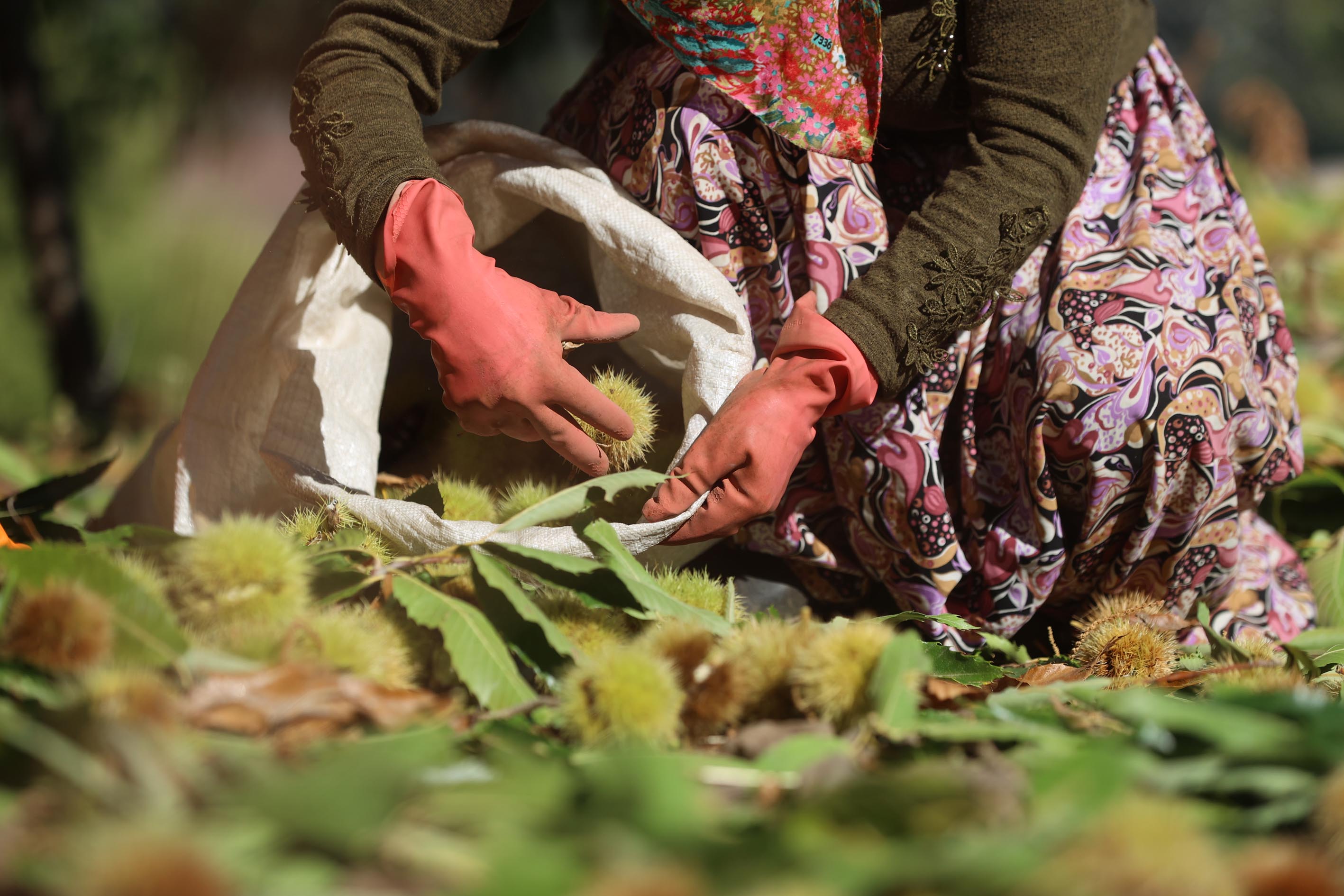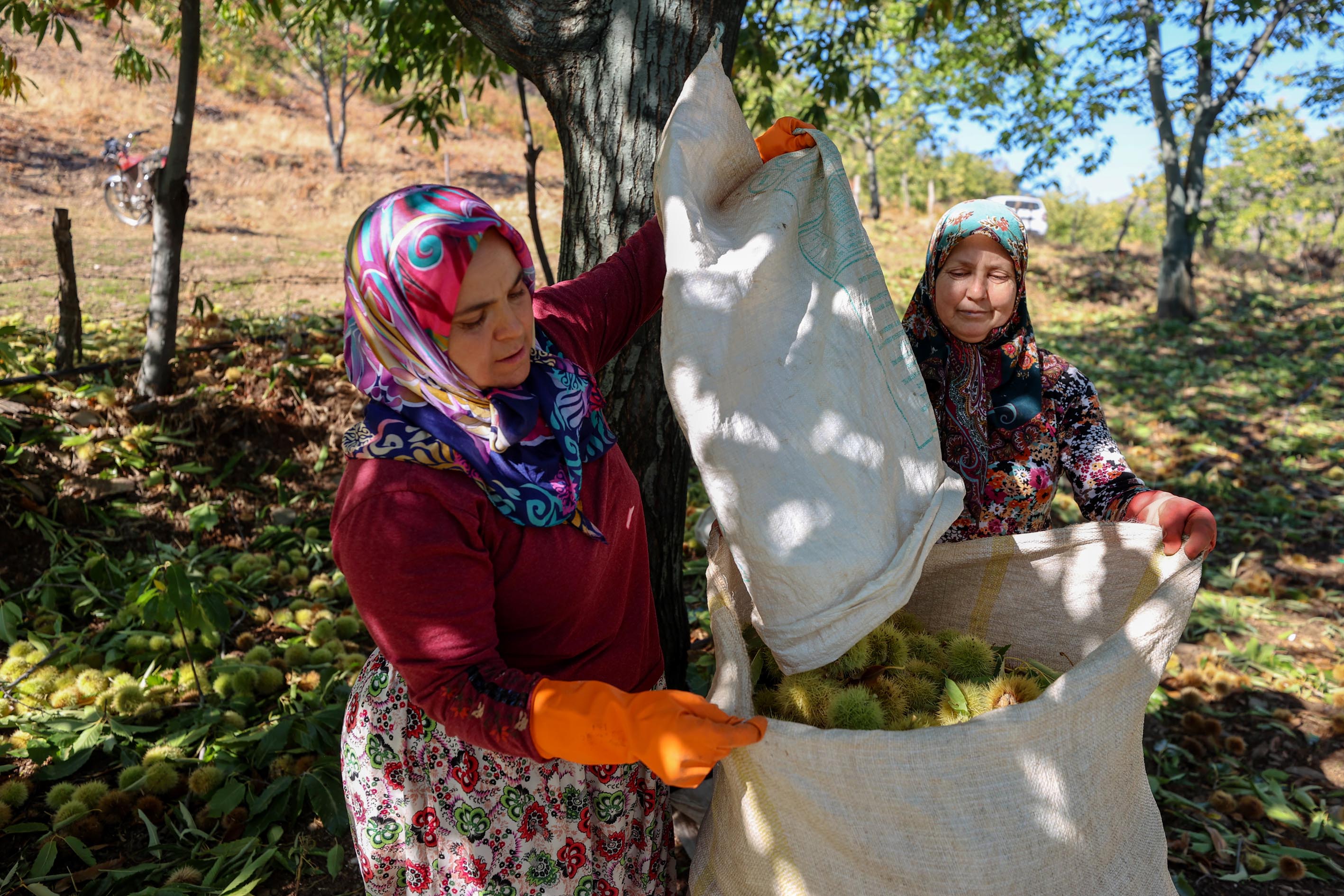 Ağaçlardaki kestanelerin tamamının yere düşürülmesinin ardından devreye kadınlar giriyor. Dışı dikenli olduğu için eldiven giyen kadınlar, bazı yerleri dik olan dağ yamaçlarında kestaneleri tek tek topluyor.