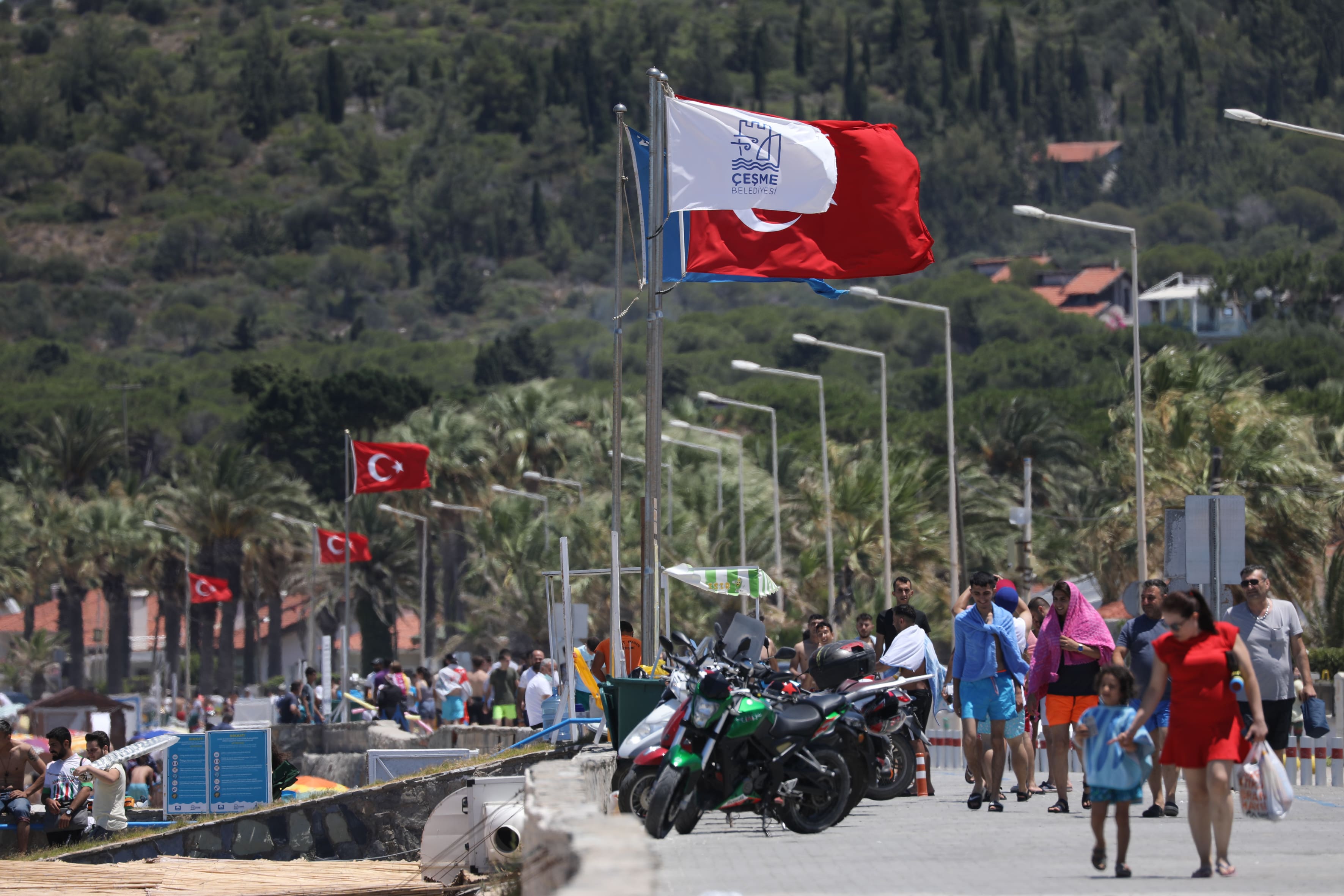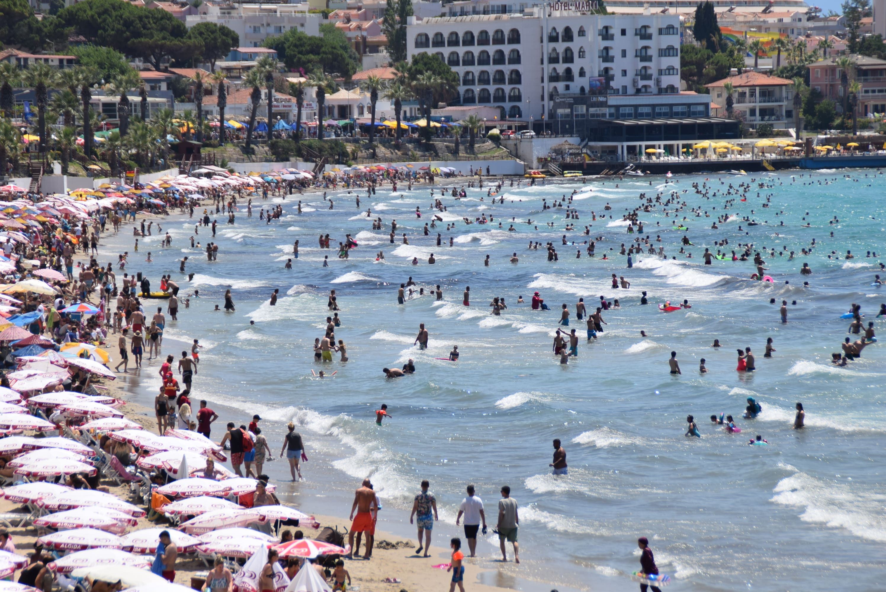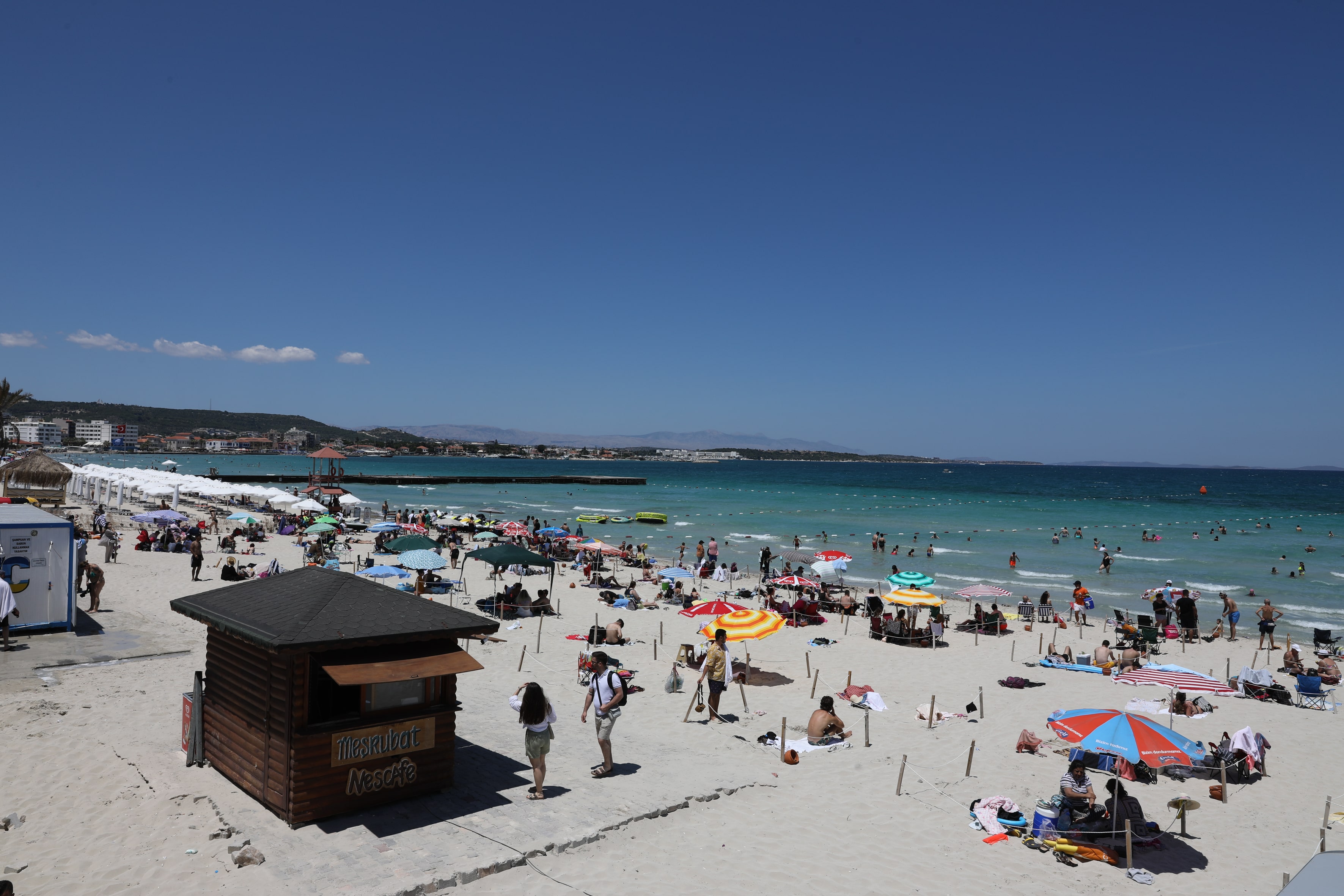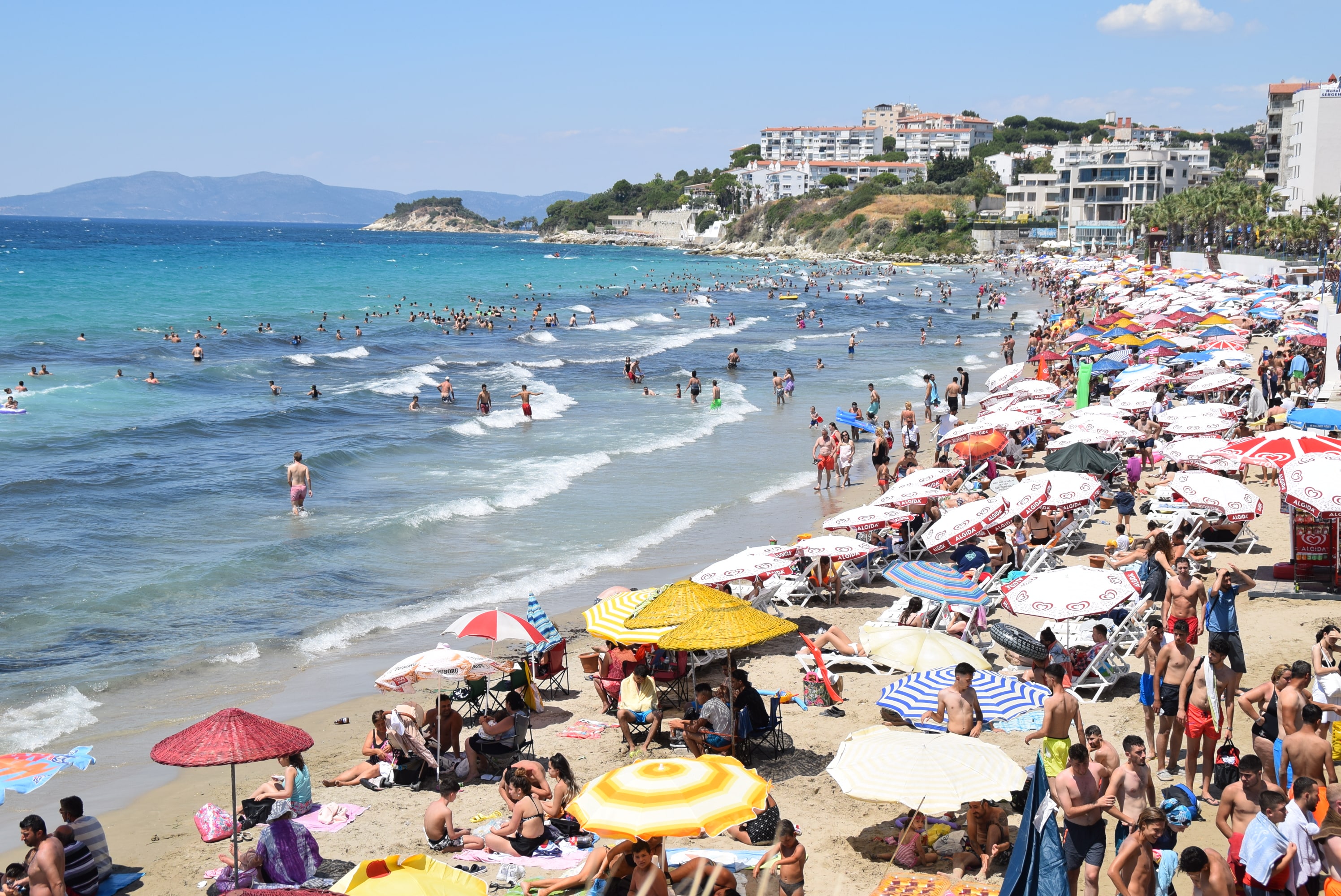 Sabahın erken saatlerinden itibaren Çeşme sahillerine gelenler denizin keyfini çıkardı. Plaj şemsiyeleriyle güneşten korunmaya çalışan tatilciler, sık sık denize girerek serinlemeye çalıştı.