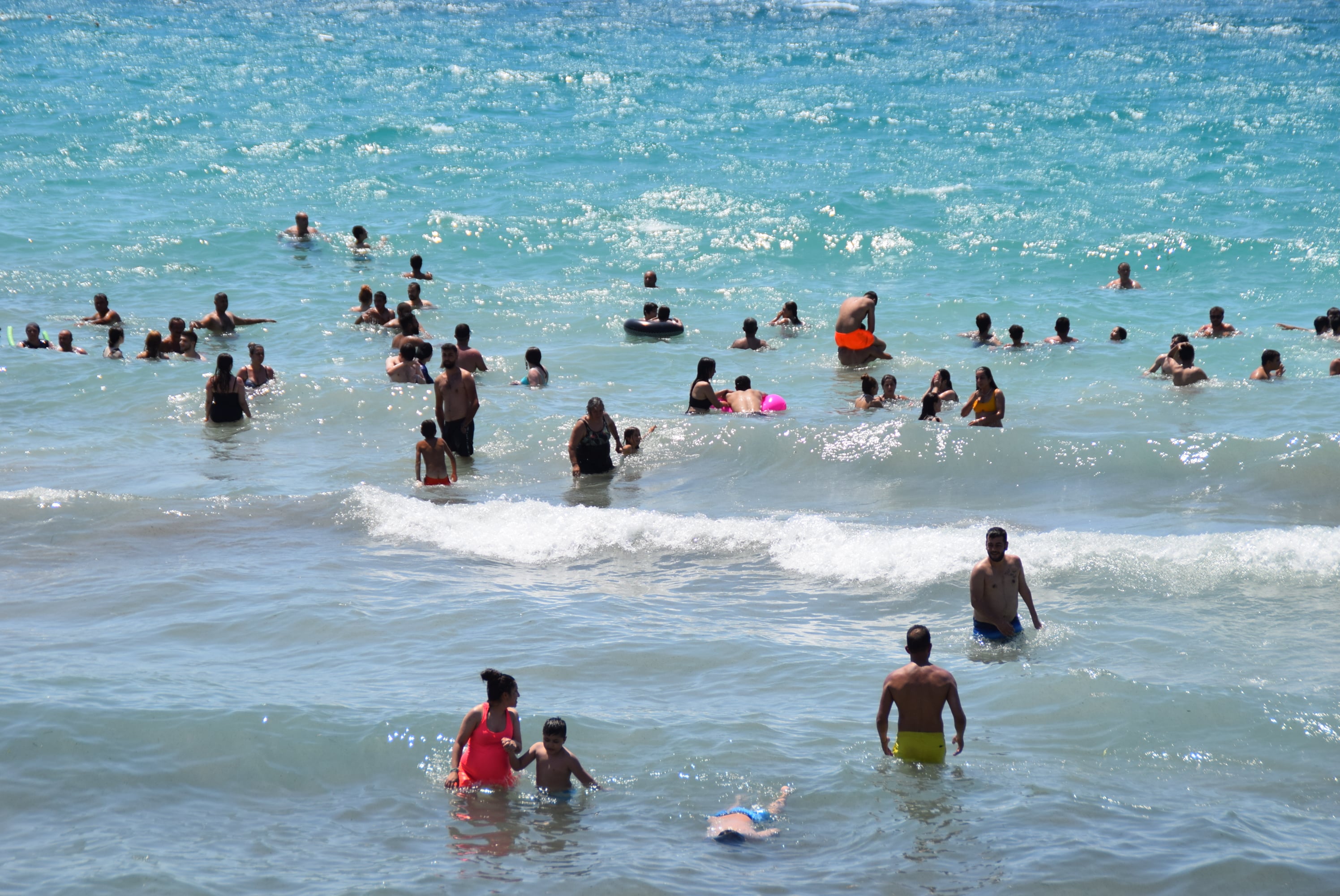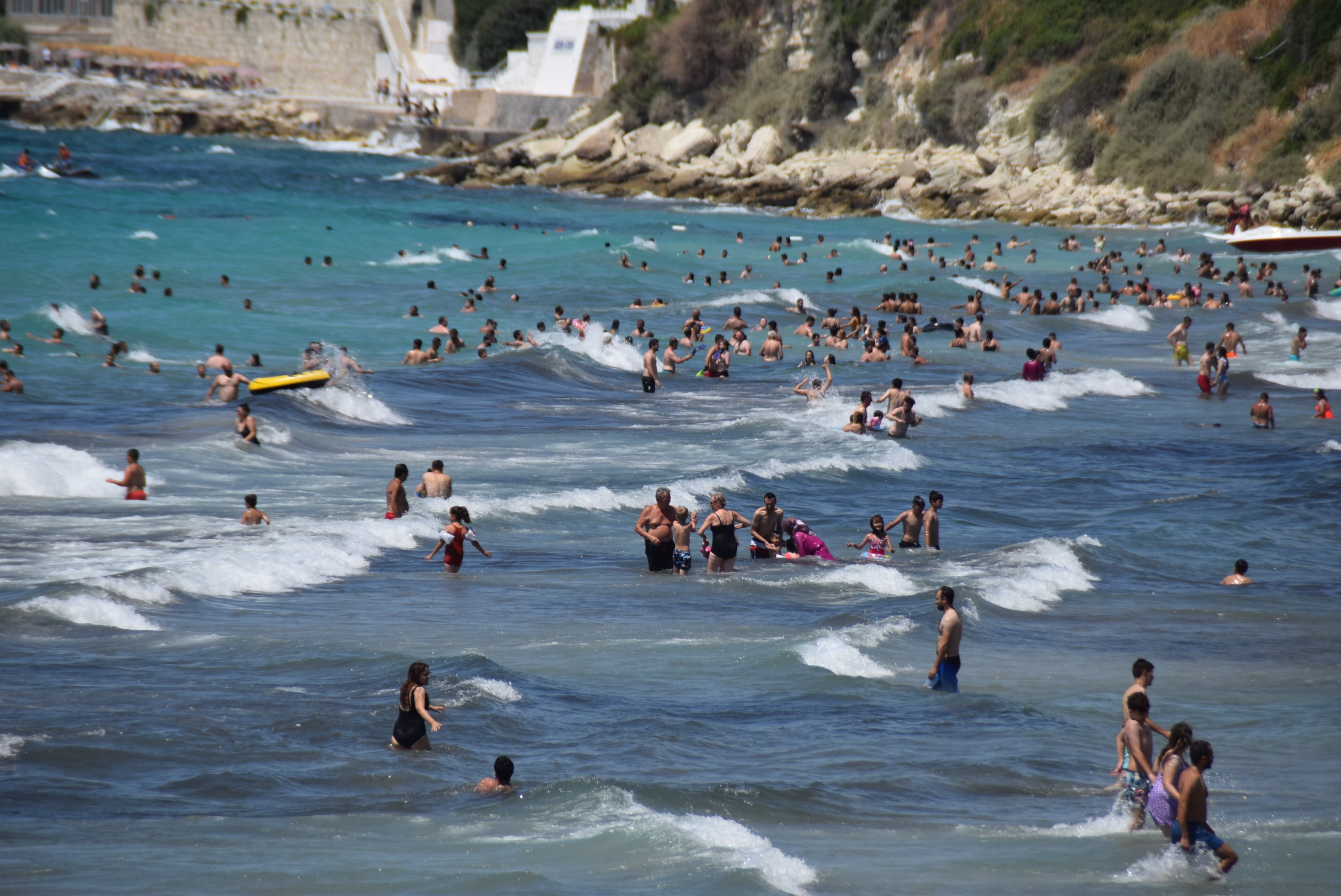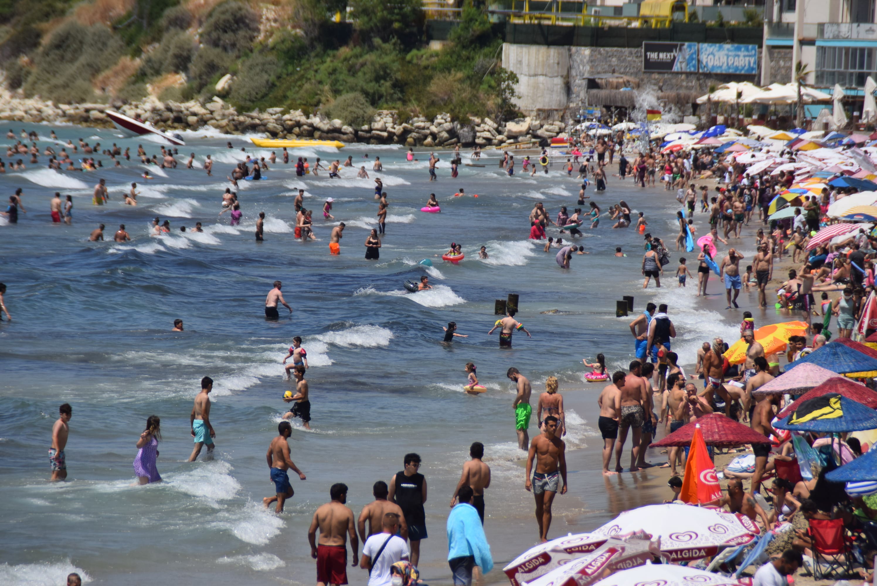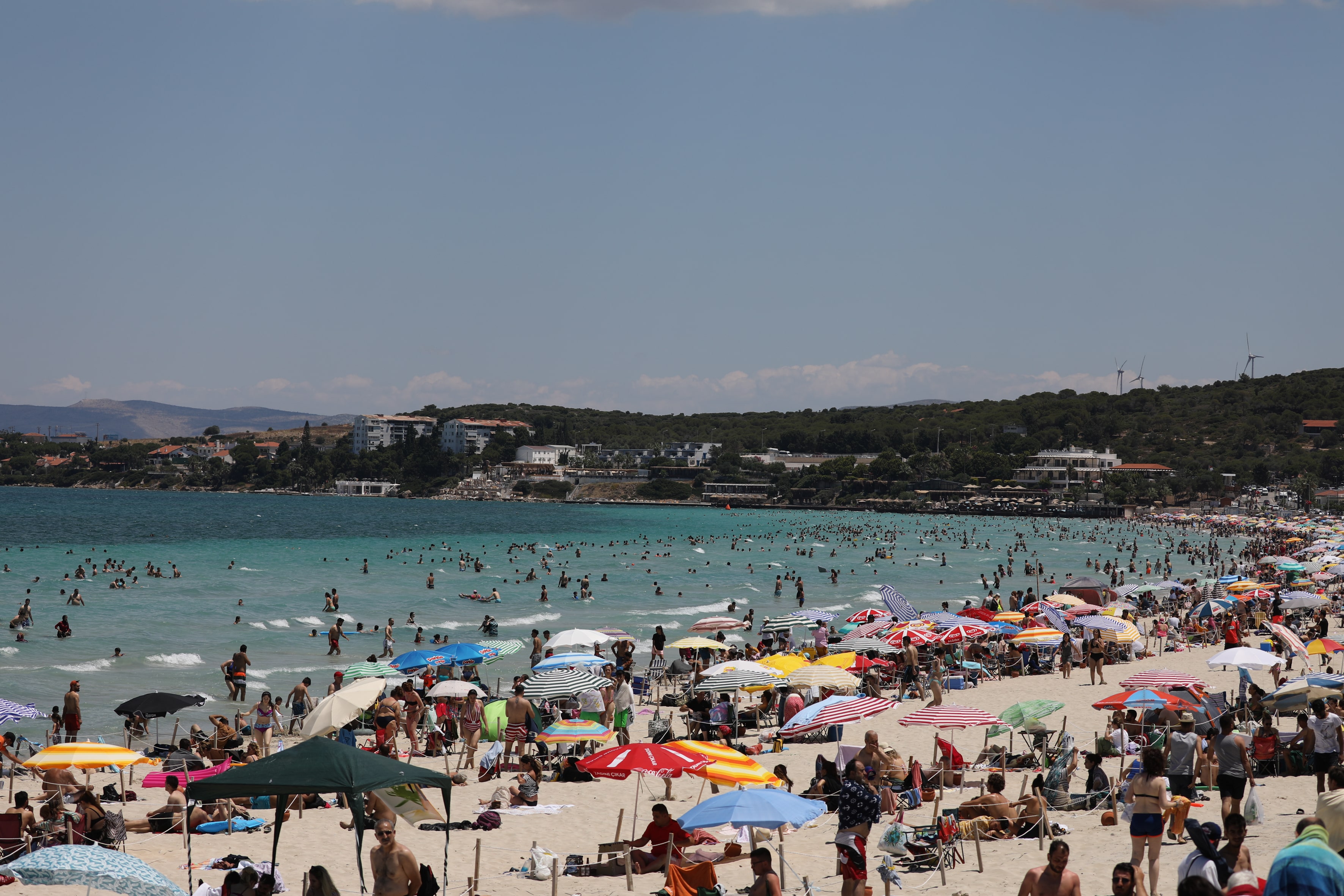 Sabahın erken saatlerinden itibaren Çeşme sahillerine gelenler denizin keyfini çıkardı. Plaj şemsiyeleriyle güneşten korunmaya çalışan tatilciler, sık sık denize girerek serinlemeye çalıştı.