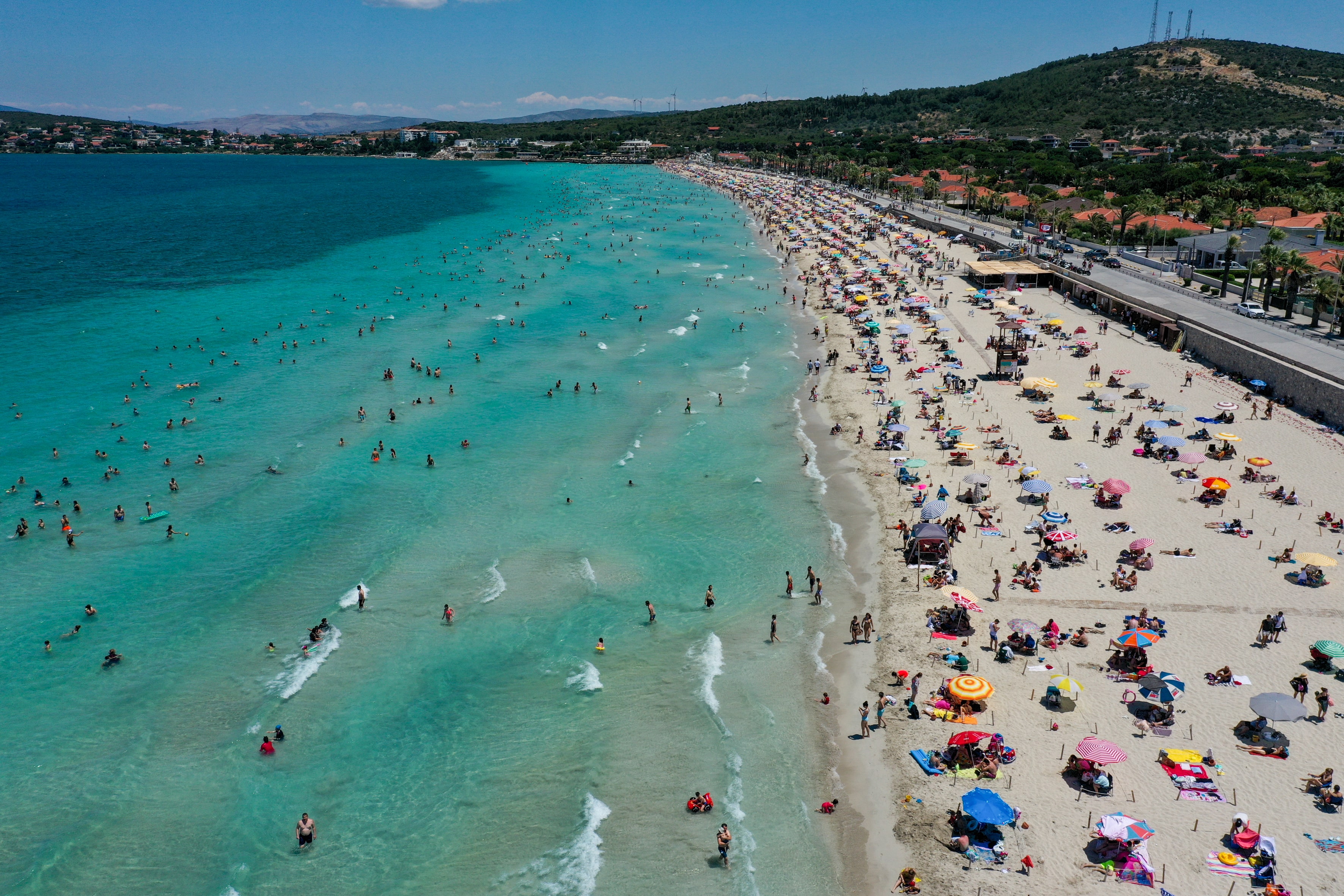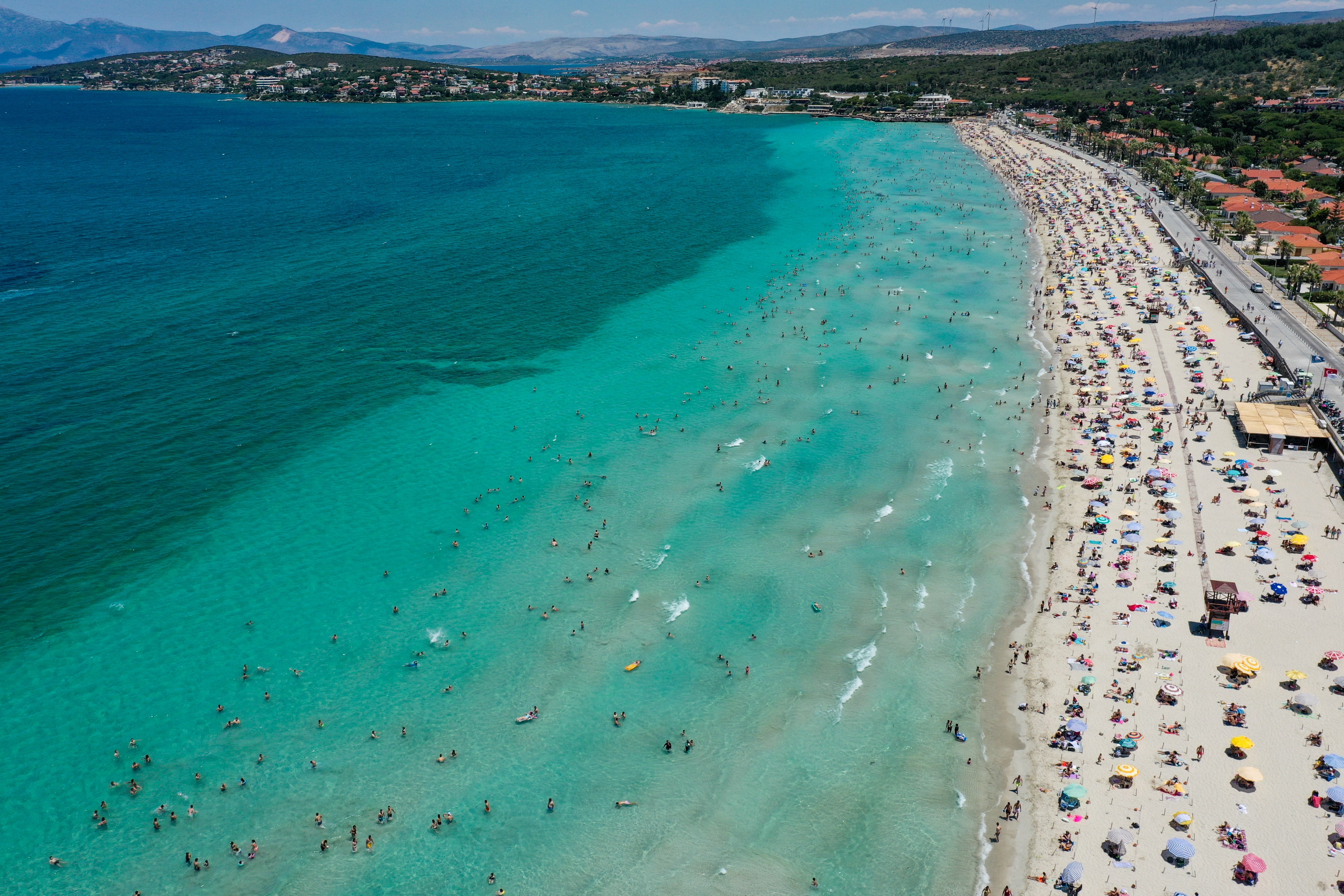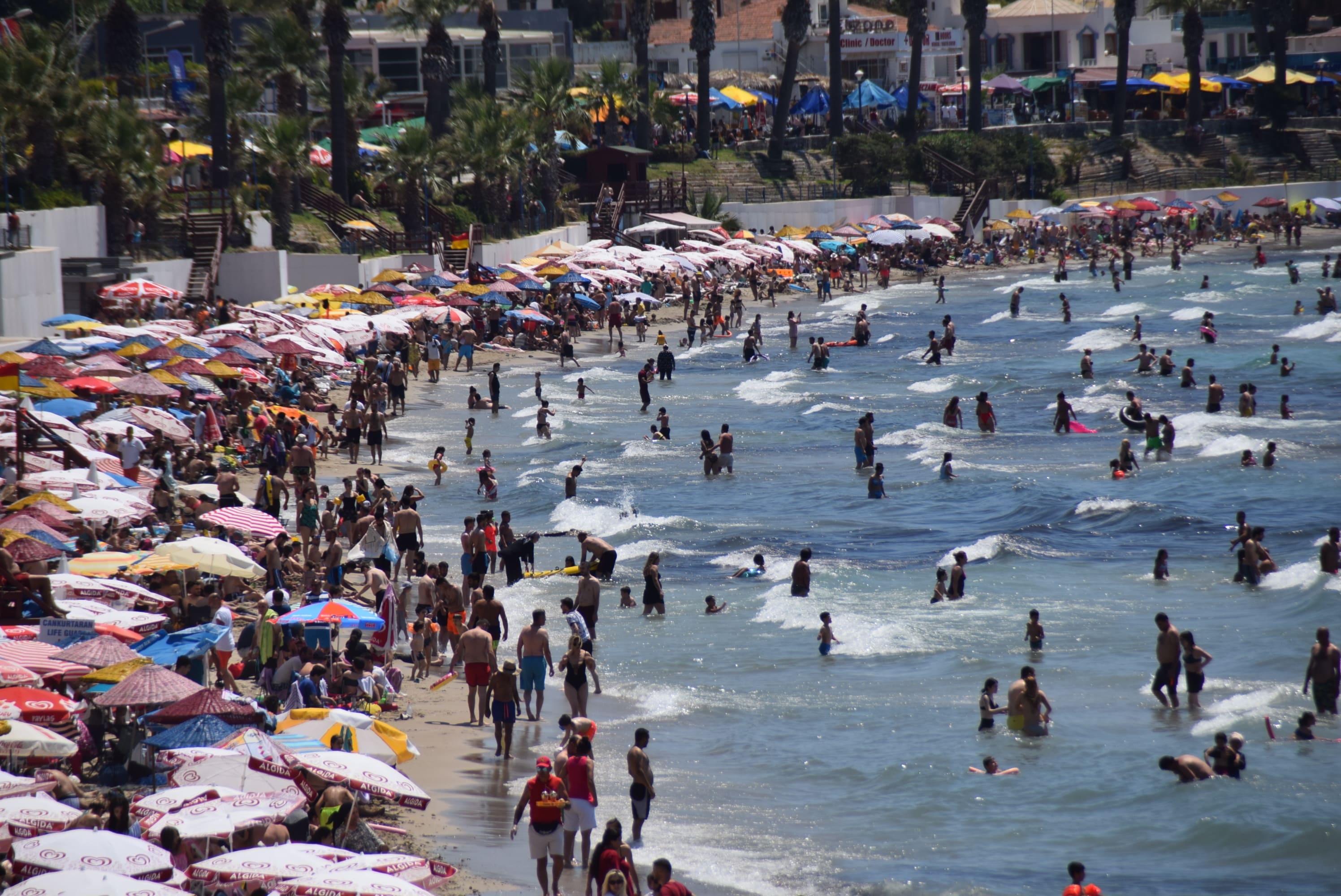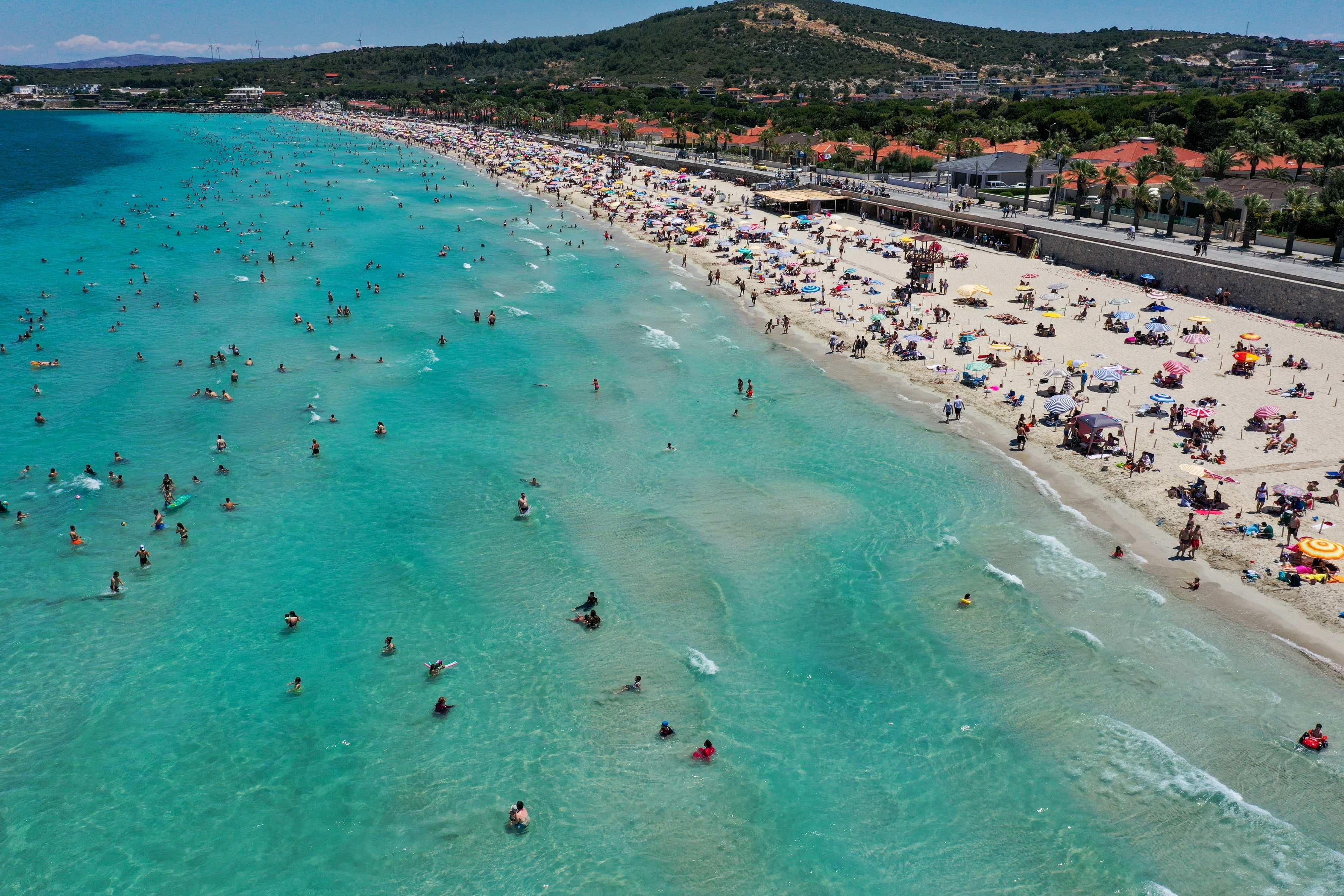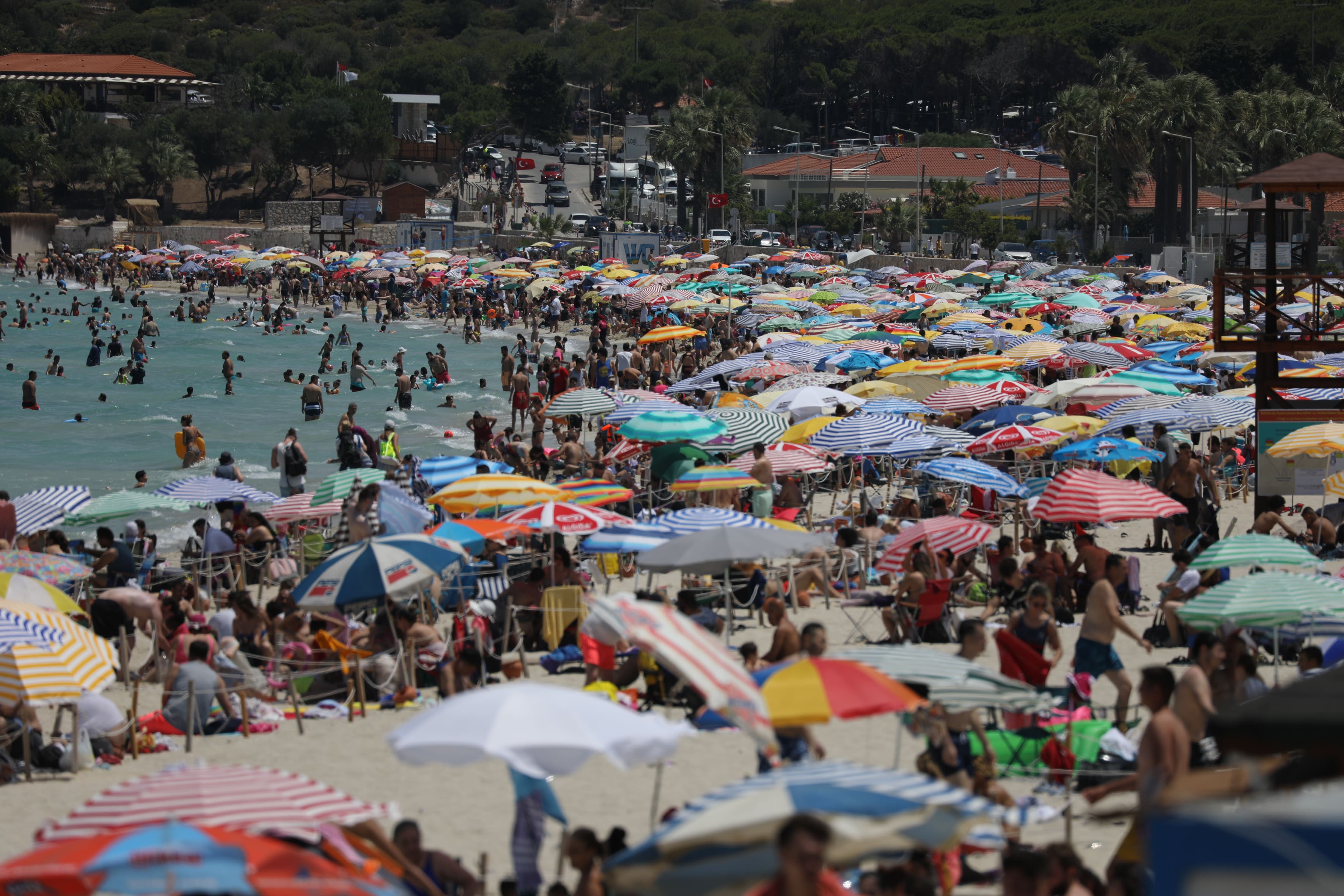 İzmirliler ve çevre illerden gelen tatilciler, Çeşme ilçesindeki ünlü Ilıca Plajı'nda yoğunluk oluşturdu.