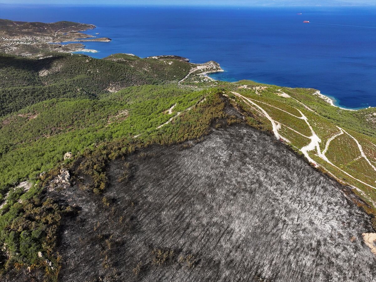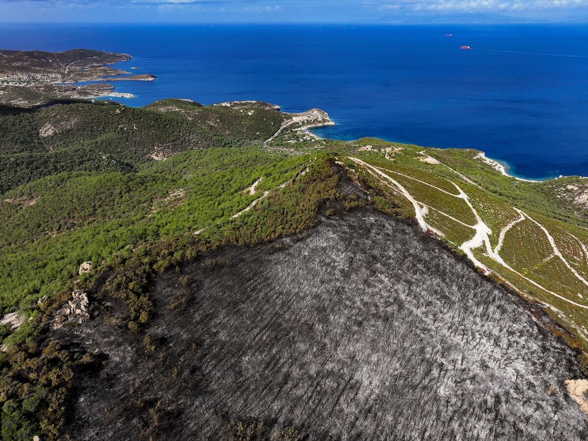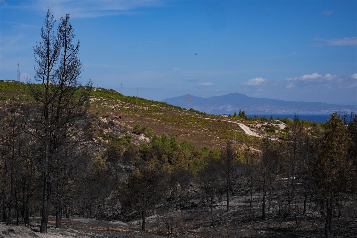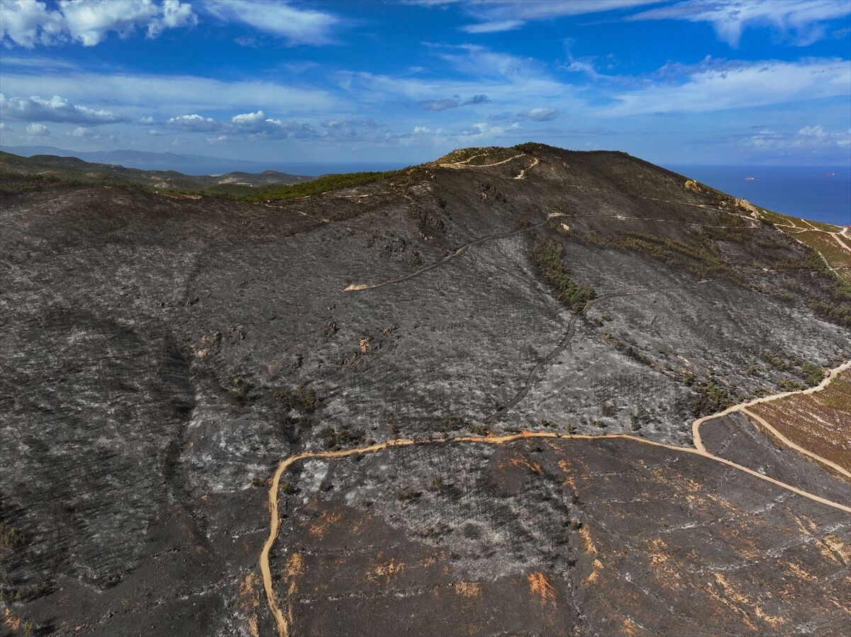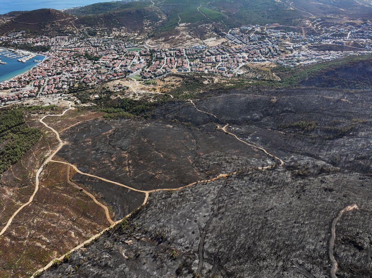 İzmir'in Foça ilçesinde dün çöplükte başlayarak ormana sıçrayan, yoğun müdahale ile kontrol altına alınan yangında büyük bölümü kızılçam ormanı olan 340 hektar arazi, siyah ve gri tonlarına büründü.