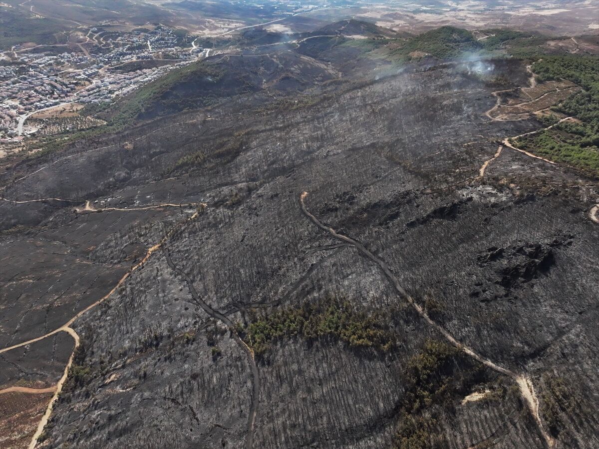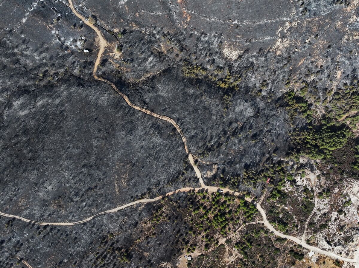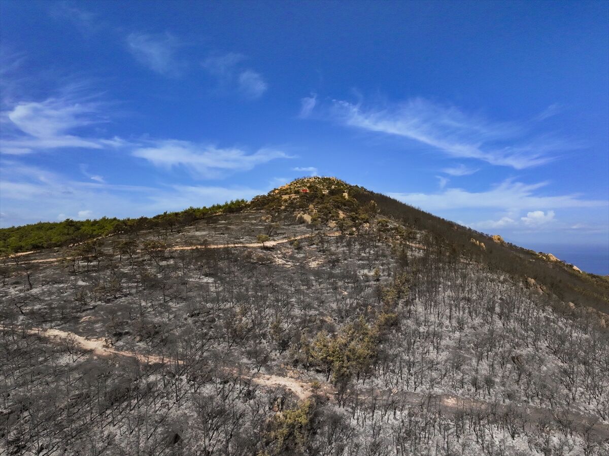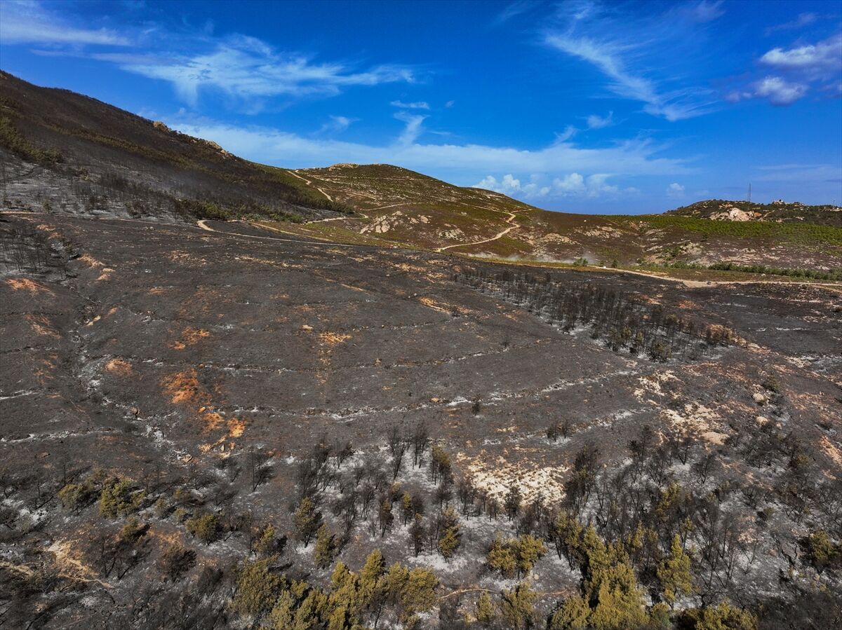 İzmir'in Foça ilçesinde dün çöplükte başlayarak ormana sıçrayan, yoğun müdahale ile kontrol altına alınan yangında büyük bölümü kızılçam ormanı olan 340 hektar arazi, siyah ve gri tonlarına büründü.
