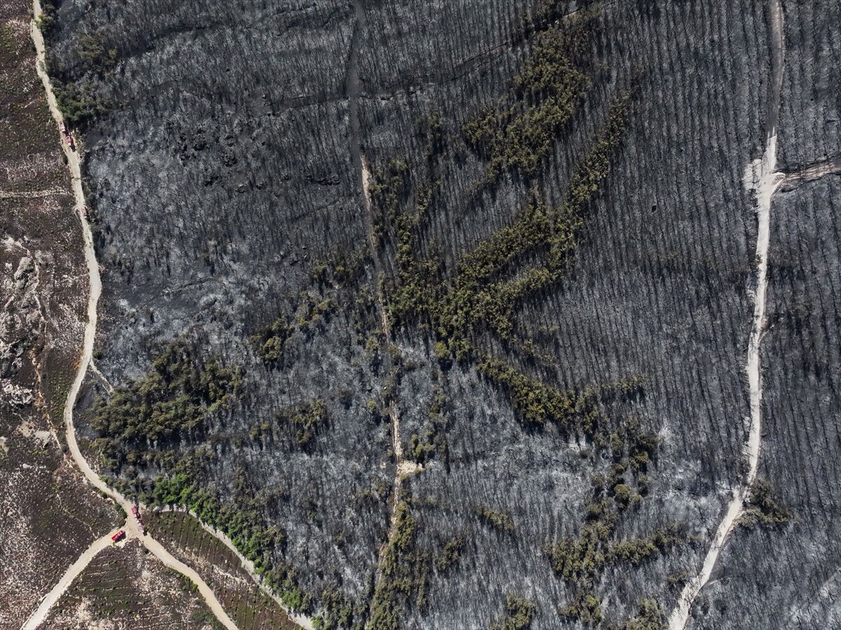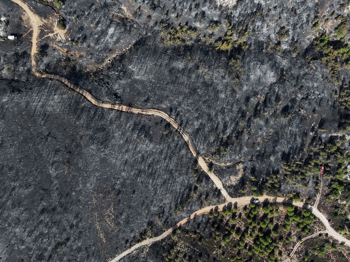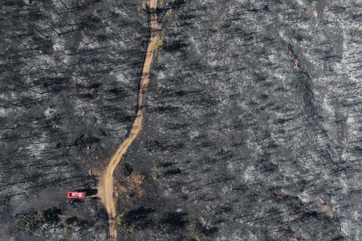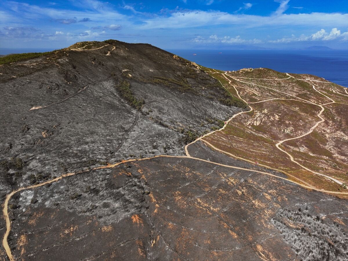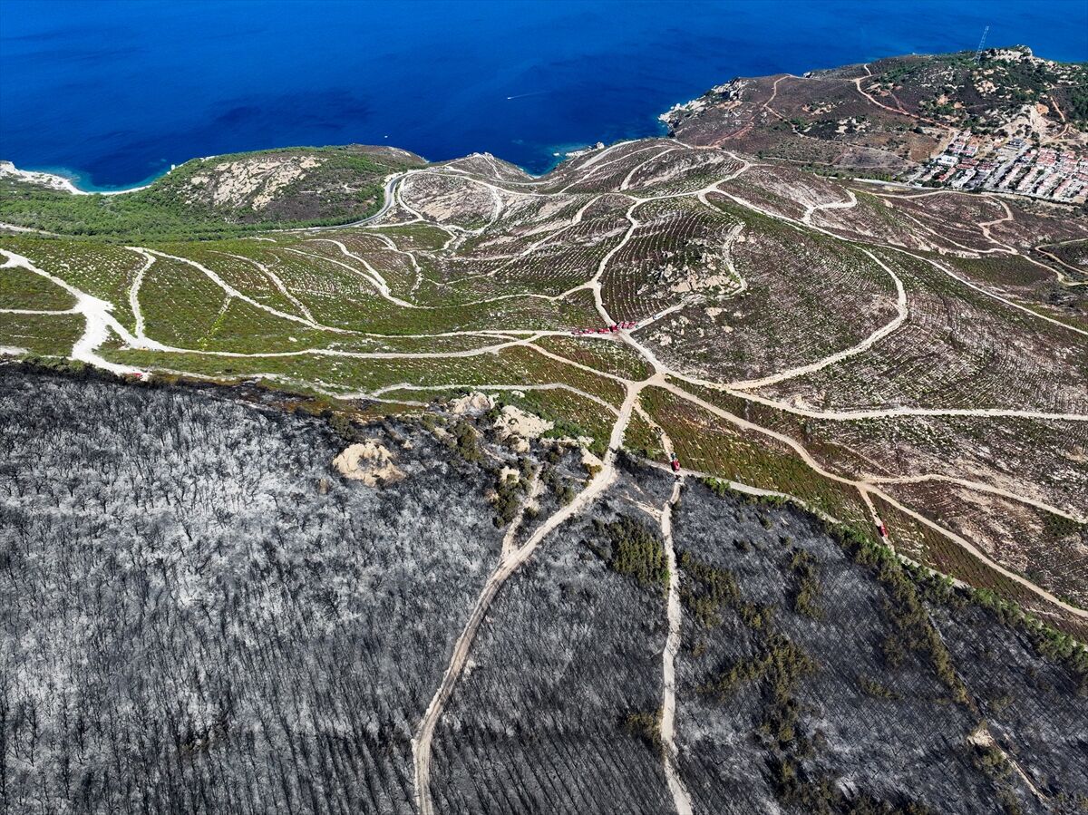İzmir'in Foça ilçesinde dün çöplükte başlayarak ormana sıçrayan, yoğun müdahale ile kontrol altına alınan yangında büyük bölümü kızılçam ormanı olan 340 hektar arazi, siyah ve gri tonlarına büründü.