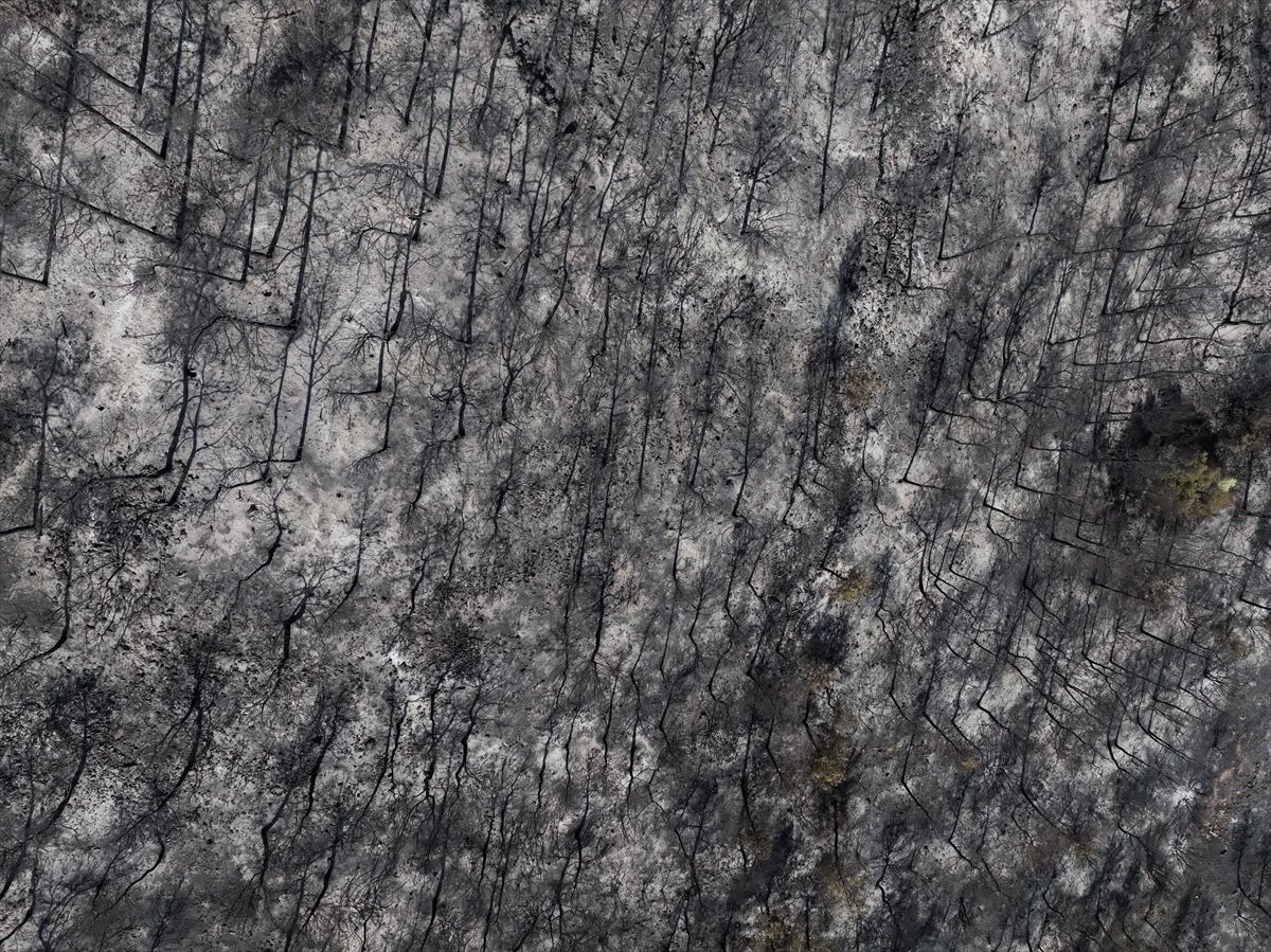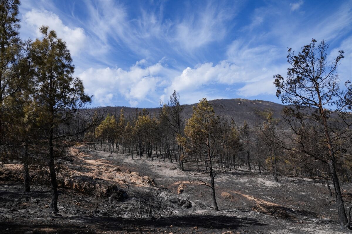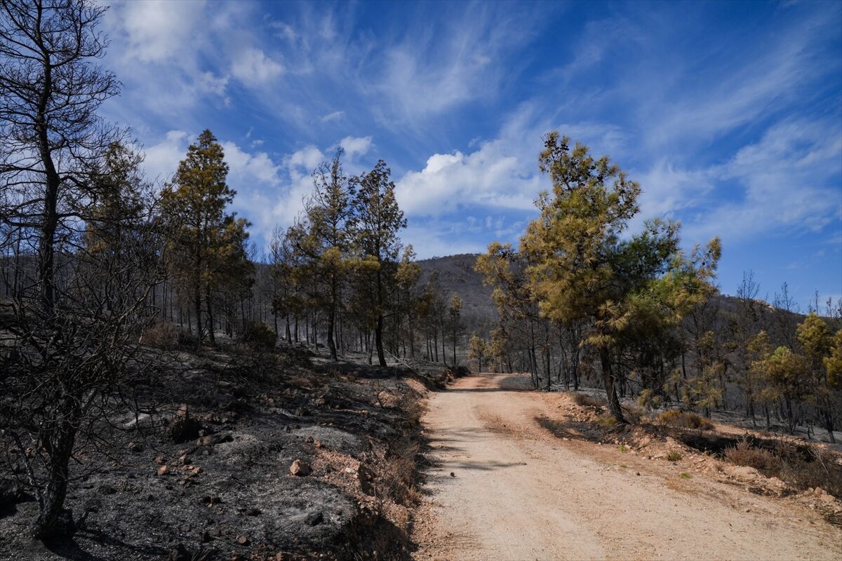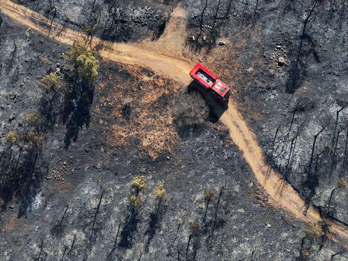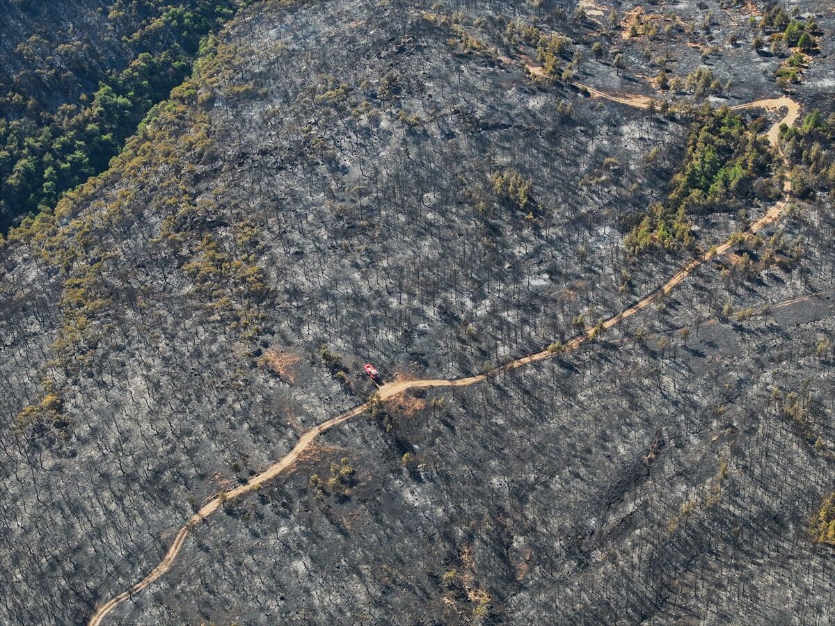 İzmir'in Foça ilçesinde dün çöplükte başlayarak ormana sıçrayan, yoğun müdahale ile kontrol altına alınan yangında büyük bölümü kızılçam ormanı olan 340 hektar arazi, siyah ve gri tonlarına büründü.