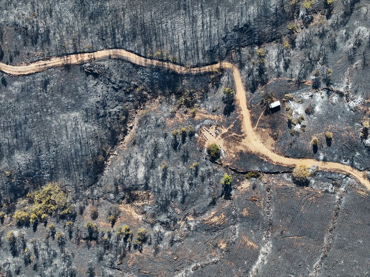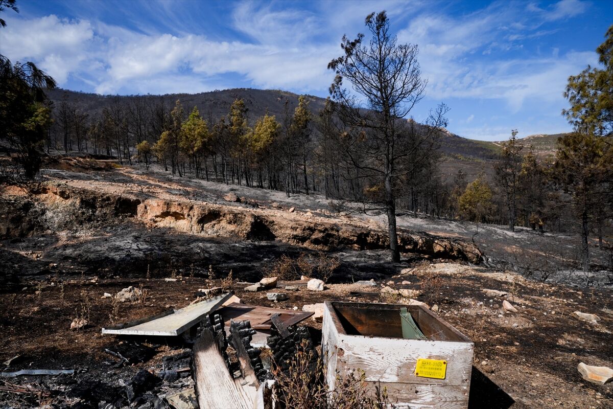 Yeşil tonların yangınla birlikte yerini siyah ve griye bıraktığının görüldüğü bölgede, çok sayıda arı kovanı da kullanılamaz hale geldi.