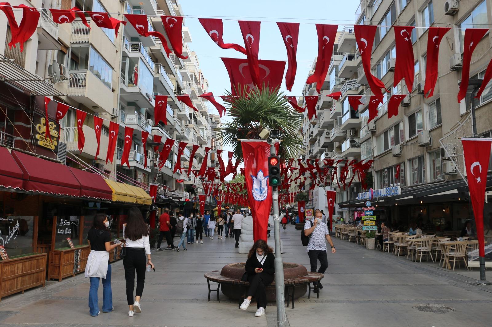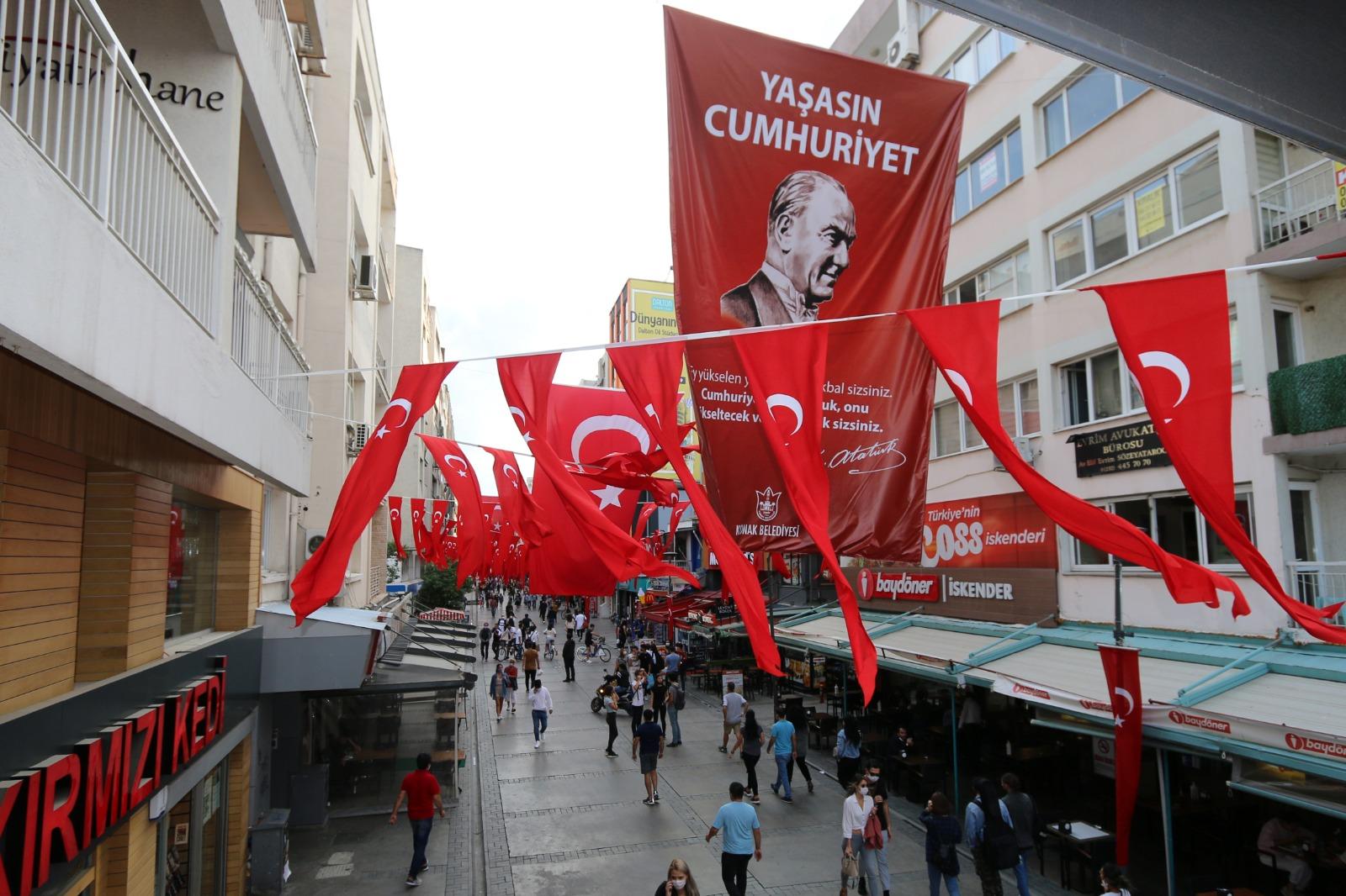 Tüm Türkiye’de olduğu gibi İzmir Konak’ta da Cumhuriyetimizin 97. Kuruluş yıldönümü öncesinde cadde ve sokaklar en büyük bayram için hazırlandı.