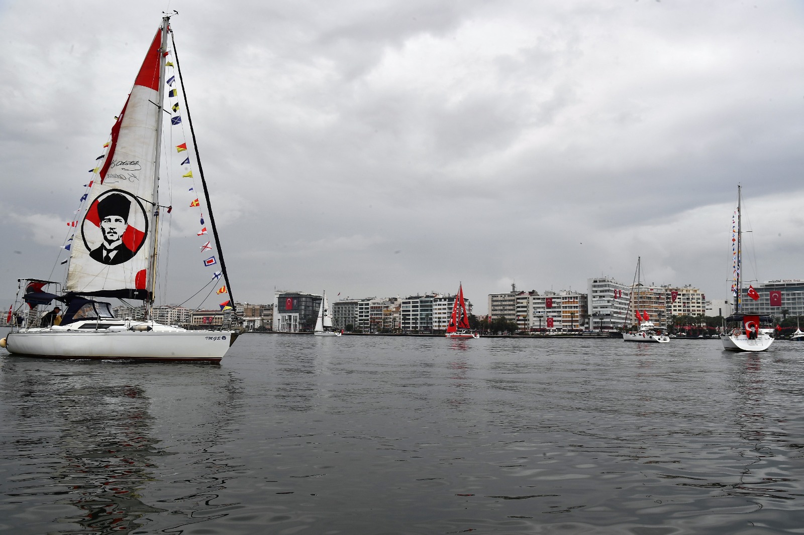 İzmir Marina’dan Bostanlı’ya kadar Körfez’de tur atan Türk bayraklı ve yelkenlerinde Atatürk’ün fotoğrafları bulunan tekneler Cumhuriyet coşkusunu denize taşıdı.