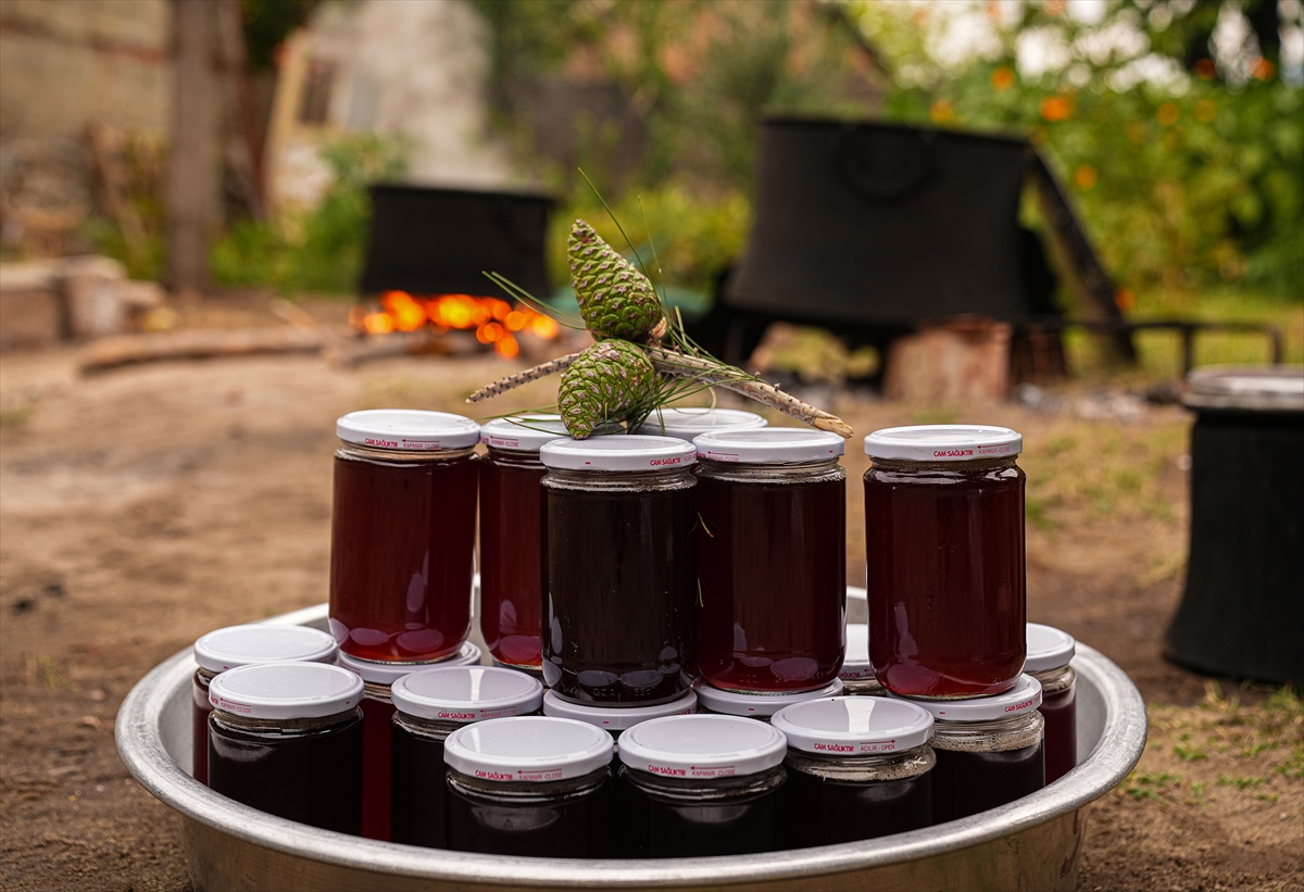 Yaklaşık 1 saat dinlendirildikten sonra kavanozlara alınan çam kozalağı pekmezi, yurdun dört bir yanından gelen siparişlerle kadınlar için gelir kapısı oluyor.
