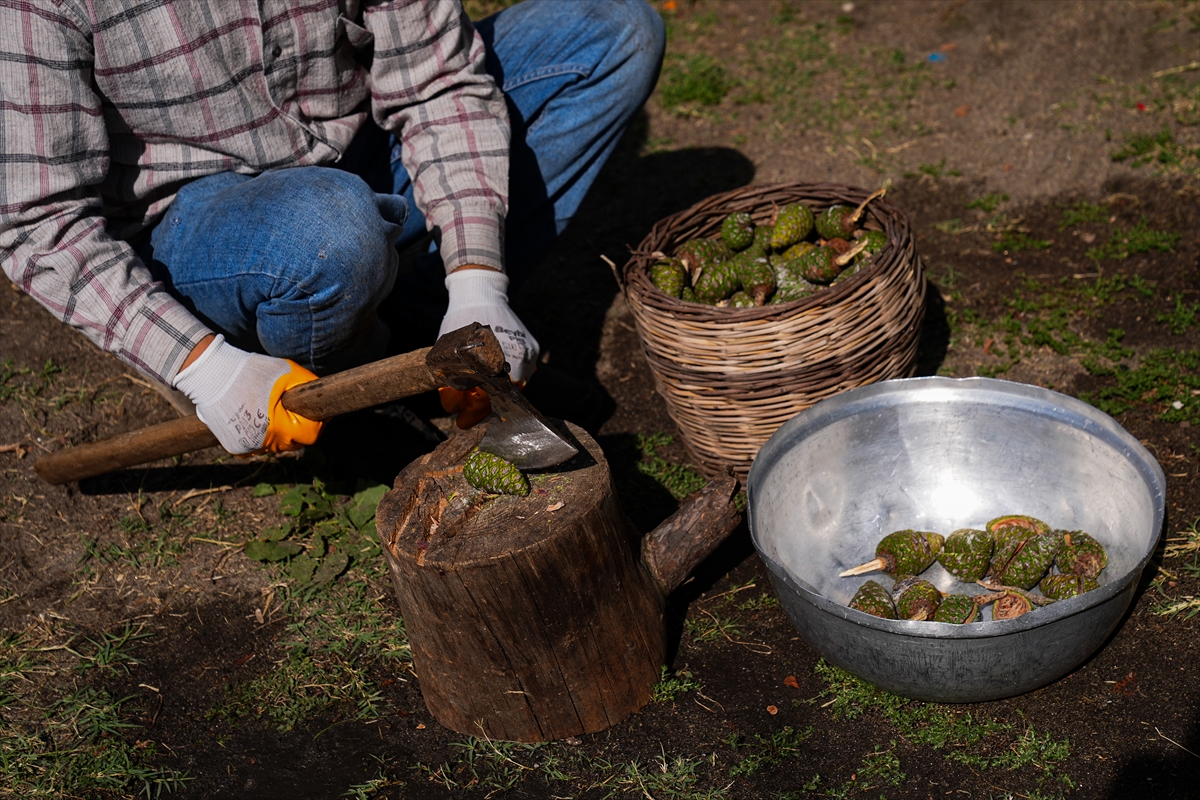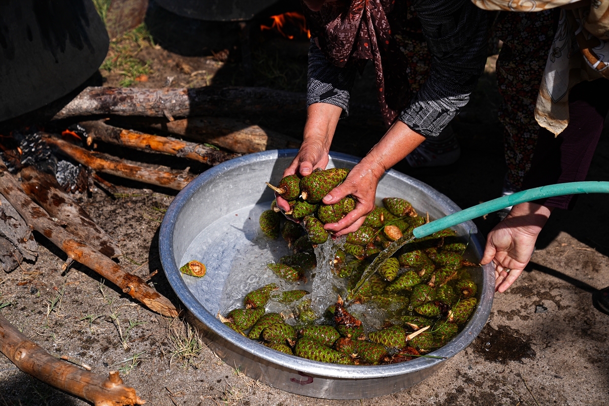 Mayıs ayından itibaren ağaçlardan toplanan taze kozalaklar, keser yardımıyla ikiye bölünüp evlerinin bahçelerinde bir araya gelen kadınlar tarafından yıkanıyor.