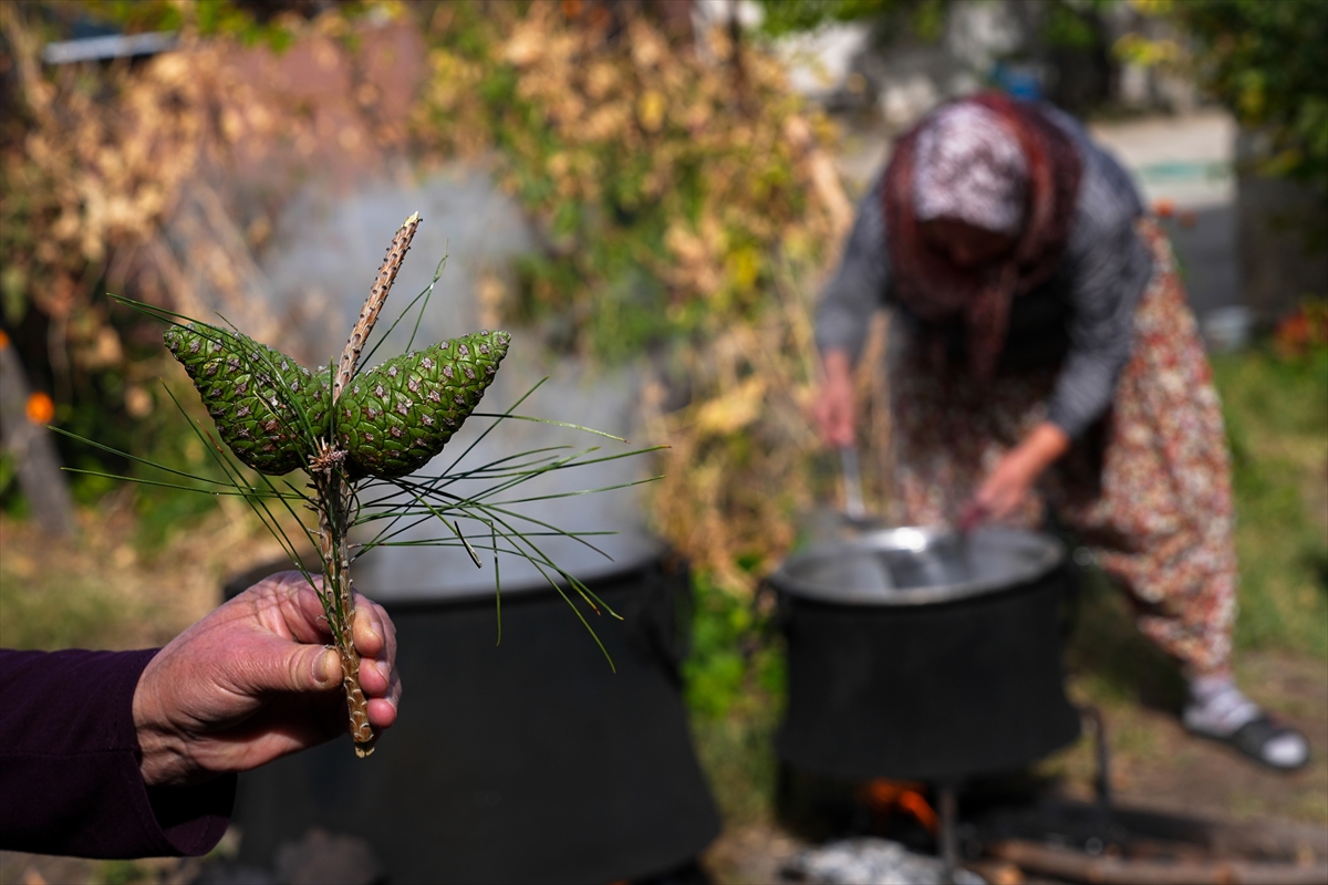 Aroması için havanda ezilen çam reçinesi ve üzüm pekmezi eklenerek 8 saat kaynatılan kozalaklar, istenilen kıvama geldiğinde ateşten alınıp süzülüyor.