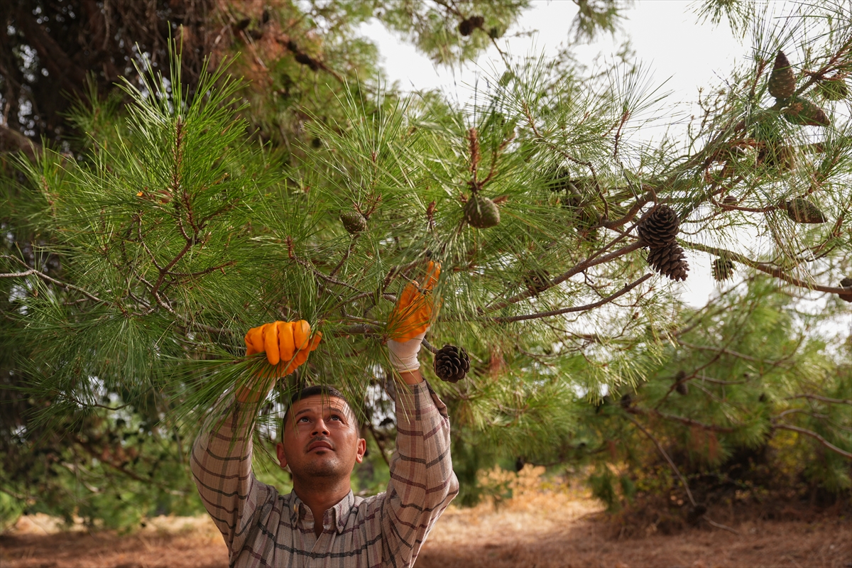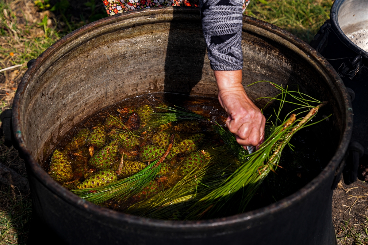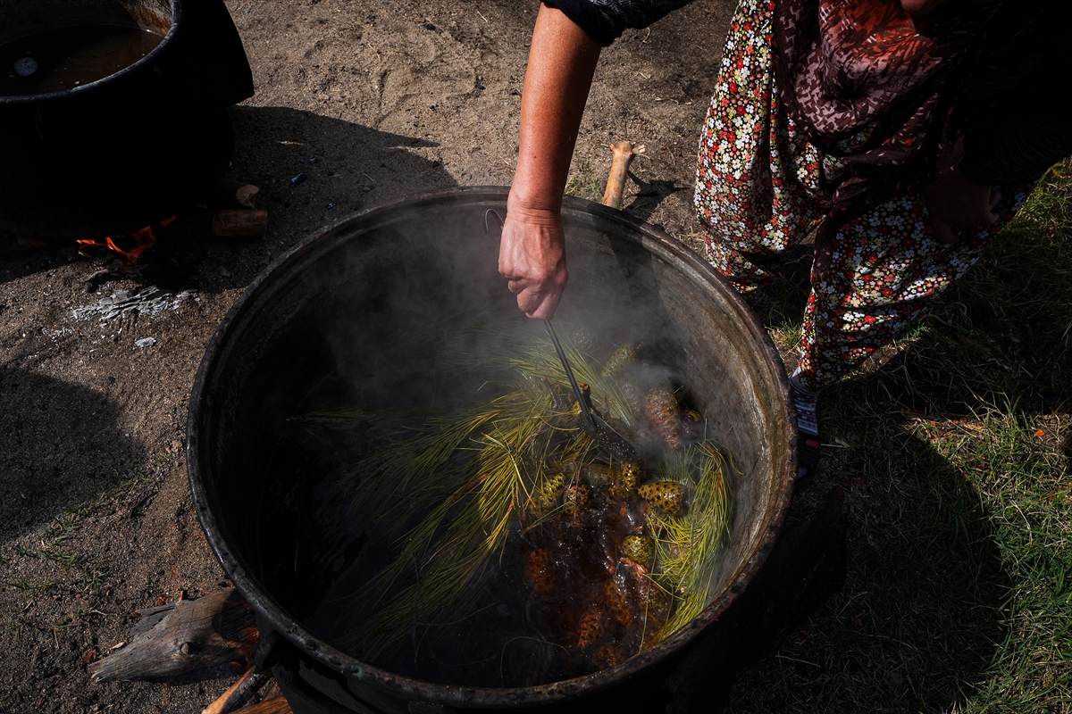 İzmir'in Bergama ilçesindeki kadınlar, Kozak Yaylası'ndaki kızılçam ağaçlarının kozalaklarıyla imece usulü pekmez yapıyor.