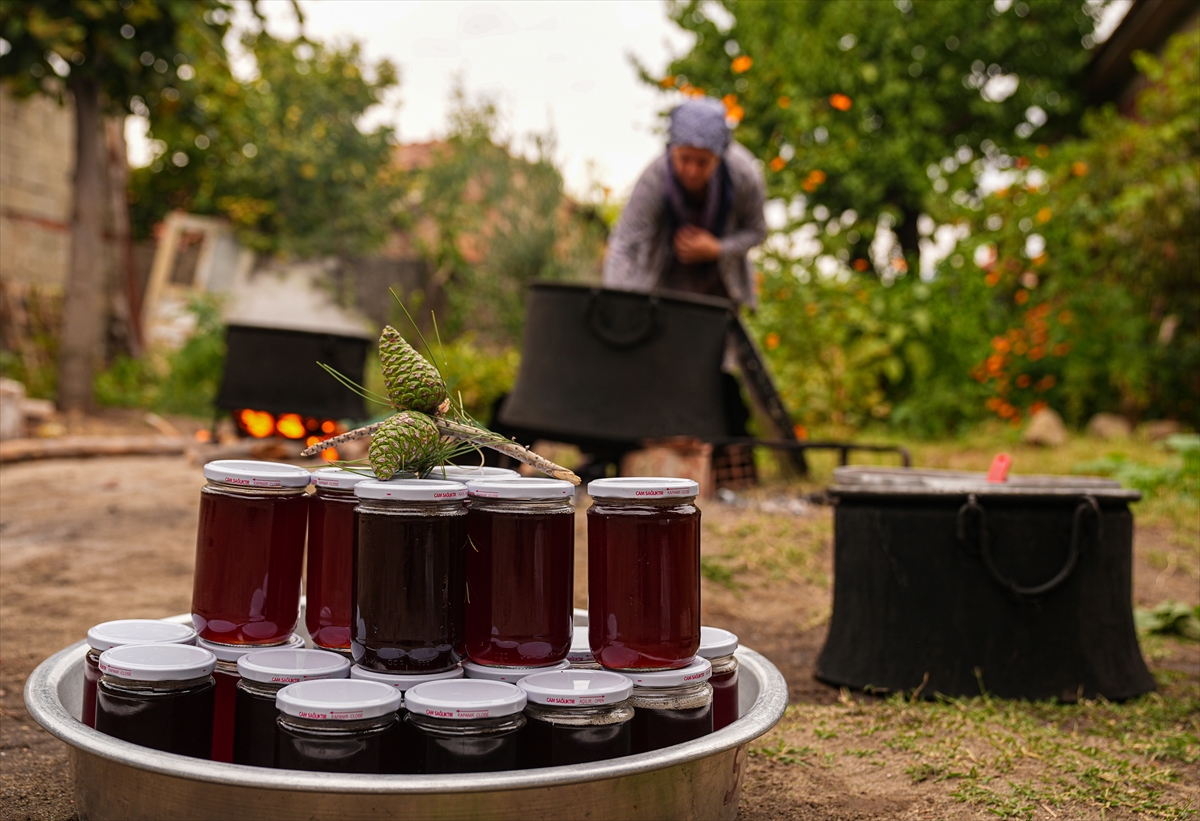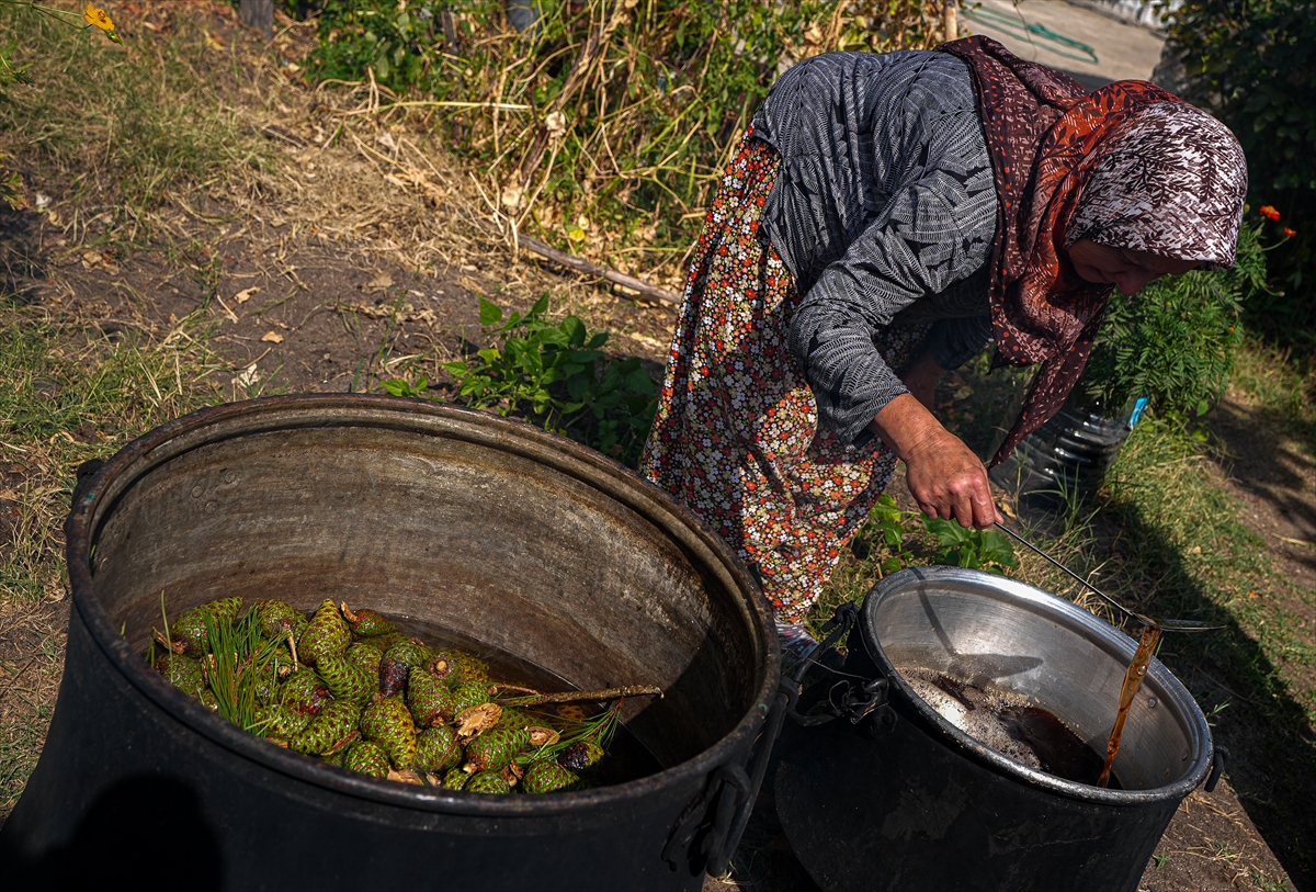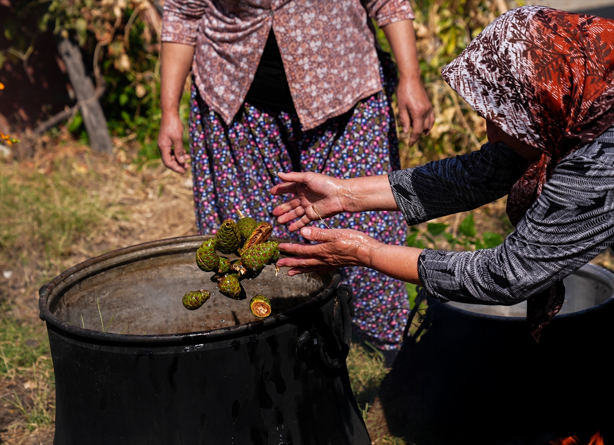 Yörenin zenginliklerini değerlendiren kadınlar, imece geleneğini yaşatarak kızılçam kozalaklarından pekmez elde ediyor.
