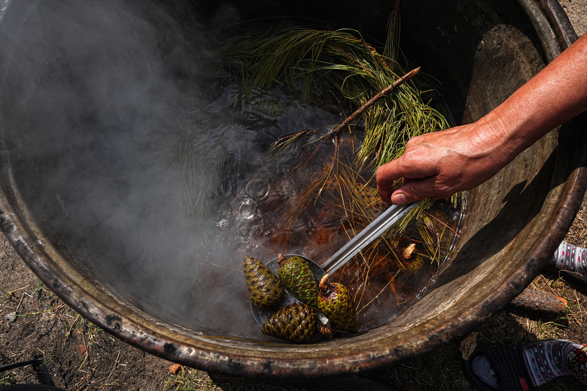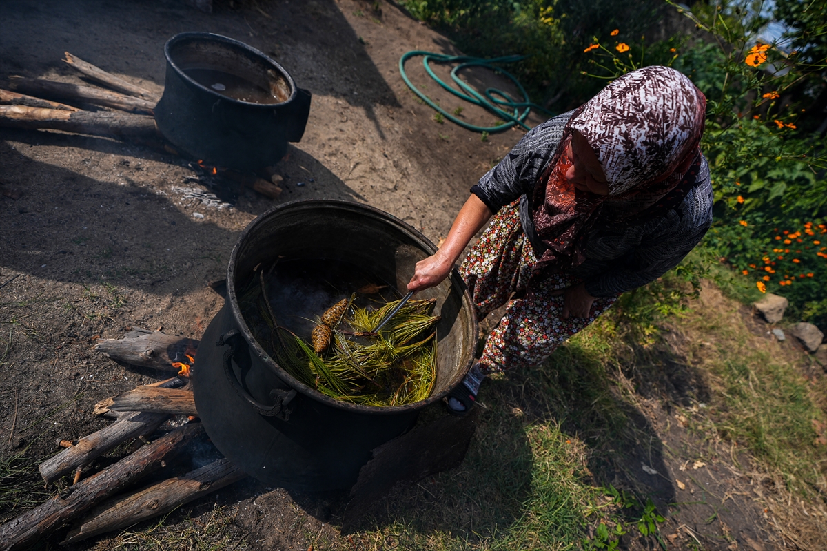 Daha sonra bakır kazanlara alınan kozalaklar içerisine su eklenerek odun ateşiyle kaynamaya bırakılıyor.
