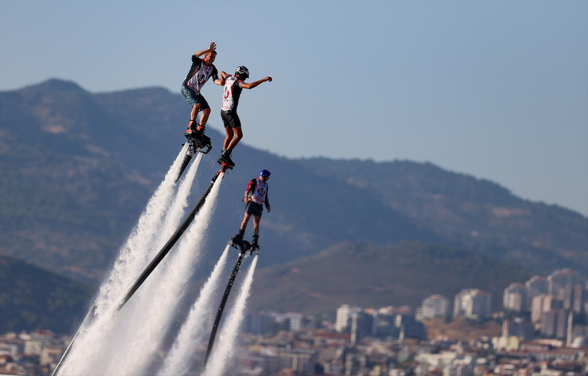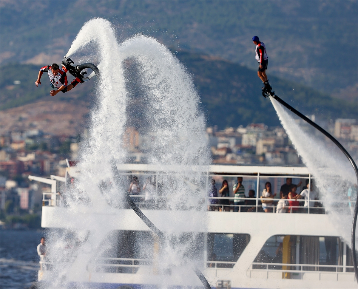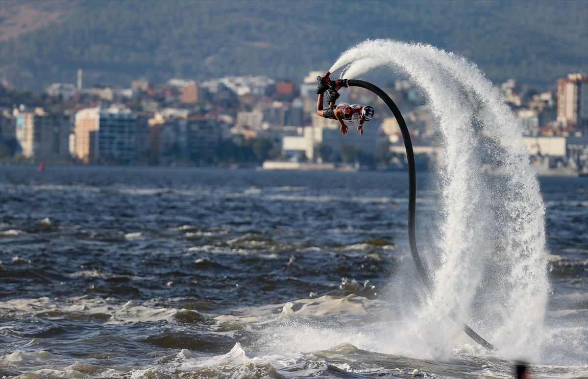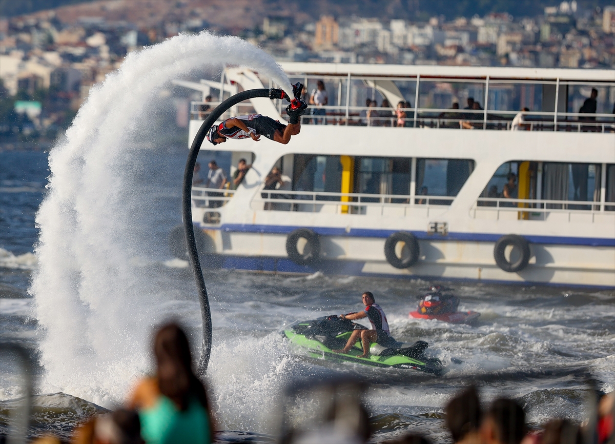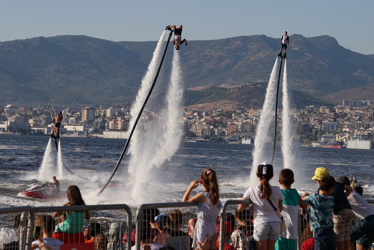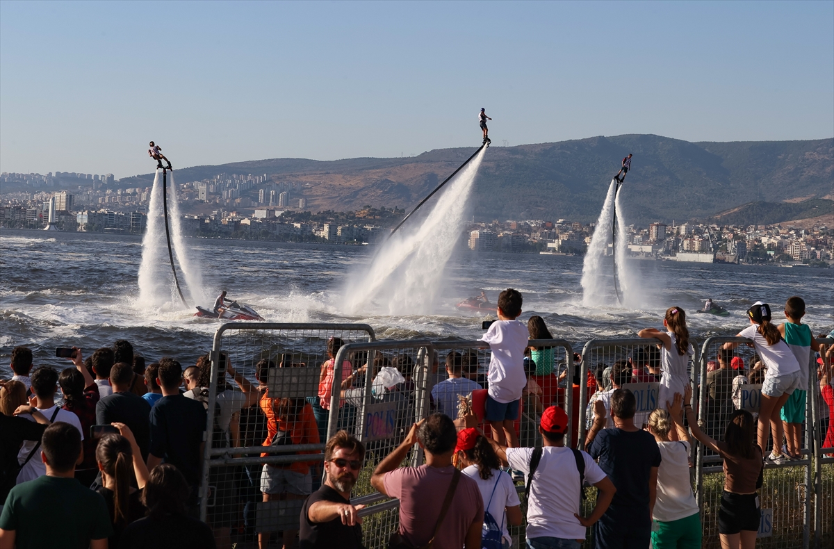 İzmir'in düşman işgalinden kurtuluşunun 100. yıl dönümü dolayısıyla Kordon Boyu'nda düzenlenen İzmir Airshow, ikinci gün uçuşlarıyla tamamlandı. Etkinlik kapsamında İzmir Körfezi'nde flyboard gösterileri de yapıldı.