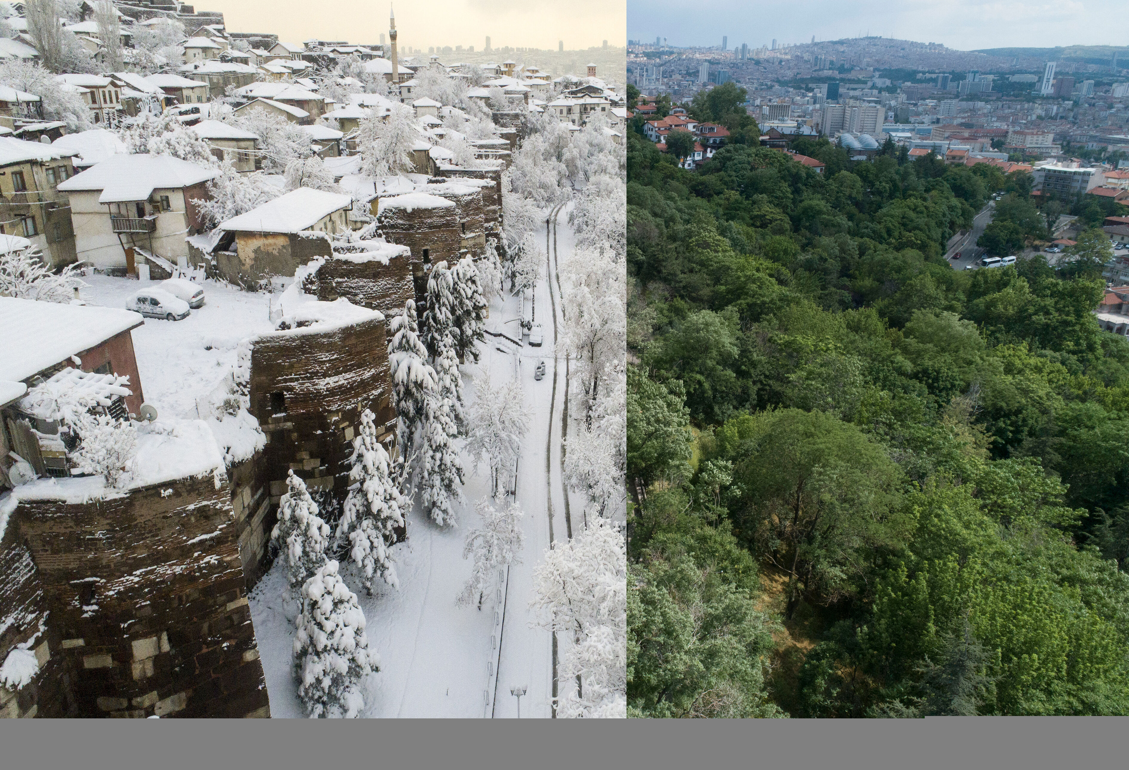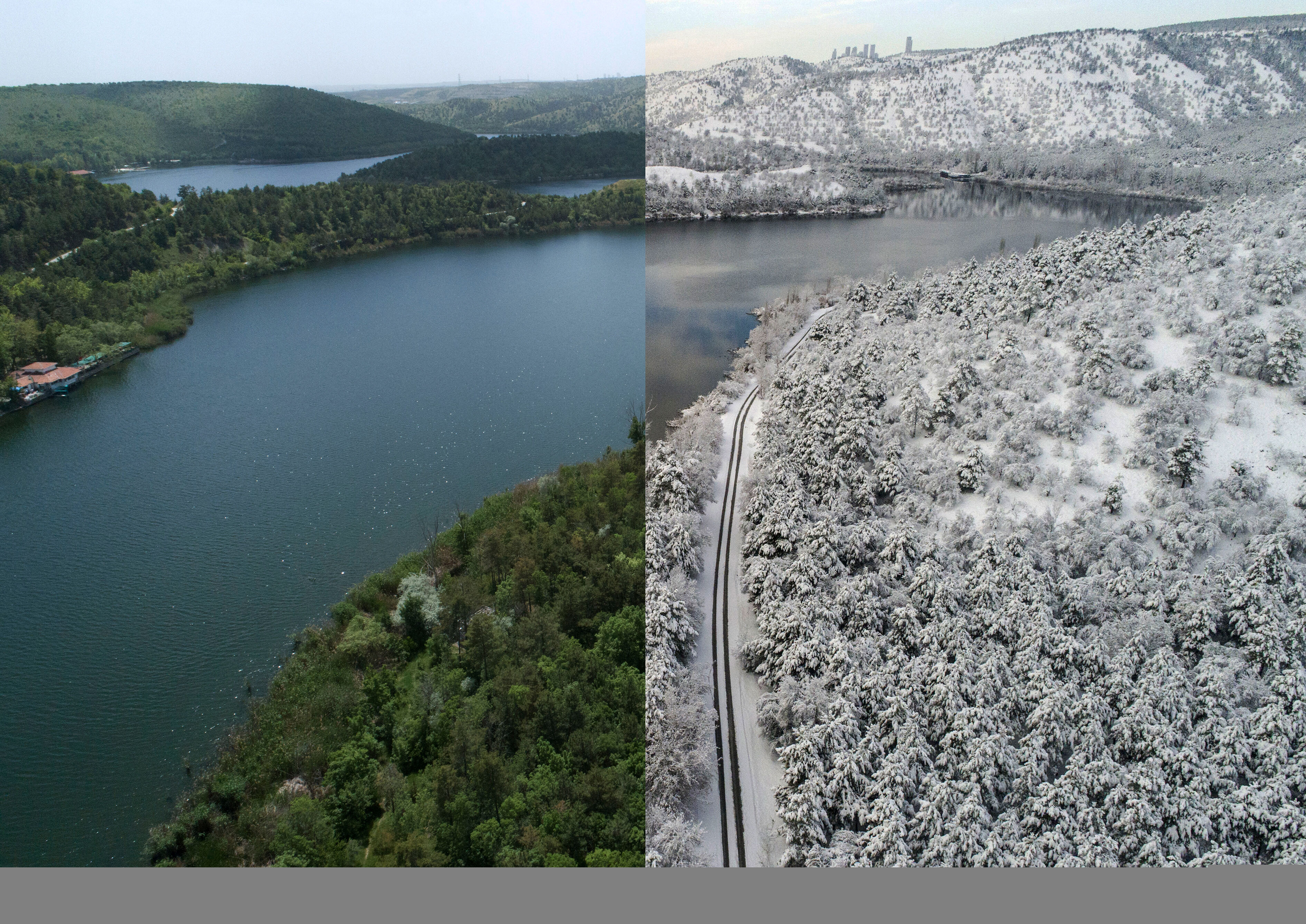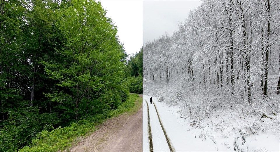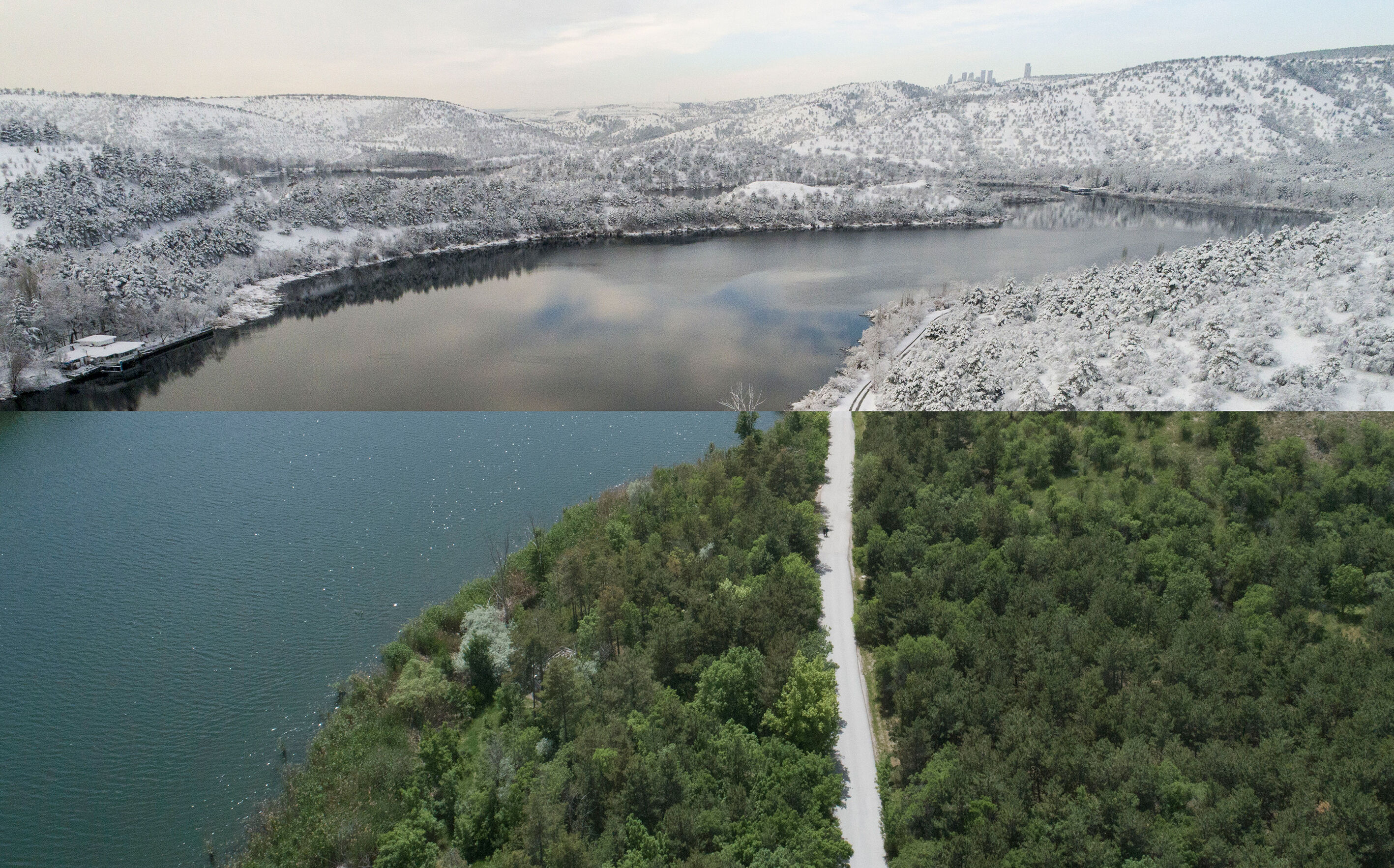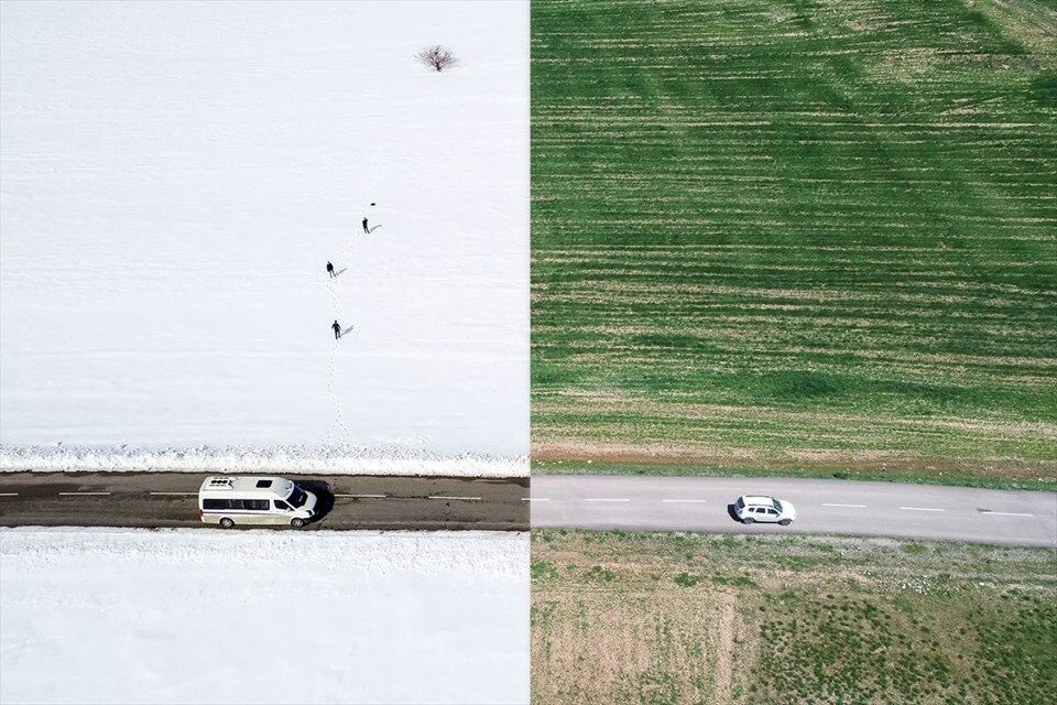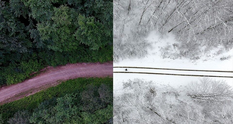 Türkiye'nin farklı coğrafyalarından Anadolu Ajansı (AA) foto muhabirlerince çekilen kuş bakışı fotoğraflarda hem kış hem de yaz mevsimi aynı karede yansıtıldı. Bir yarısı kar, diğer yarısı yemyeşil bahar ve yaz manzaralarından oluşan fotoğraflarda Türkiye'nin doğusundan batısına, kuzeyinden güneyine özellikle orman ve yollardaki mevsimsel değişiklikler göze çarpıyor.
