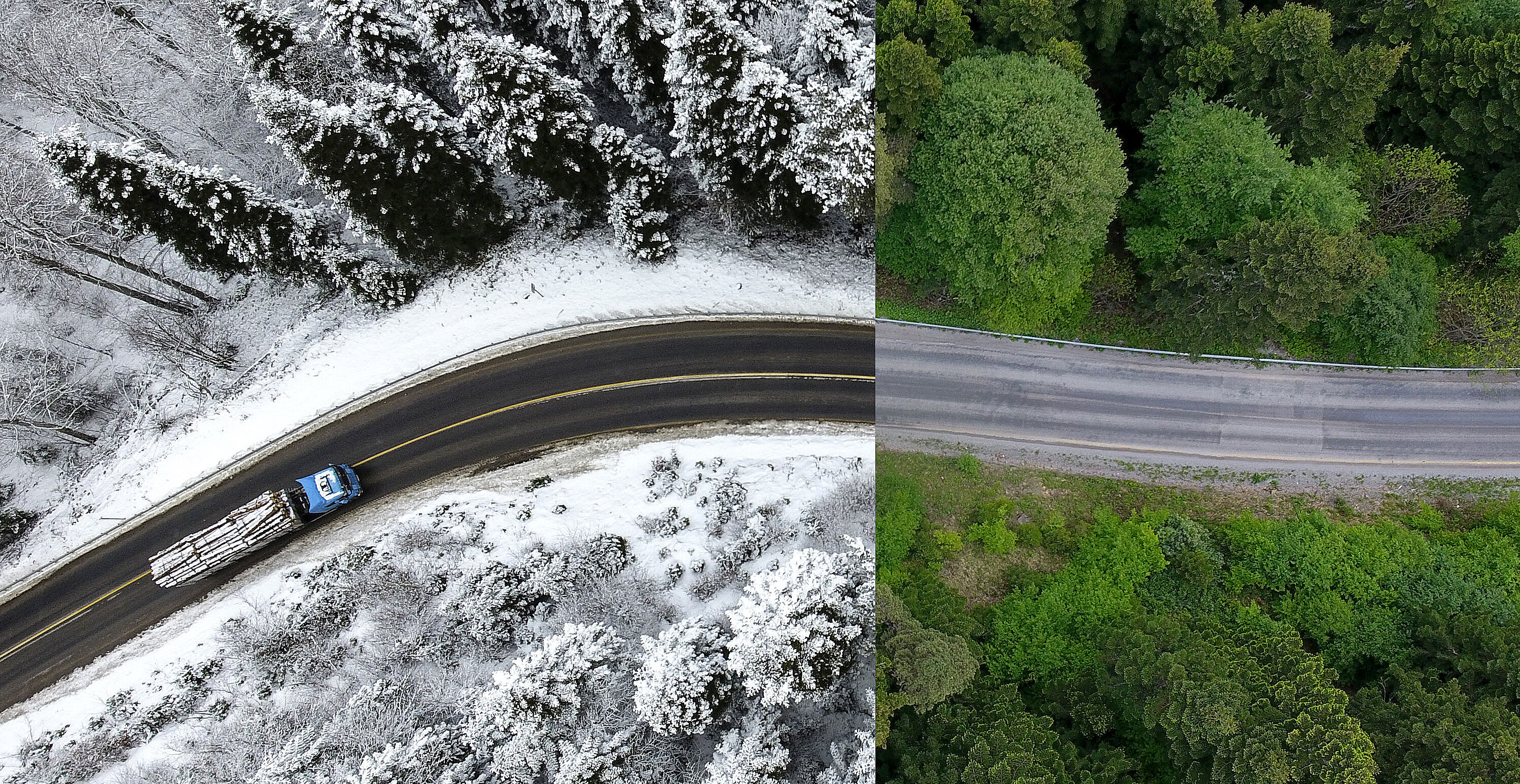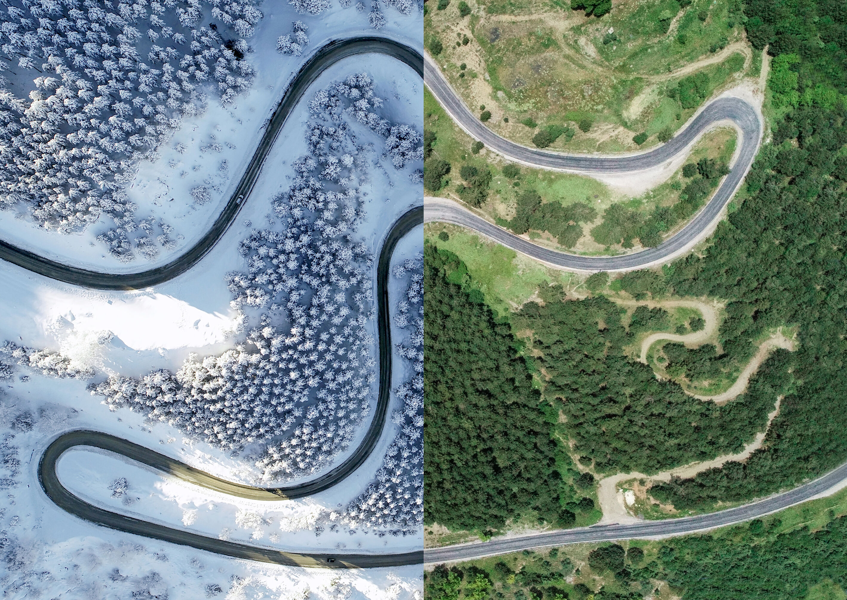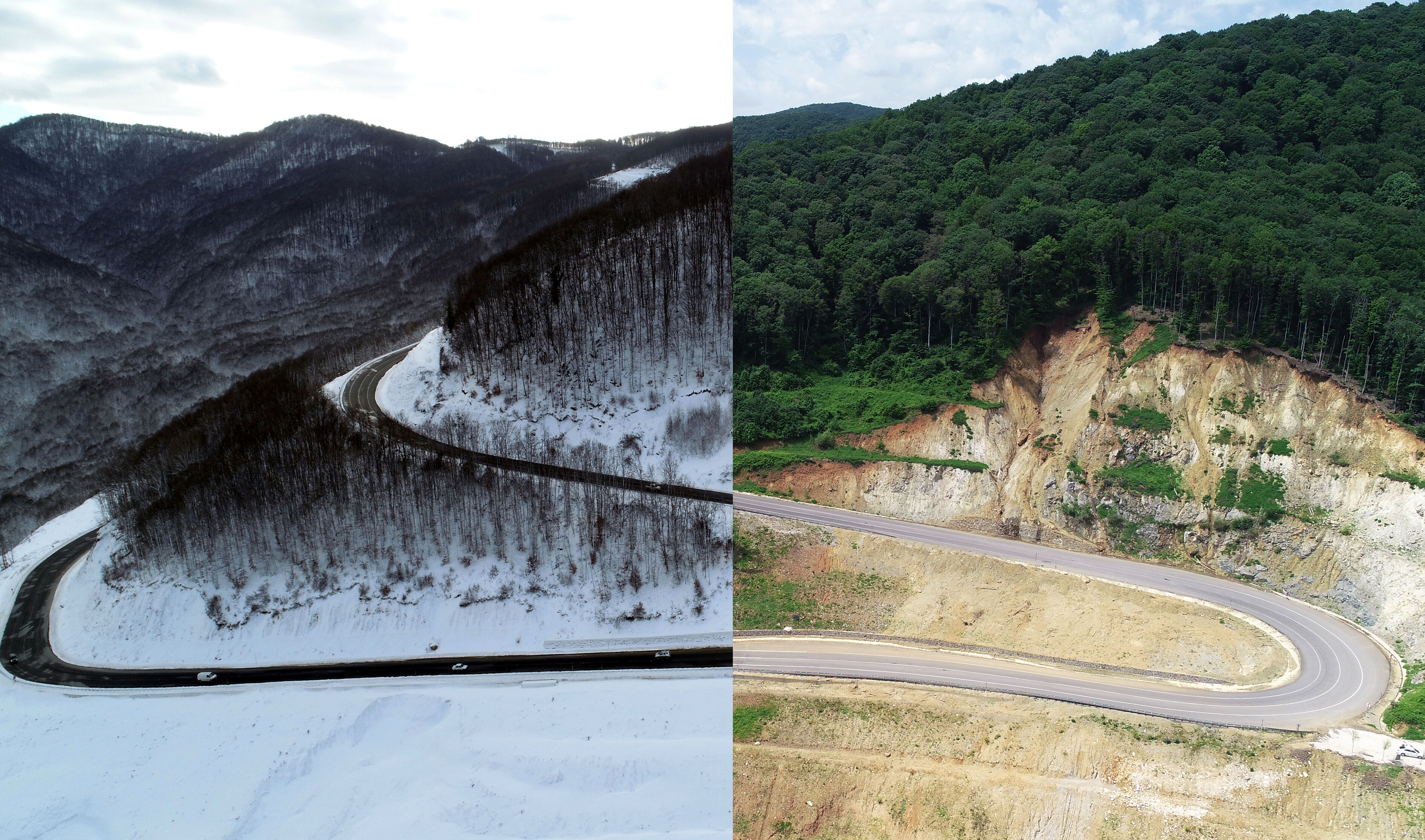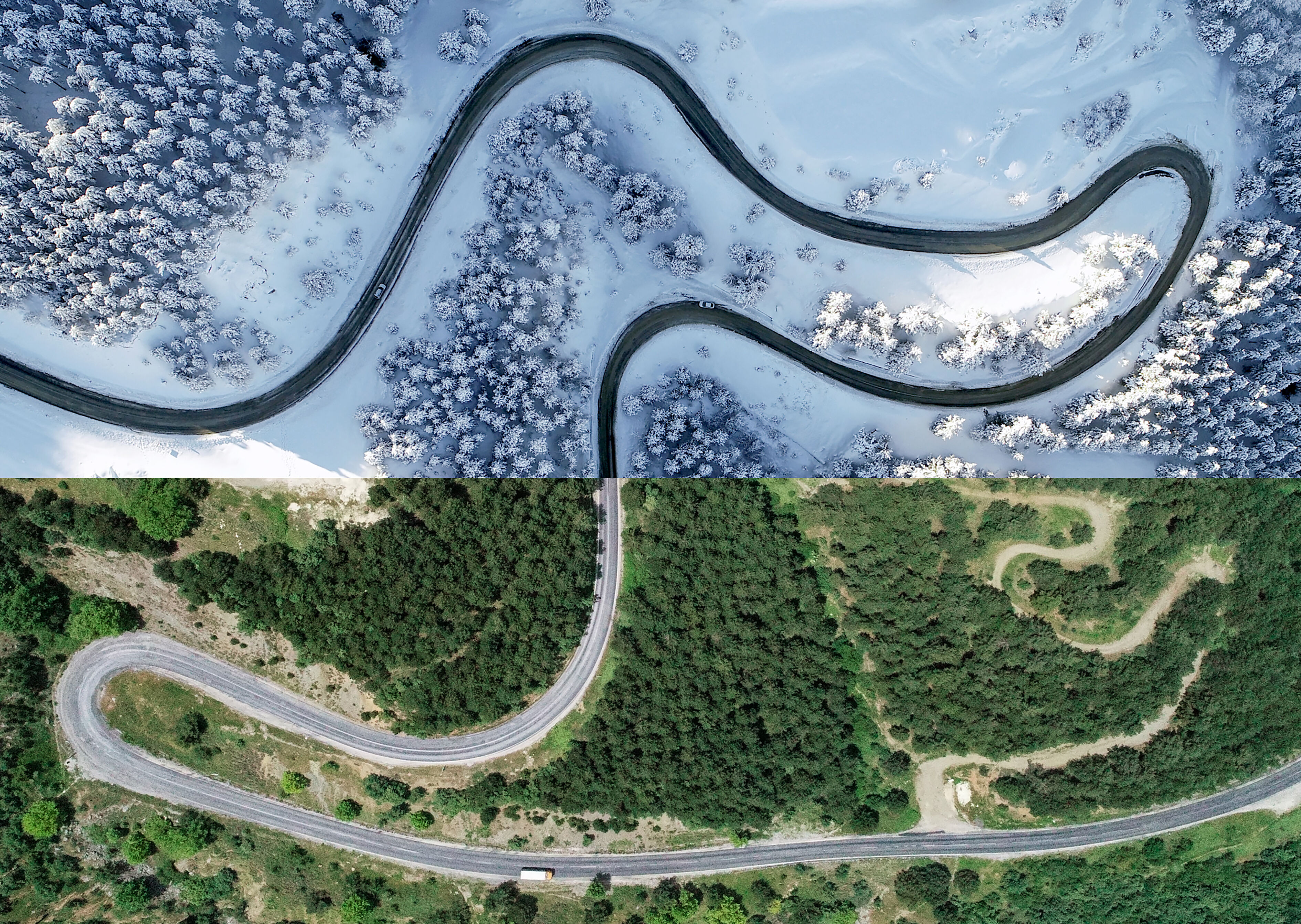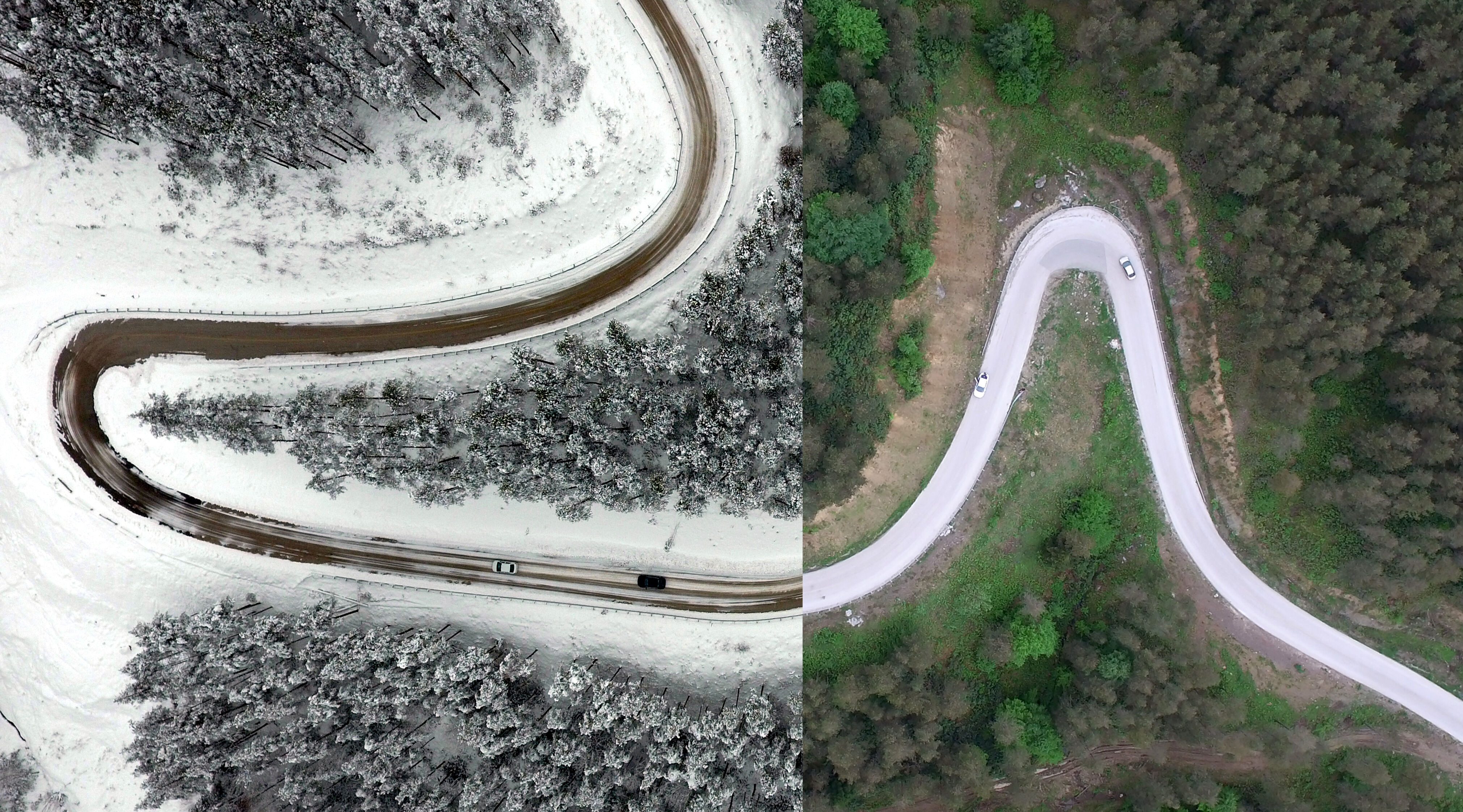 Türkiye'nin farklı coğrafyalarından Anadolu Ajansı (AA) foto muhabirlerince çekilen kuş bakışı fotoğraflarda hem kış hem de yaz mevsimi aynı karede yansıtıldı. Bir yarısı kar, diğer yarısı yemyeşil bahar ve yaz manzaralarından oluşan fotoğraflarda Türkiye'nin doğusundan batısına, kuzeyinden güneyine özellikle orman ve yollardaki mevsimsel değişiklikler göze çarpıyor.