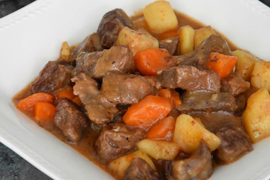 Sıvı yağı ve tereyağını tencerede kızdırın. Üzerine kuşbaşı etini koyup etler suyunu salıp tekrar çekinceye kadar kavurun. Üzerine yemeklik doğradığınız soğanları ve sarımsakları ekleyin ve kavurmaya devam edin. Birkaç dakika sonra 1 kaşık un ekleyin ve kokusu çıkana kadar 2-3 dakika karıştırın. Üzerine salçayı ekleyin.