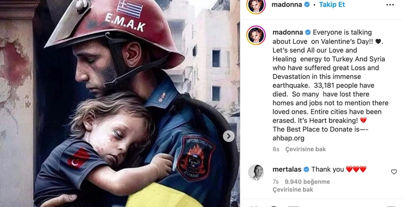 Madonna paylaşımının sonunda ise "The Best Place to Donate is—-ahbap.org" (bağış yapabileceğiniz en iyi yer ahbap.org) ifadesini kullandı.
