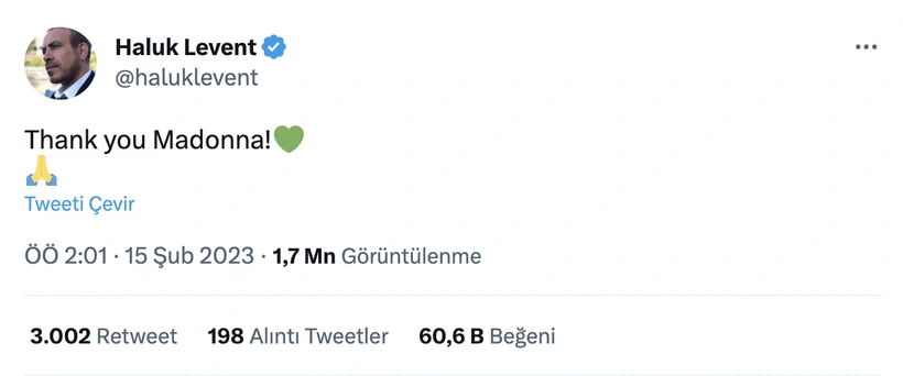 Ahbap Derneği'nin kurucusu ve başkanı Haluk Levent de Madonna'ya Twitter'dan yanıt verdi: "Thank You Madonna."