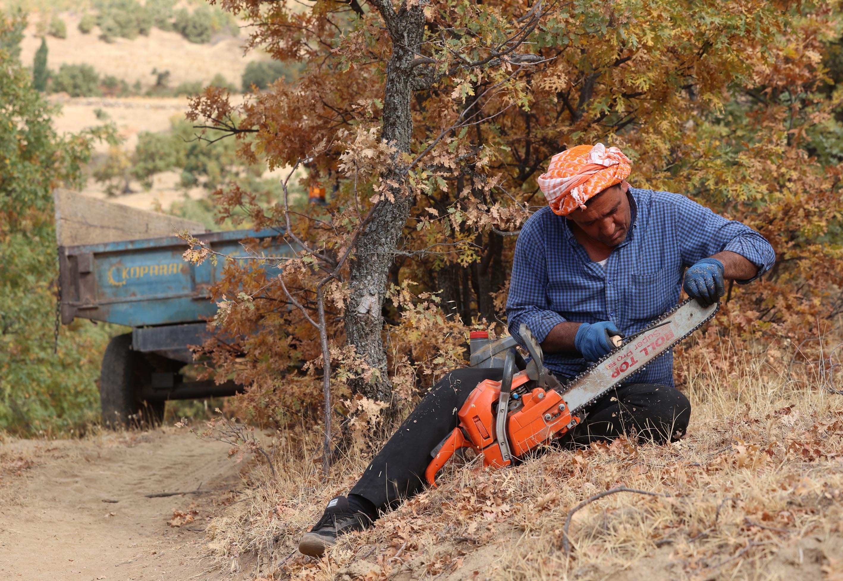 Orman aralama çalışmaları kapsamında elektrikli testerelerle parçalara ayrılan dal ve odunlar, römorklara yükleniyor.