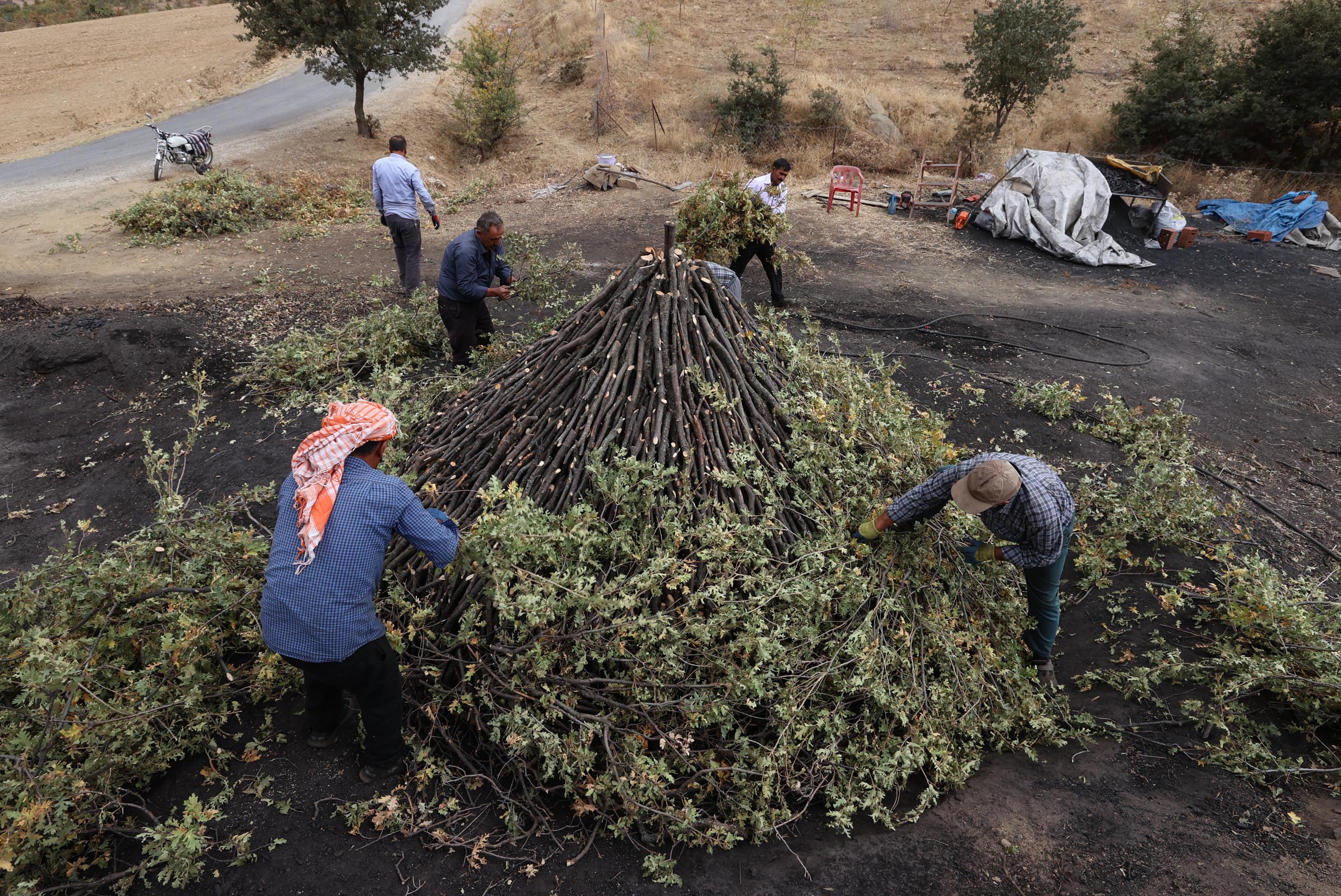 Mangal kömürü üretilen sahaya boşaltılan dallar, büyüklüklerine göre ayrılarak koni şeklinde diziliyor. "Torluk" adı verilen yığının üstü daha sonra toprakla örtülüyor.