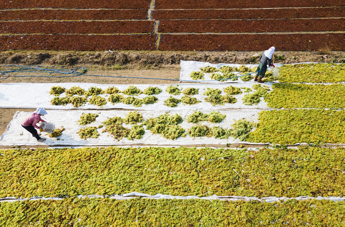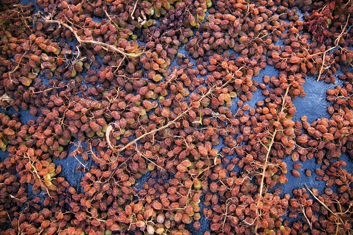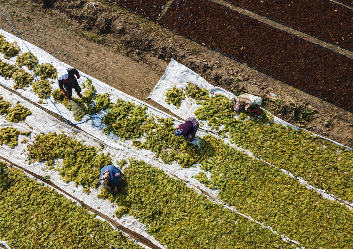 Bağlardan kesilen üzümler, traktörlerle sergilere taşındıktan sonra özel bir karışımla yıkanıyor. Meyvenin daha parlak görünmesi ve güneşin yakıcı ışınlarından korunması için su, zeytinyağı ve "posata" adı verilen potasyum karbonat karışımıyla yıkanan üzümler, 8-10 gün arası sergilerde bekletiliyor.