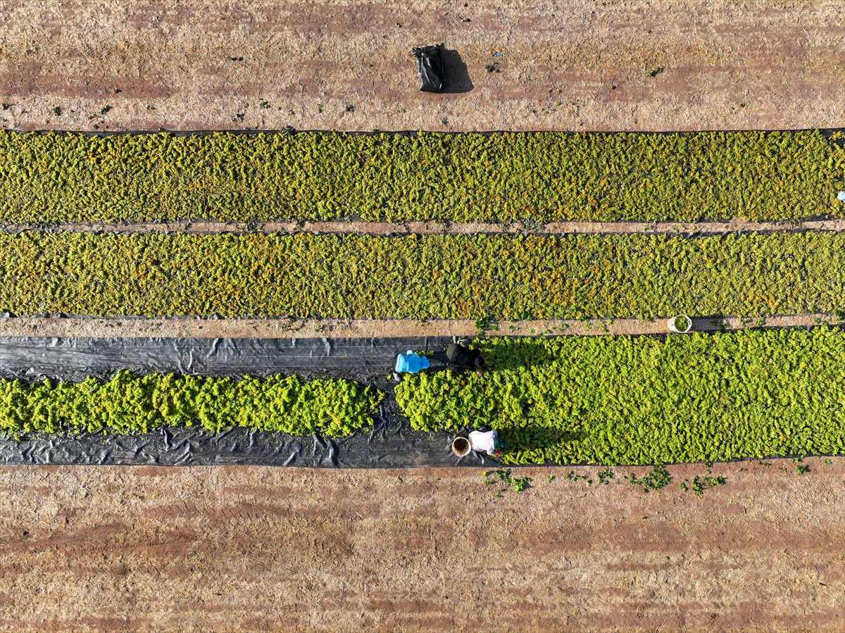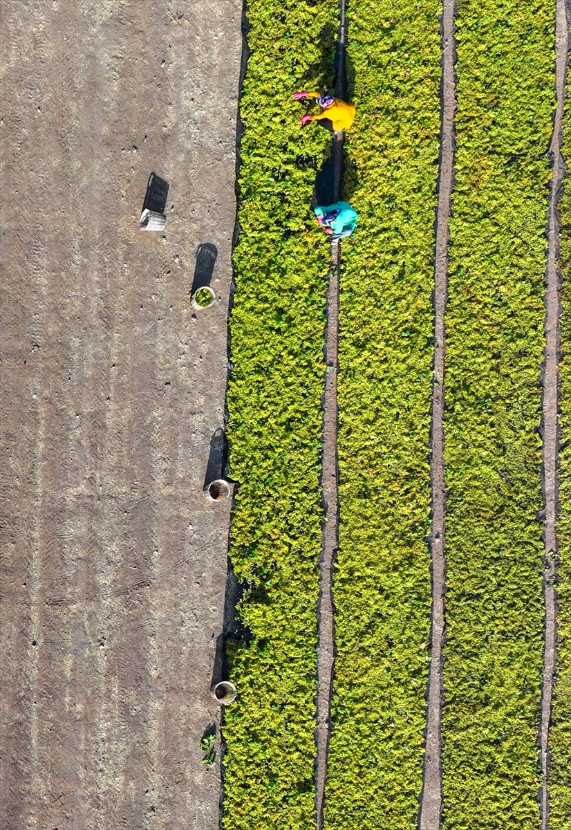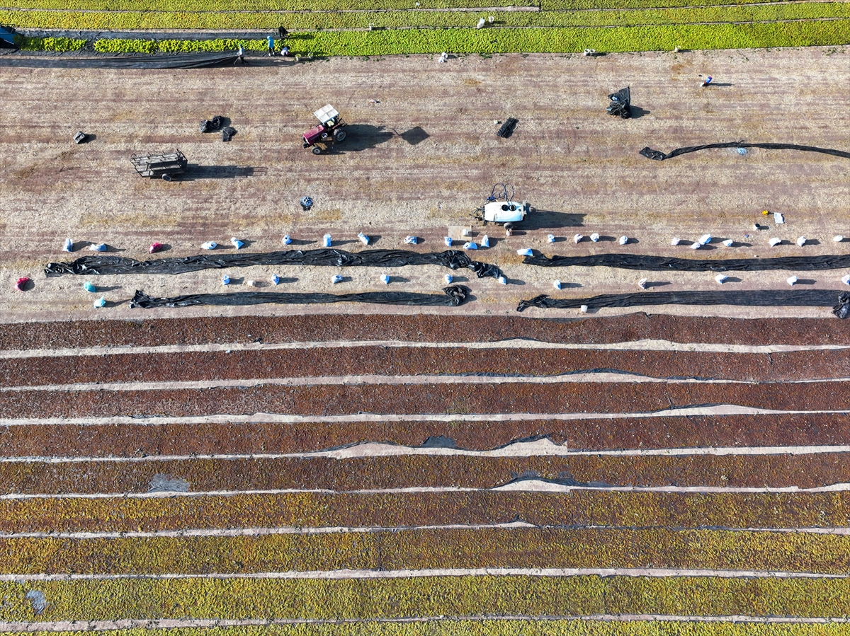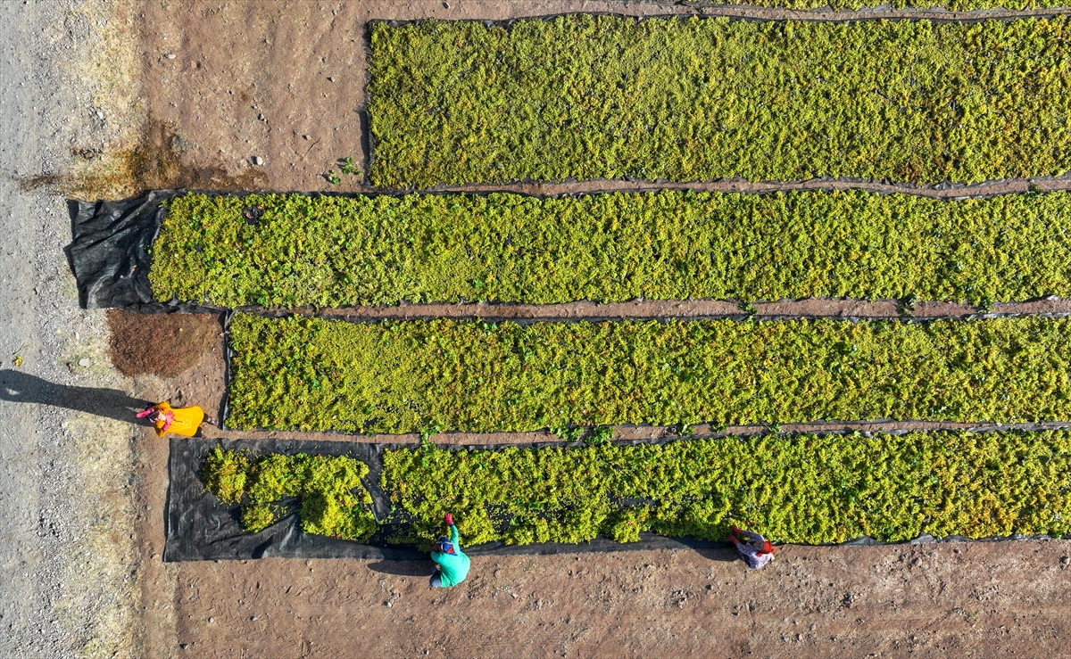 Yaklaşık 10 gün boyunca güneşte bekletilen üzümler, yeşilden kahverengine dönüşerek kuru üzüm haline geliyor.