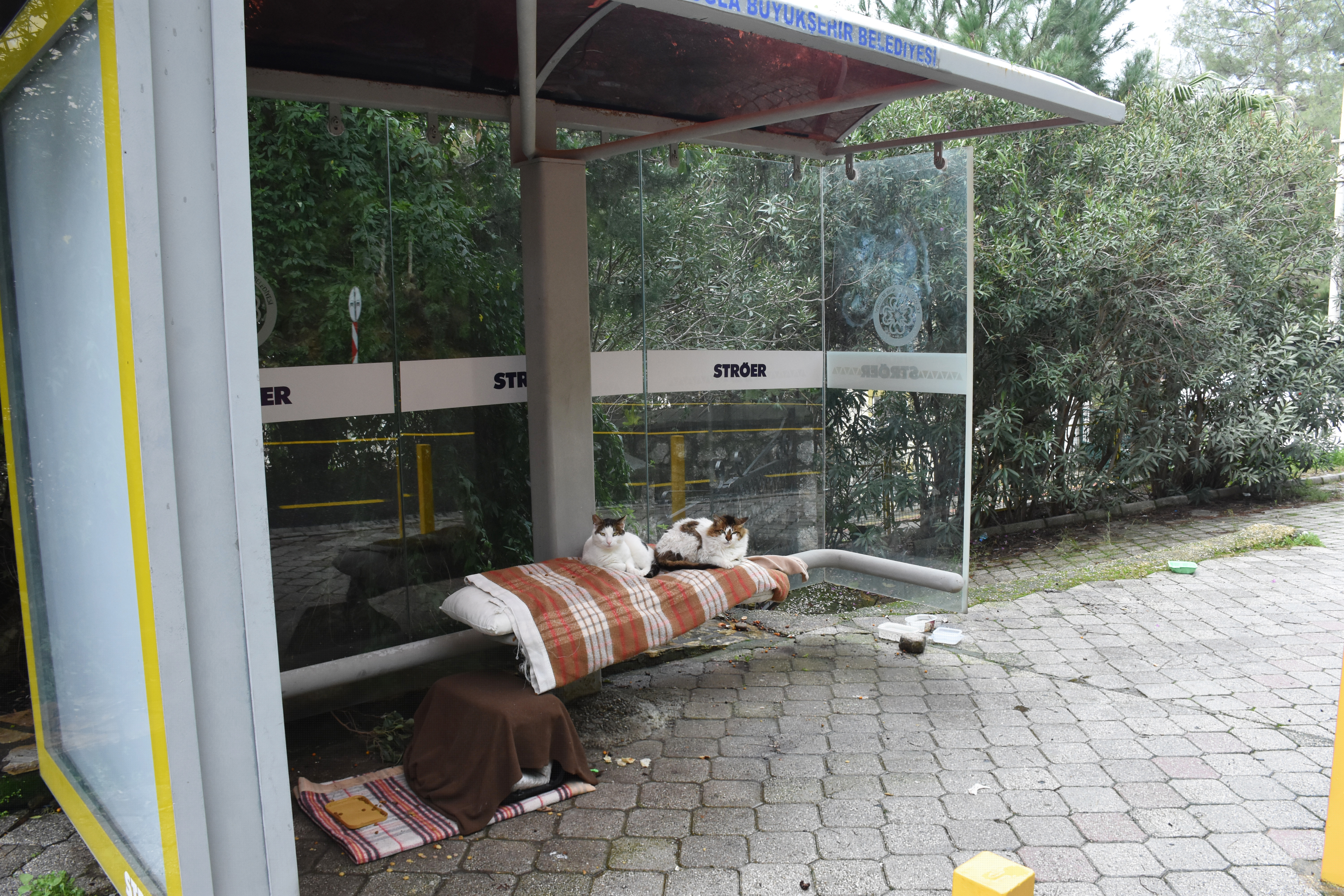 Muğla'nın Marmaris ilçesinde bir apartmanın sakinleri, dolmuş durağına sokak kedileri için yastık, battaniye, mama ve su bıraktı.