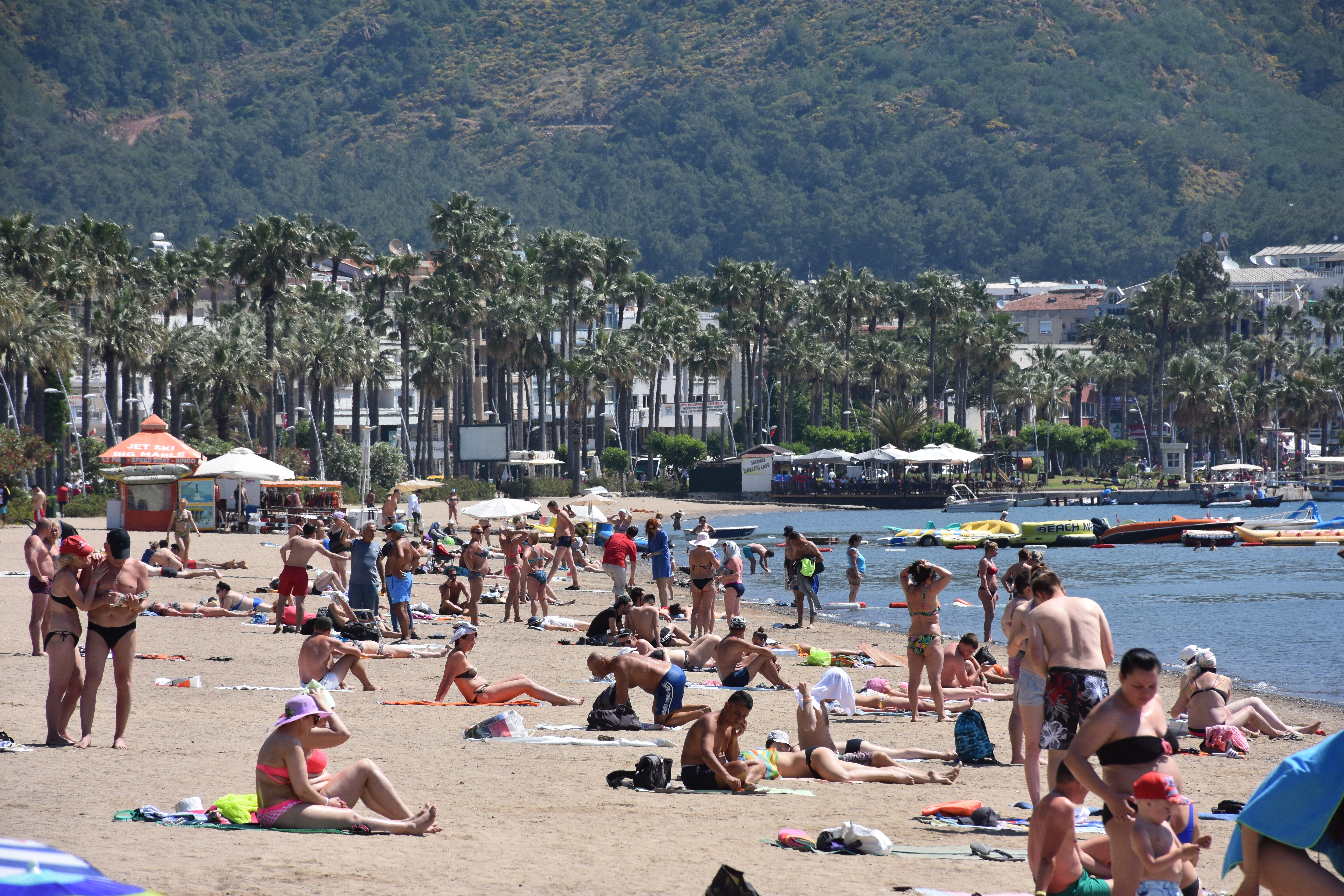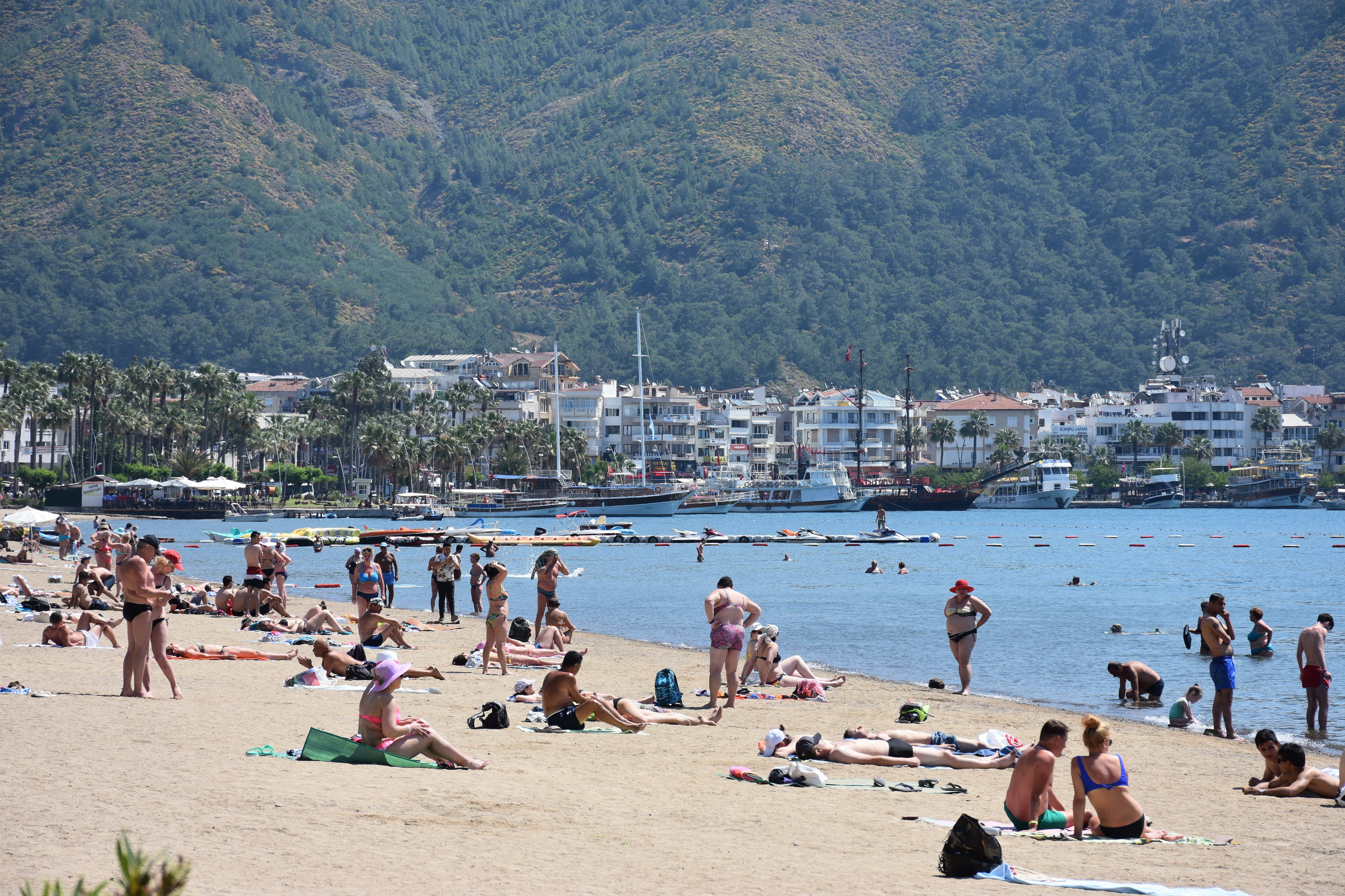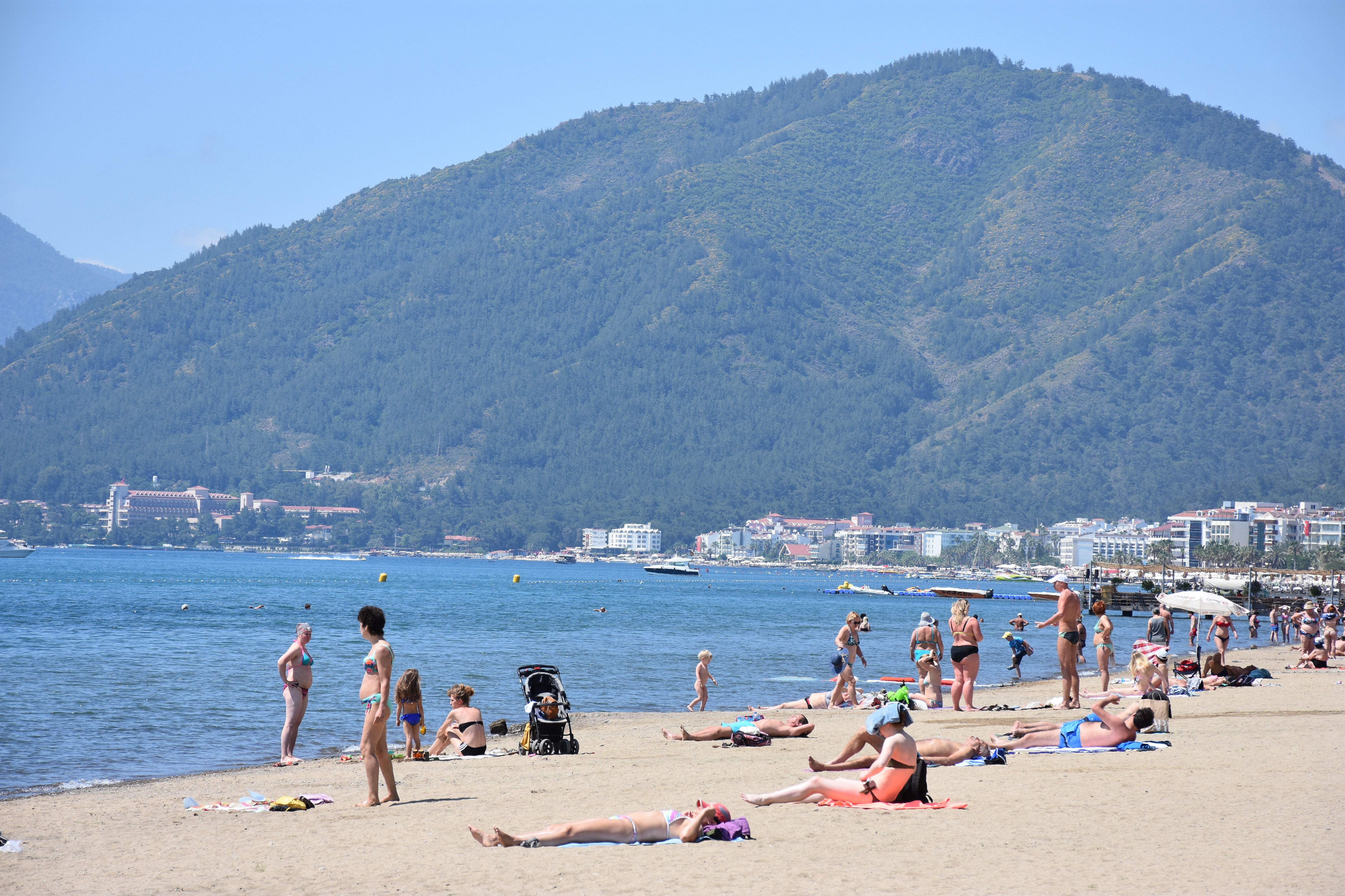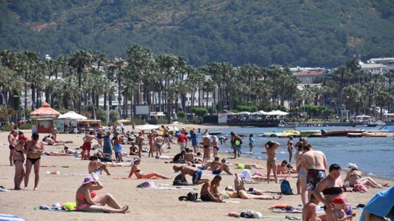 Hava sıcaklığının 27, deniz suyu sıcaklığının 20 derece ölçüldüğü Marmaris'te tatilciler sıcak havayı fırsat bilerek denize girdi, plajda güneşlendi.