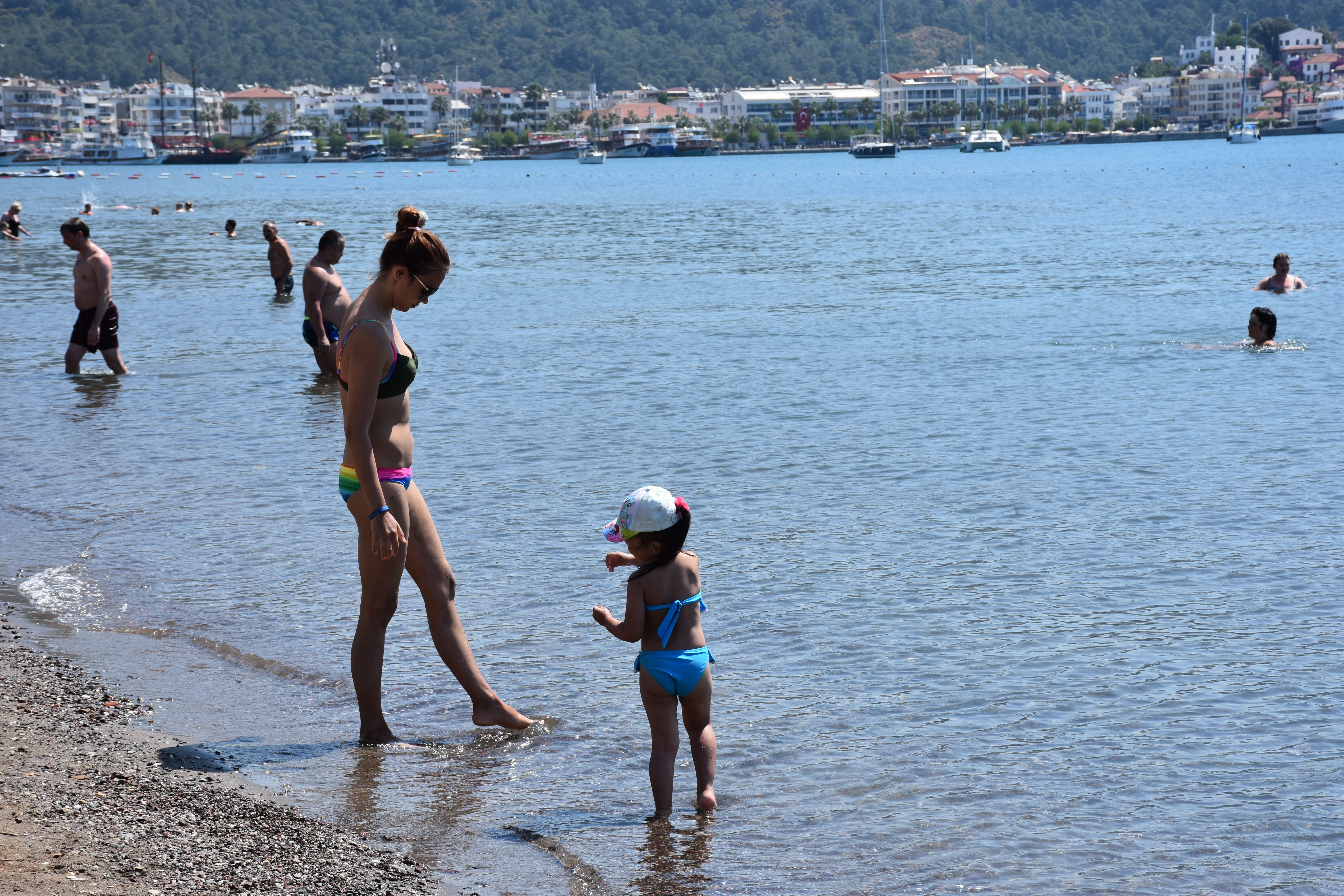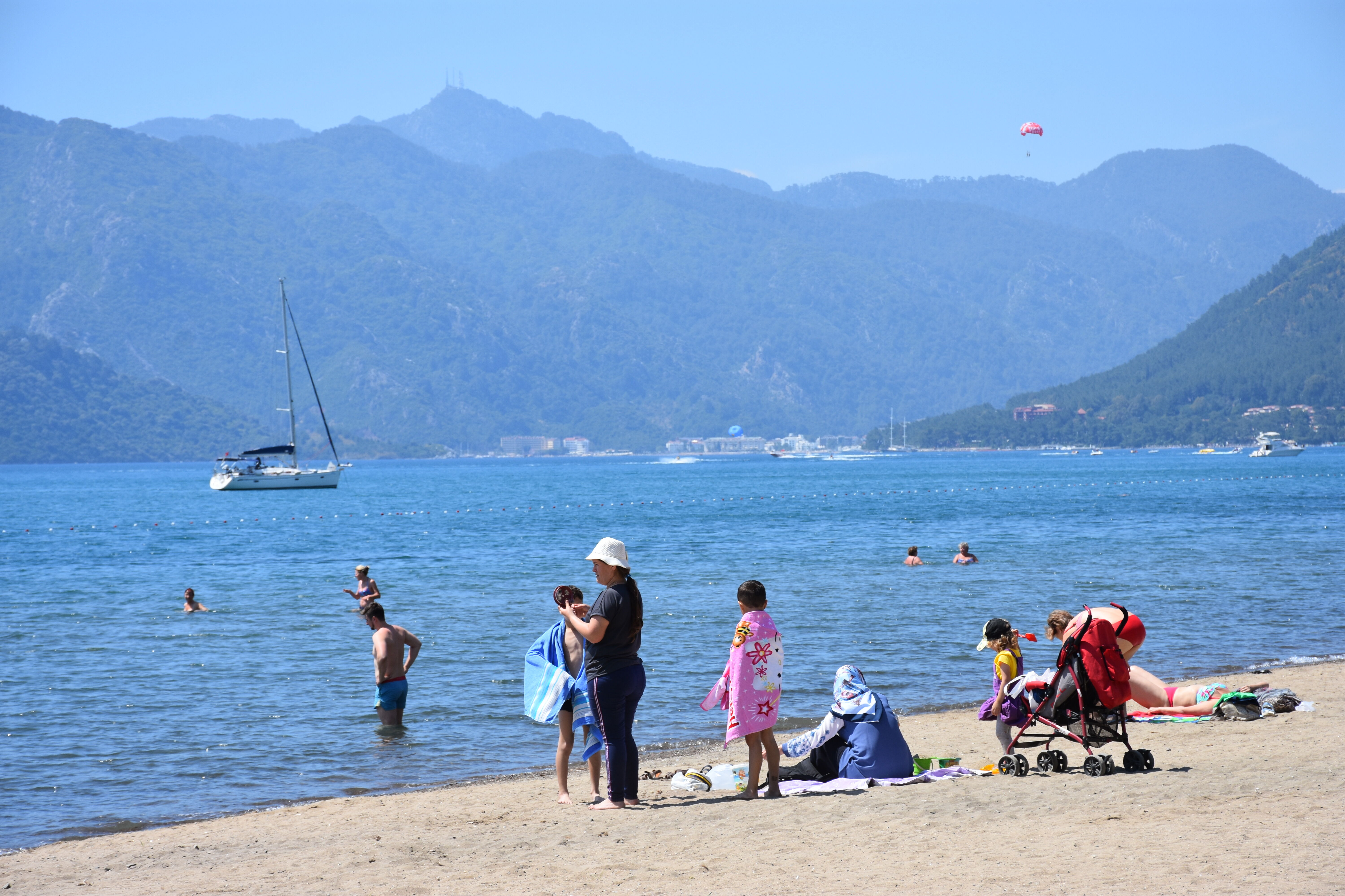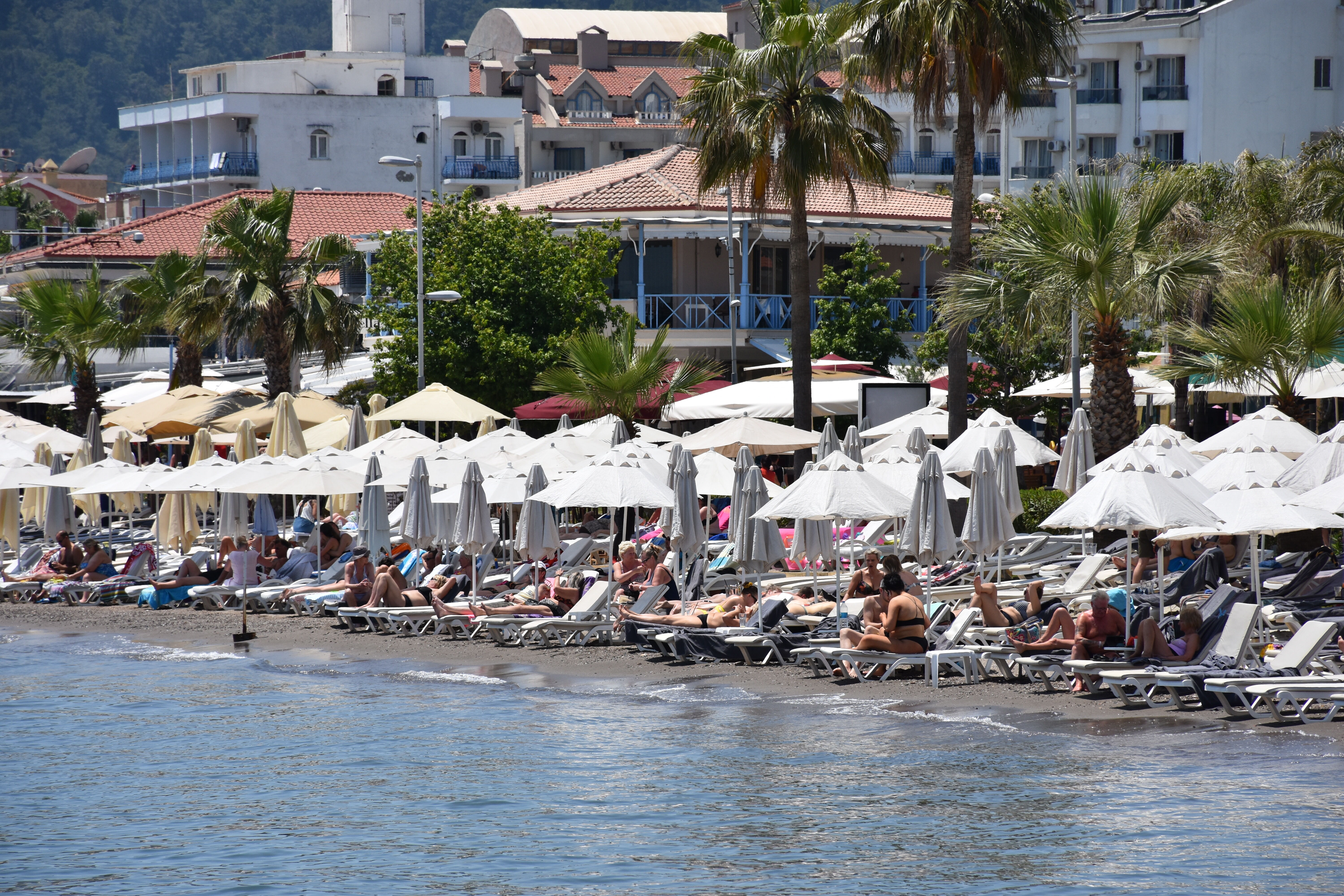 Hava sıcaklığının 27, deniz suyu sıcaklığının 20 derece ölçüldüğü Marmaris'te tatilciler sıcak havayı fırsat bilerek denize girdi, plajda güneşlendi.