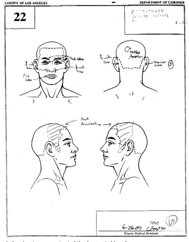Jackson’ın kafa derisine bakıldığında, tepe noktasında pek çok yara izi olduğunu söyleyen dedektifler, şarkıcının kafa derisindeki tamamen kelleşen noktalarda dövme yer aldığını açıkladı.